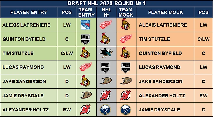Ниже таблица с выбором в 2020 году. Светло-зелёным выделены реальные выборы, серым места в чемпионате, коралловым условный драфт игроков если бы выбор происходил как указано выше, без допущений здесь не обойтись. Мы видим большие отличия с исторической частью. Это пояснение относится и к трём другим подобным картинкам в статье.