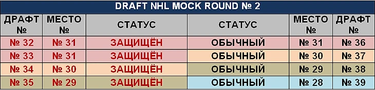 После первых четырёх защищённых выборов, всё как обычно. Продолжается отсчёт второго раунда с обычного выбора последней команды, далее до окончания второго раунда чемпионом НХЛ.