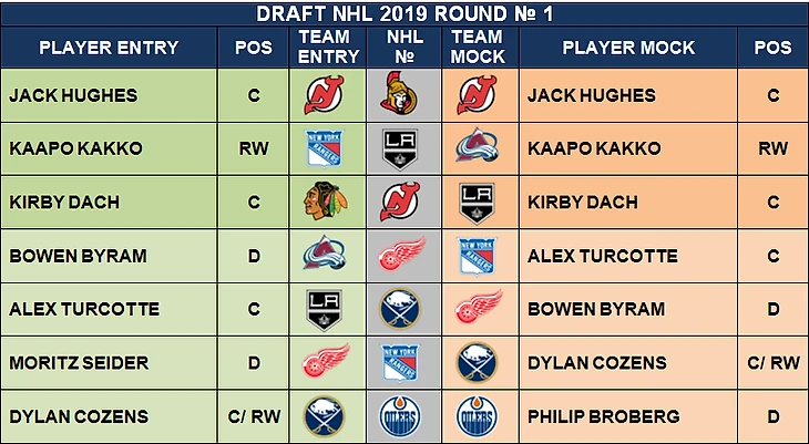 Далее таблица с выбором в 2019 году. Я предполагал везучесть Нью-Джерси и удачу Рейнджерс во втором розыгрыше лотереи. Хьюз достался бы Джерси, Какко Колорадо, Рейнджерс Тюркотт или Дач в зависимости от выбора ЛАК.