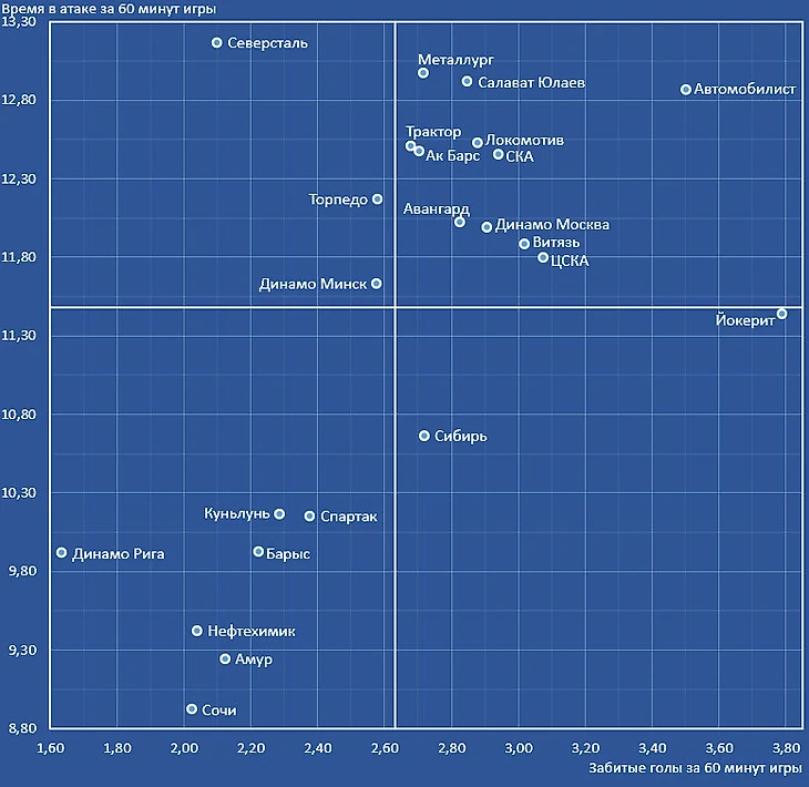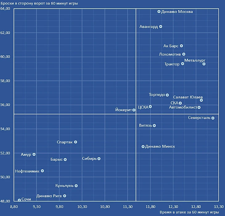 График позволяет наглядно представить стиль игры команд КХЛ. За центральные осевые линии взяты средние значения по лиге.