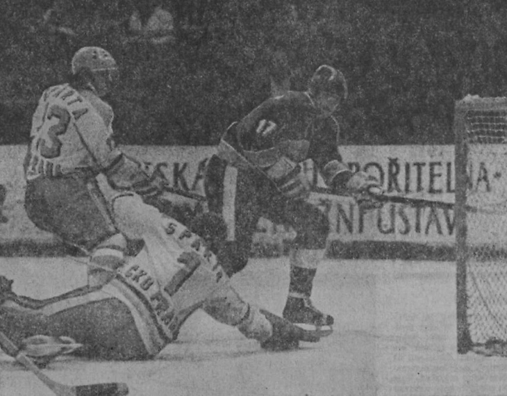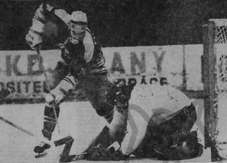 1986/87. «Польди» (Кладно) играет с командой «Слезан», представляющей одноименную машинно-тракторную станцию (форма сельхозпредприятий) из Опавы, города в Судетских горах Чешской Силезии (в 1938-45 Судетская Силезия) - 4:2. До Второй мировой войны город назывался Троппау. В первой трети прошлого века в нем был третий по величине в Центральной Европе, после Вены и Будапешта, каток с естественным льдом и играла на нем одна из сильнейших немецких команд Чехословакии Troppauer EV (приняла участие в первых двух розыгрышах чехословацкой лиги, состоявшихся до германской аннексии Судет, а ее игроки входили в состав чехословацкой сборной)