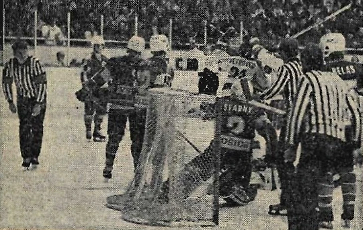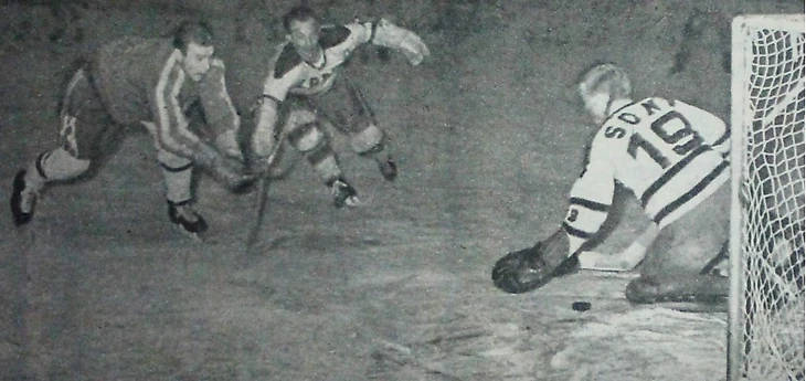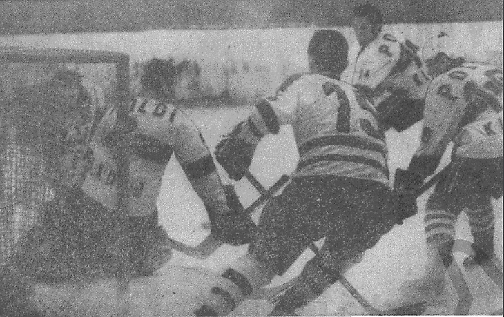1962/63. СОНП (Кладно) - ЗКЛ (Брно). Ворота кладненцев атакует Ярослав Иржик