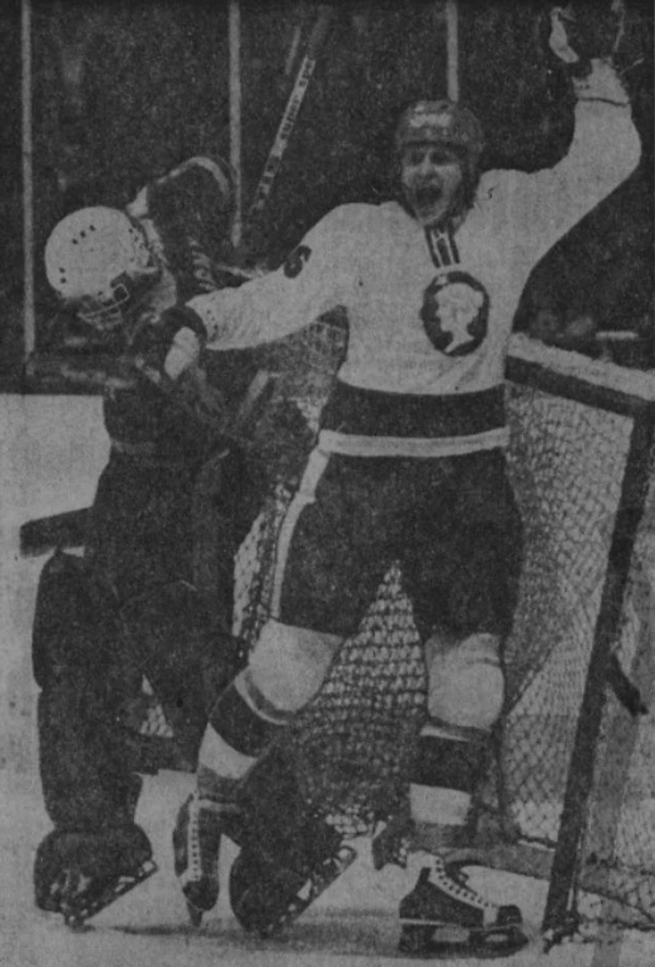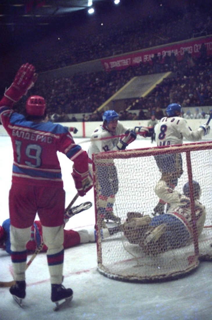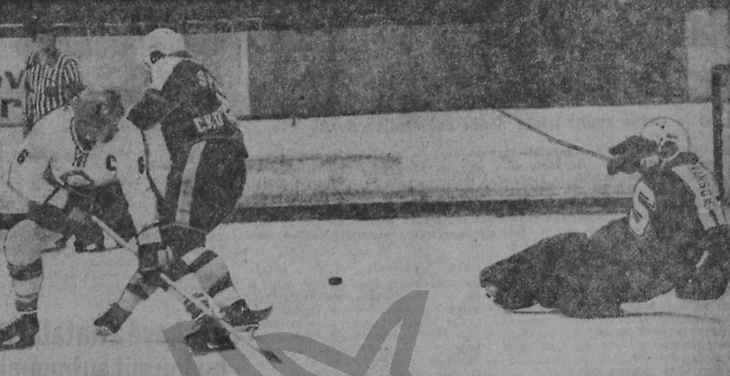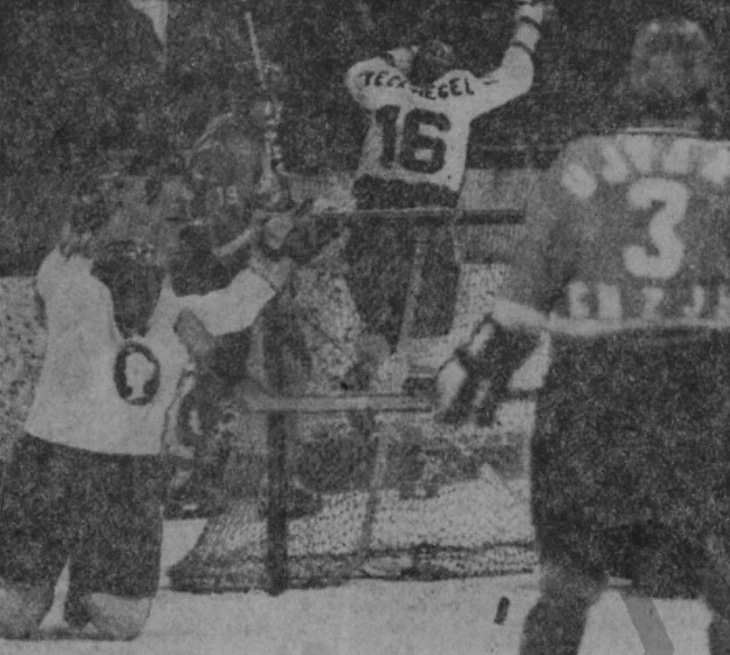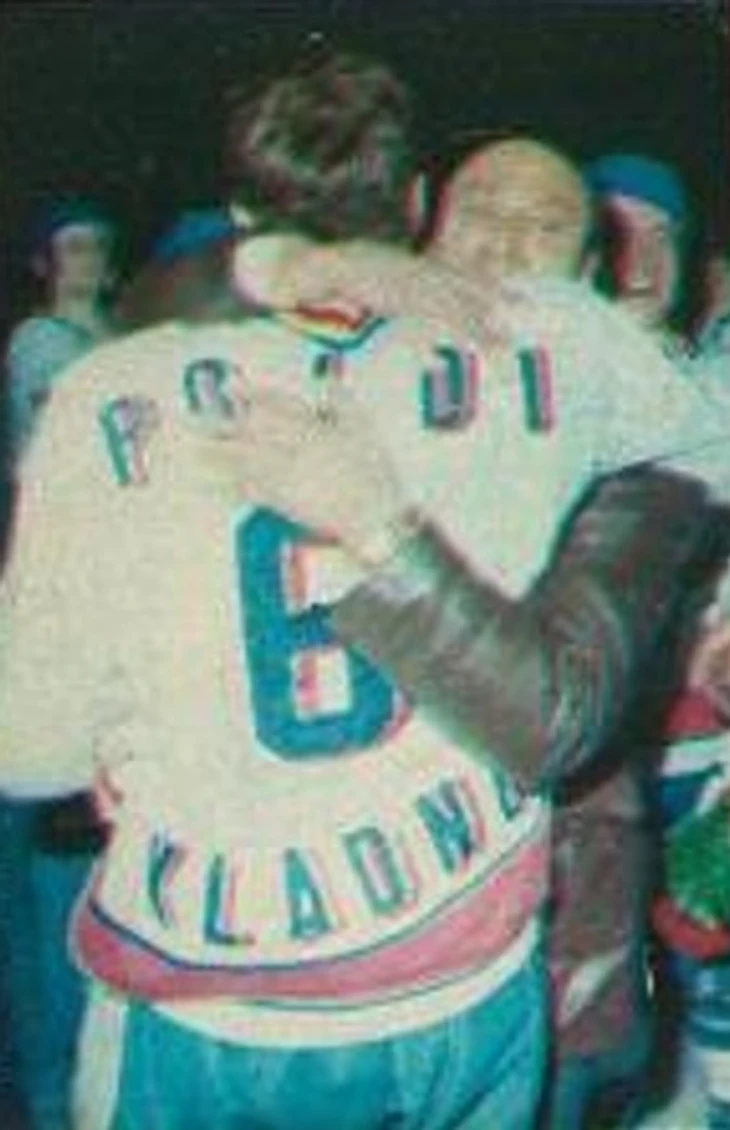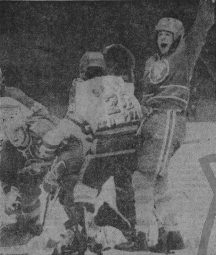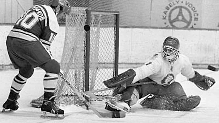 13 февраля 1979 года. Кладно. Кубок европейских чемпионов. «Польди» (Кладно) - «Спартак» (Москва) - 4:4 (по буллитам 2:1) Радость Мирослава Красы, допустившего в ходе матча ошибку, позволившую сопернику сравнять счет, после окончания серии буллитов, закончившейся на третьем игроке спартаковцев (2:1)