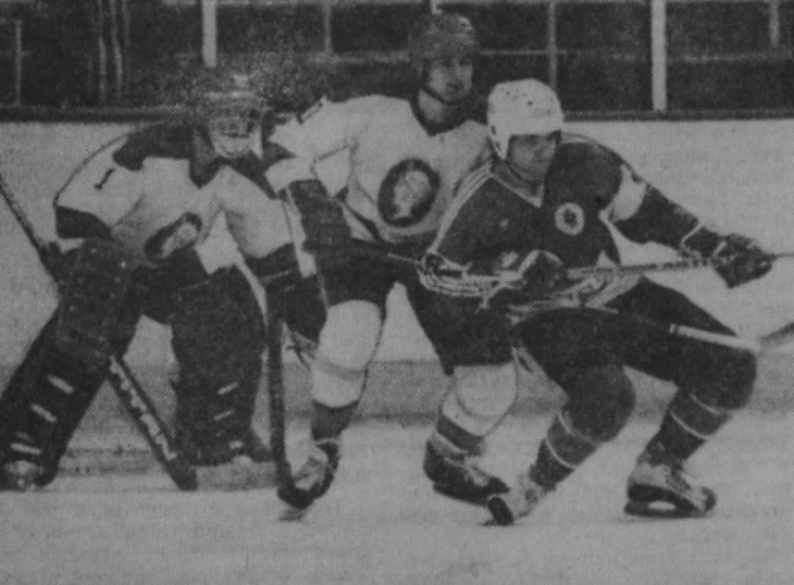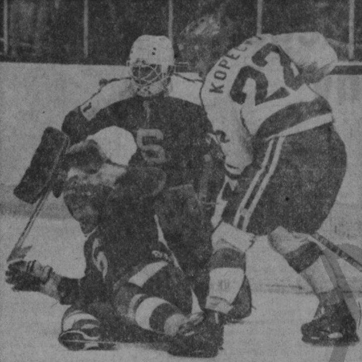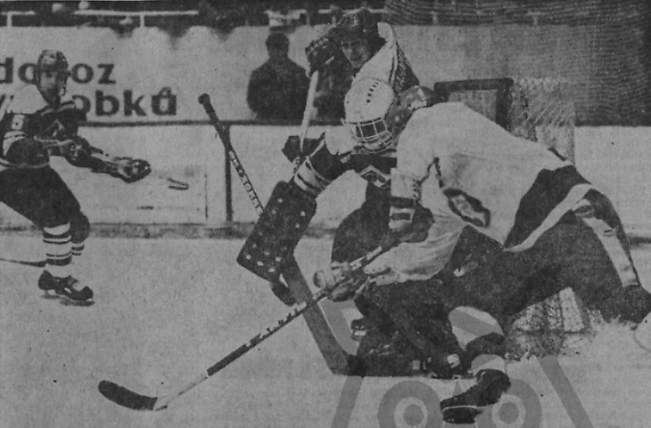 14 марта 1988 года. Кладно. Полуфинальная серия за звание чемпиона ЧССР. Третий матч. «Польди» (Кладно) - ВСЖ (Кошице) - 3:6. Милан Дудачек (№ 1), Петр Лхотски (№ 10) и Петр Бондра