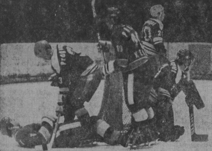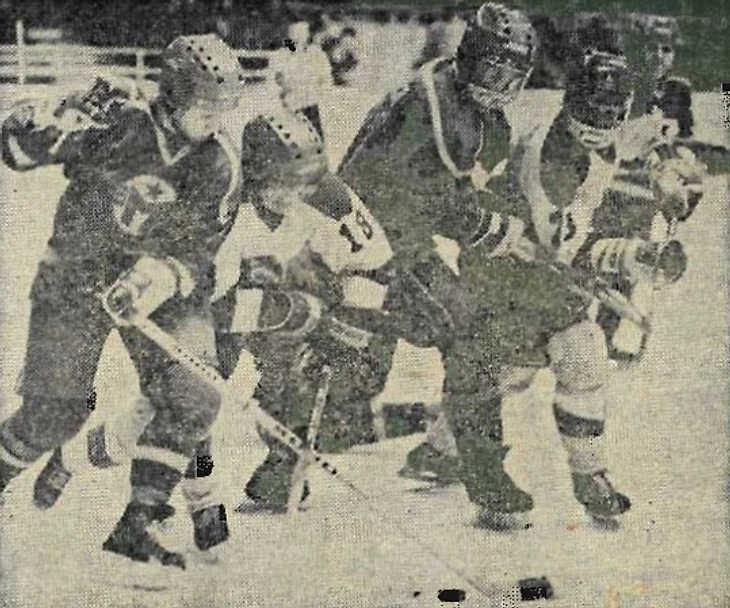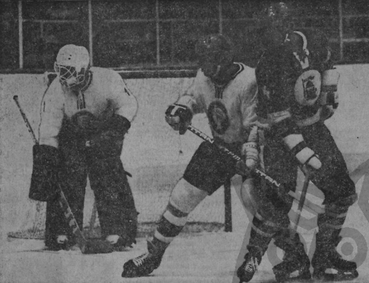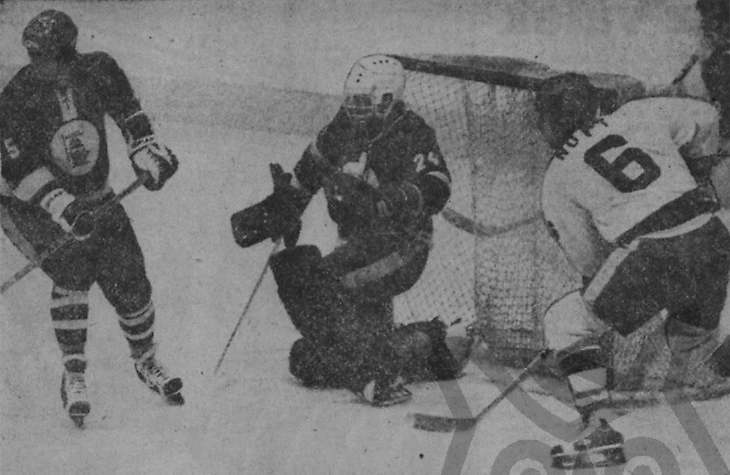 12 марта 1976 года. Парбудице. «Тесла» (Парбудице) - СОНП (Кладно) - 2:6. Иржи Новак (слева), Антонин Мелч (№ 21) и Мирослав Краса (№ 20)