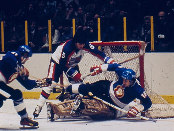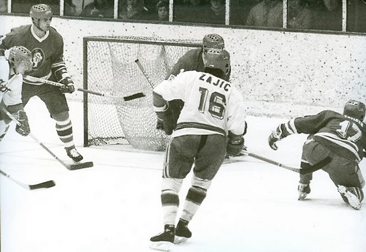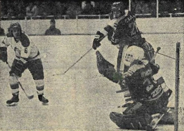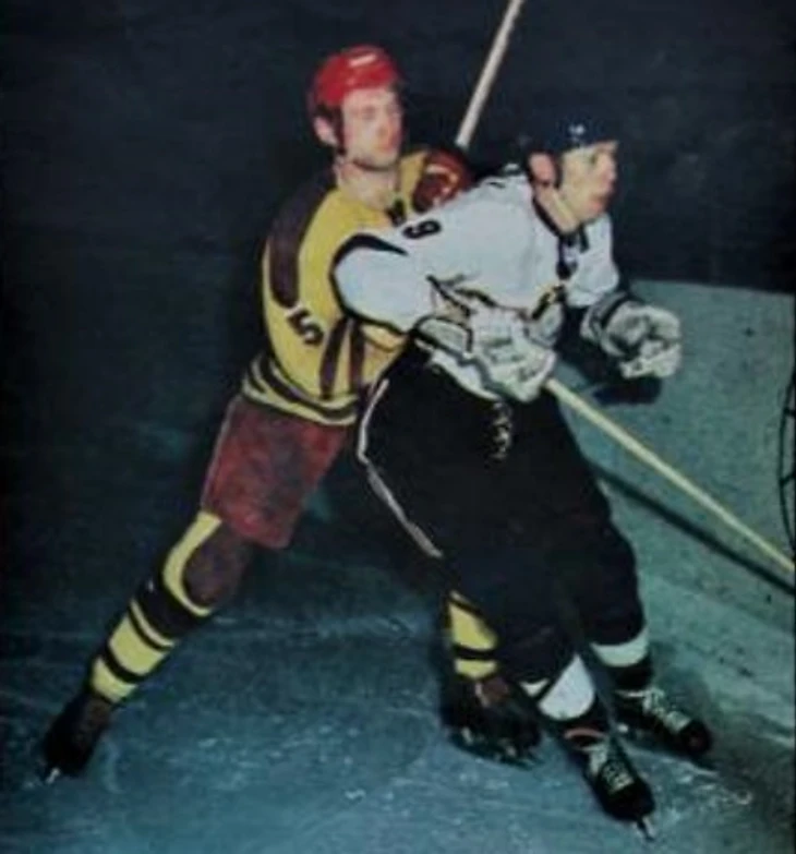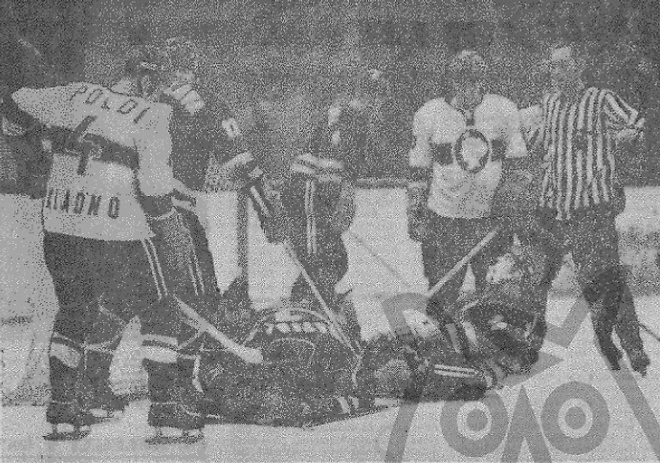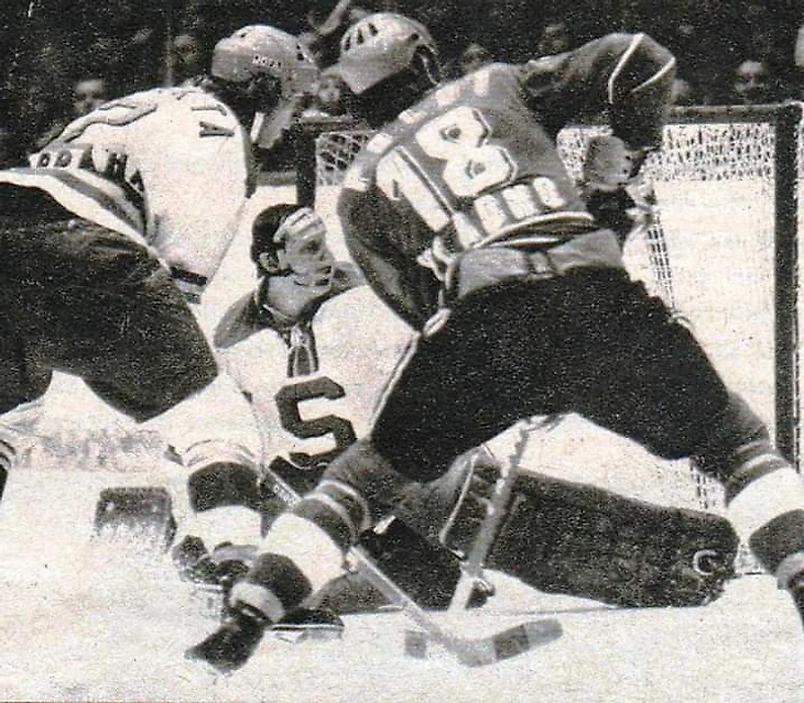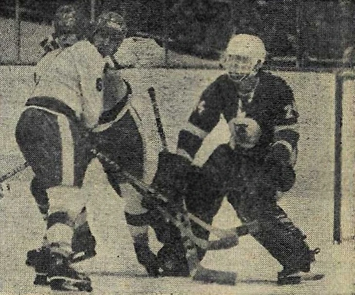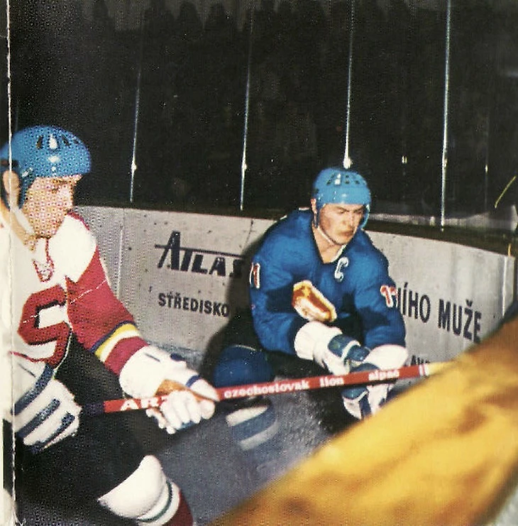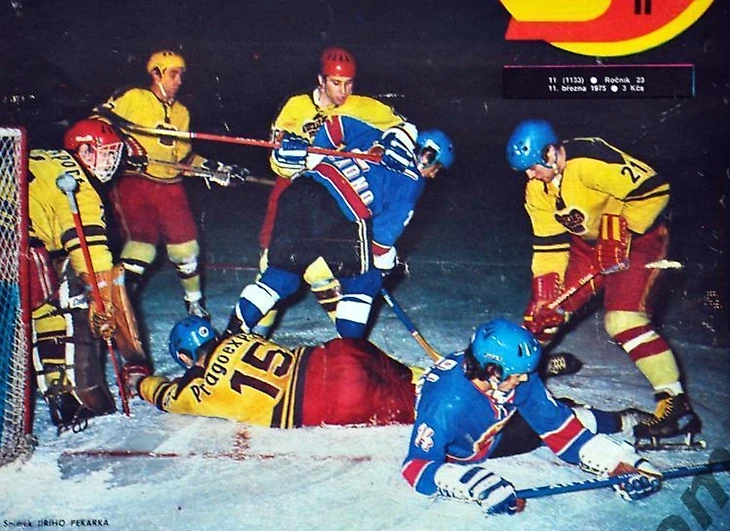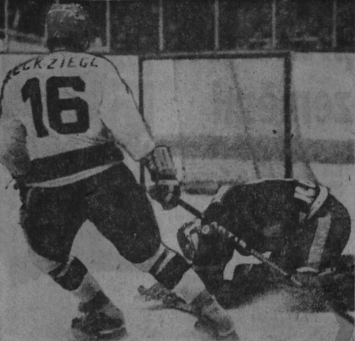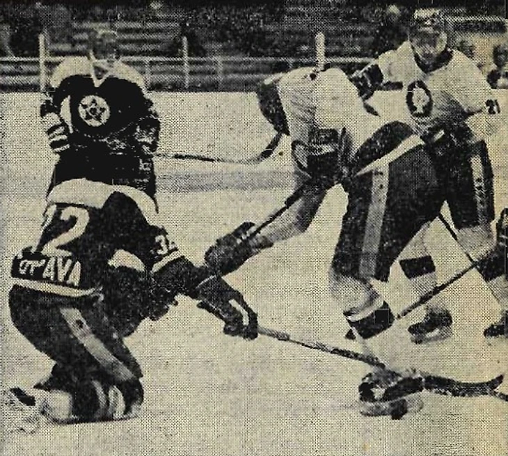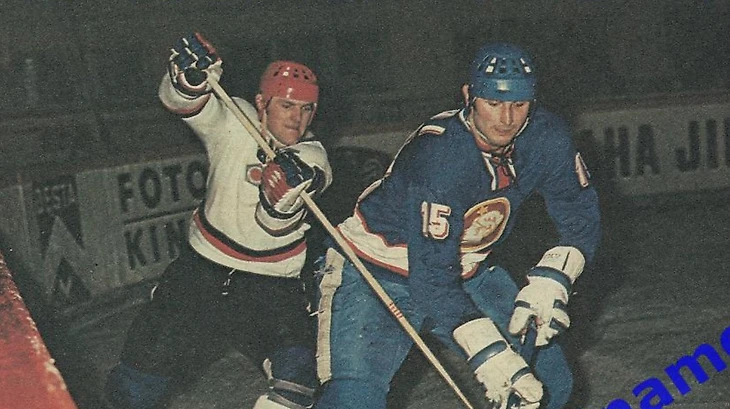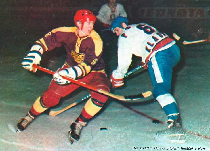 1972-73. СОНП (Кладно) - «Дукла» (Йиглава). Зденек Грабе (№ 9) против армейца Ярослава Холика (№ 5). С 1976 по 2002 годы Грабе директором домашней арены кладненцев