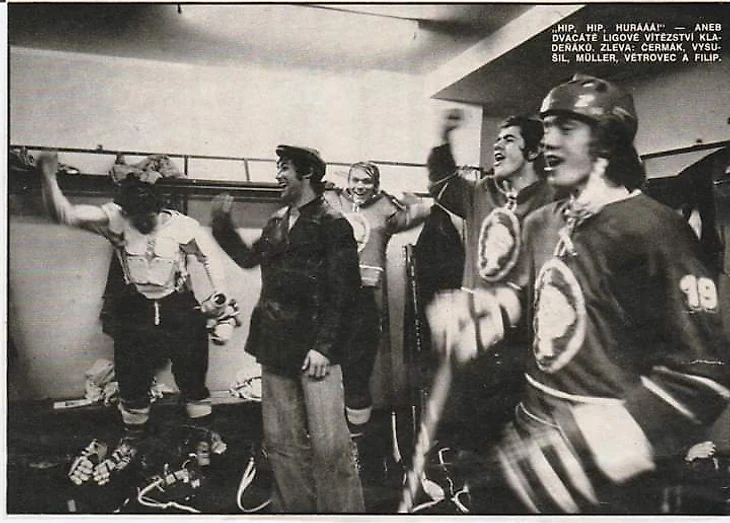 1974/75. СОНП (Кладно). Ликующая раздевалка: Богумил Чермак, Ладислав Высушил, Зденек Мюллер, Франтишек Ветровец и Иржи Филип