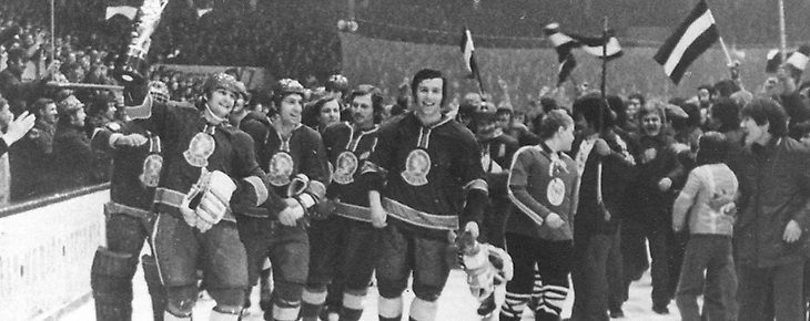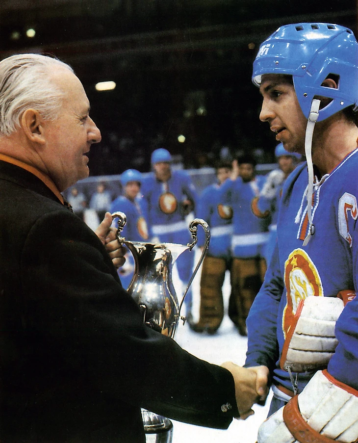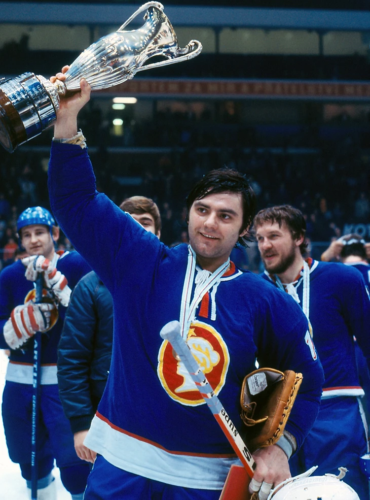 13 апреля 1980 года. Прага. Милан Новы принимает чемпионский кубок из рук председателя Чехословацкого хоккейного союза Зденека Андршта