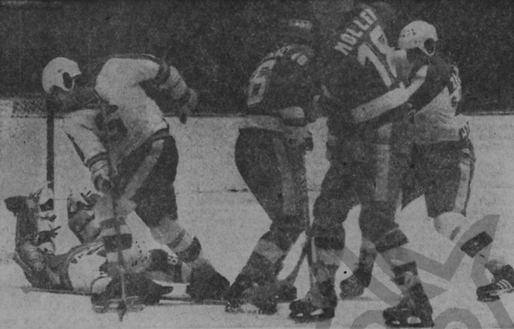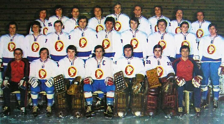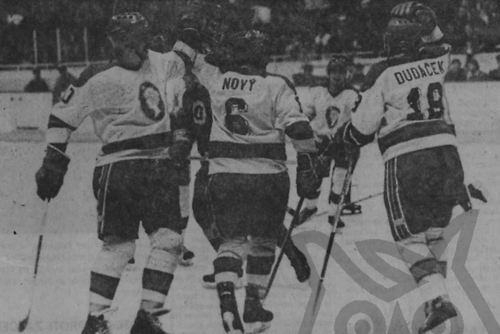 16 марта 1976 года. Кладно. СОНП (Кладно) - «Дукла» (Йиглава) - 3:1. Эдуард Новак (лежит), Любомир Уйвари (№ 3), Зденек Недвед (№ 10), Иржи Холик (№ 20) и Петр Брокеш (№ 1)