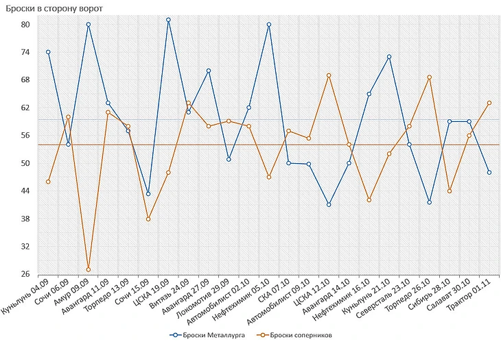 Похожая ситуация и с бросками. При том, что средний показатель по лиге - 55 бросков за игру, Металлург в большинстве своих матчей уверенно преодолевал эту отметку.