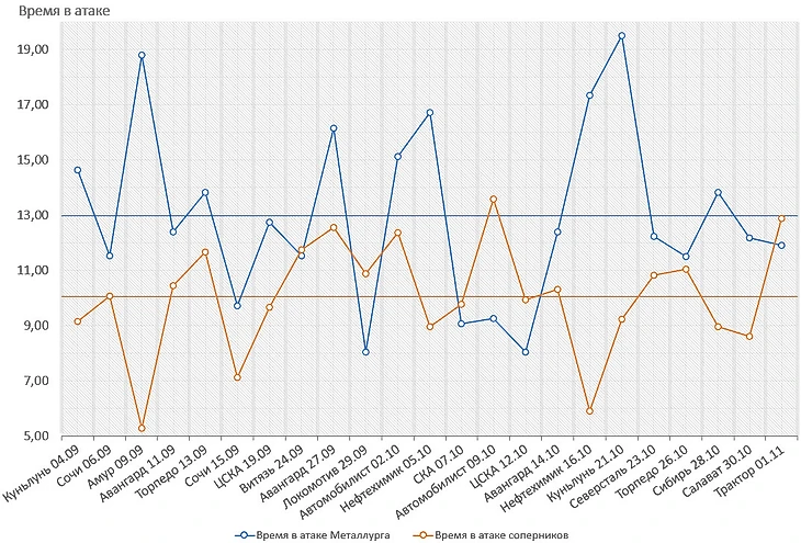 К созданию этого поста меня подтолкнул ранее опубликованный материал с довольно интересным фактом - Металлург является второй командой лиги по среднему времени, проведенному в зоне атаки, а также 5-6 командой лиги по броскам в сторону ворот.