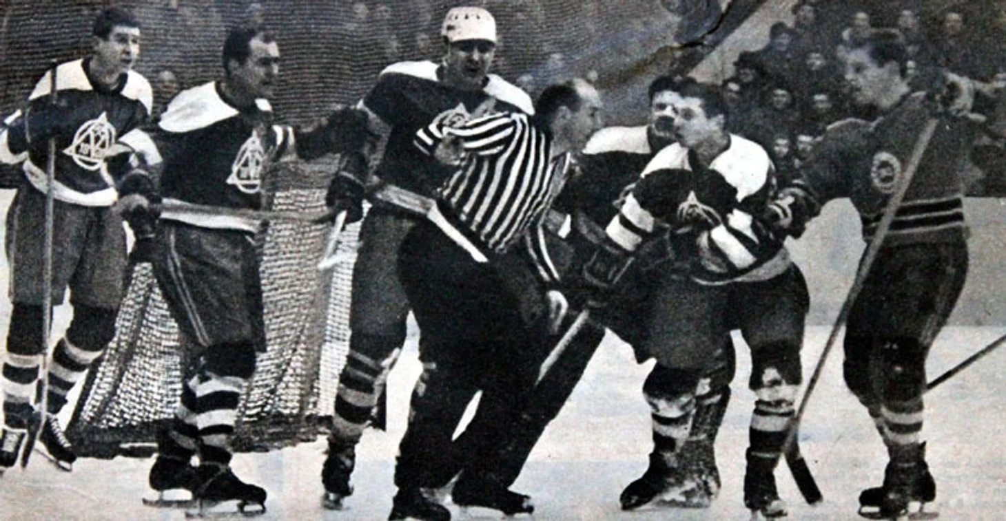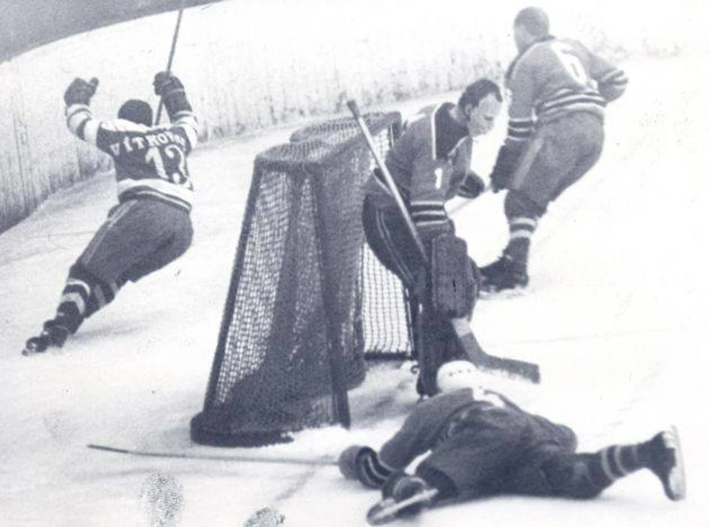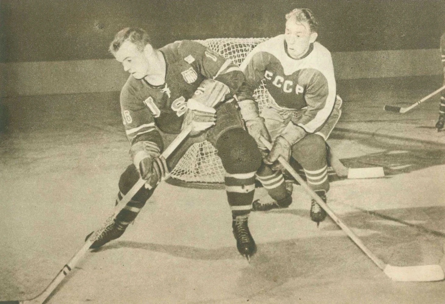 7 марта 1959 года. Брно. Национальный стадион имени Эдварда Бенеша. Чемпионат мира и Европы. Группа В. СССР - США - 5:3. Уильям Клири (№ 16) и Николай Сологубов