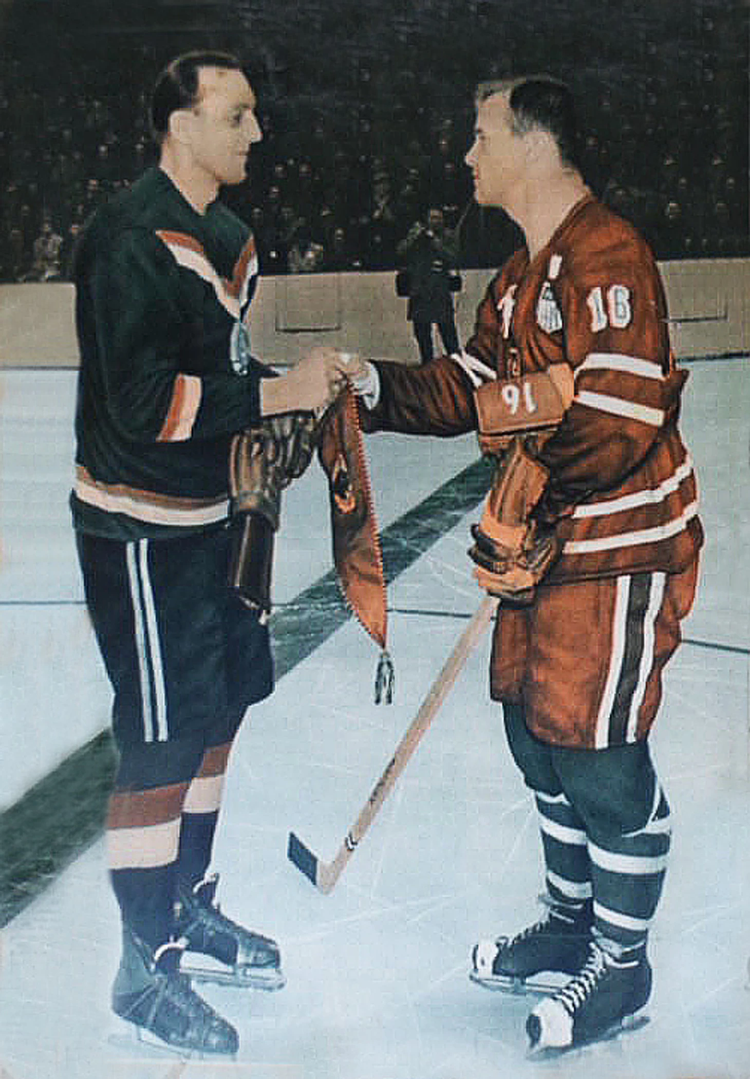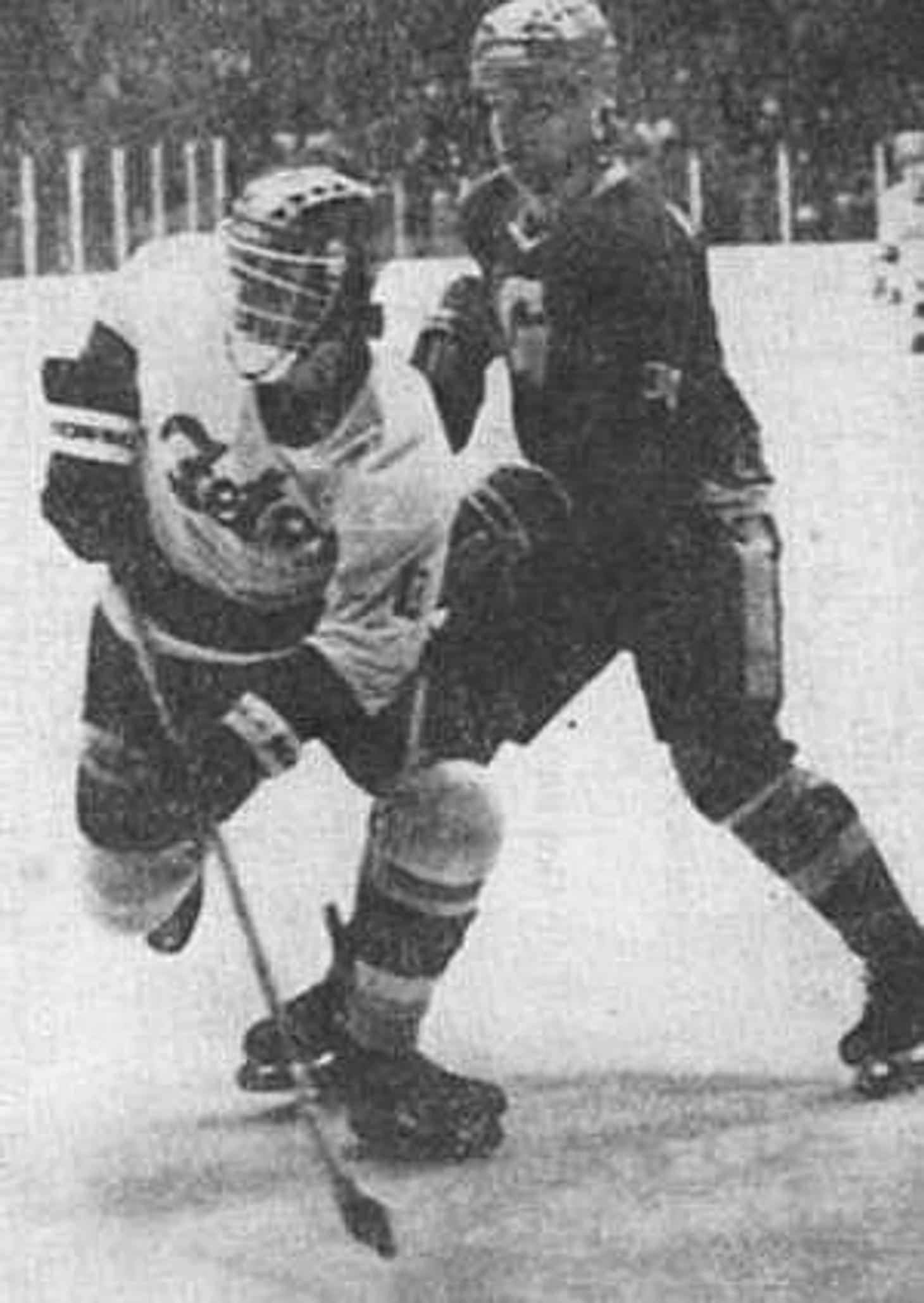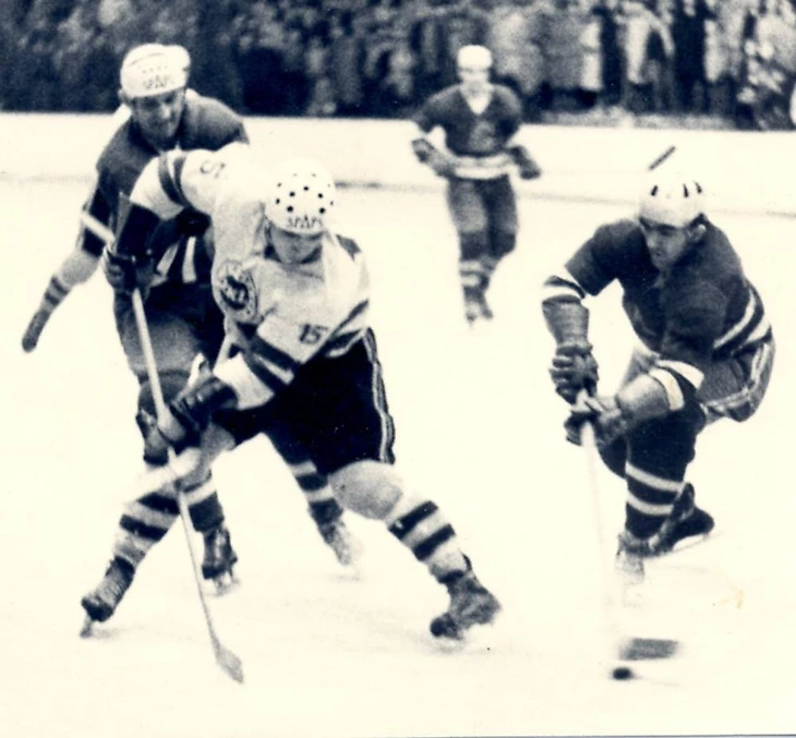 7 марта 1959 года. Брно. Национальный стадион имени Эдварда Бенеша. Чемпионат мира и Европы. Группа В. СССР - США - 5:3. Уильям Клири (№ 16) и Николай Сологубов