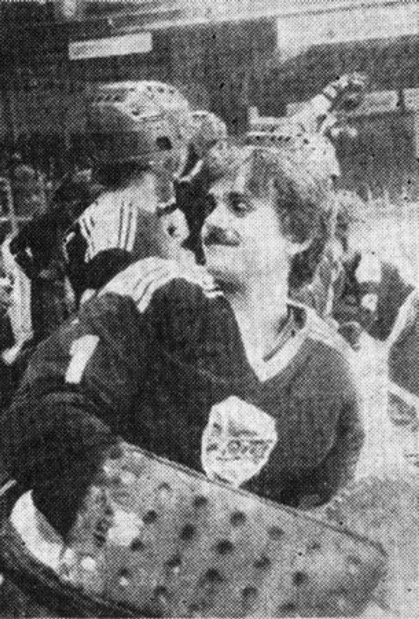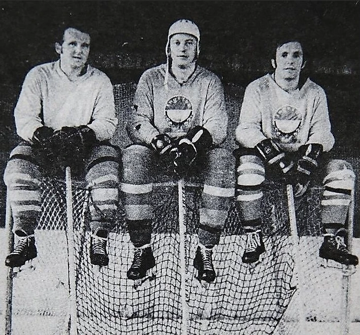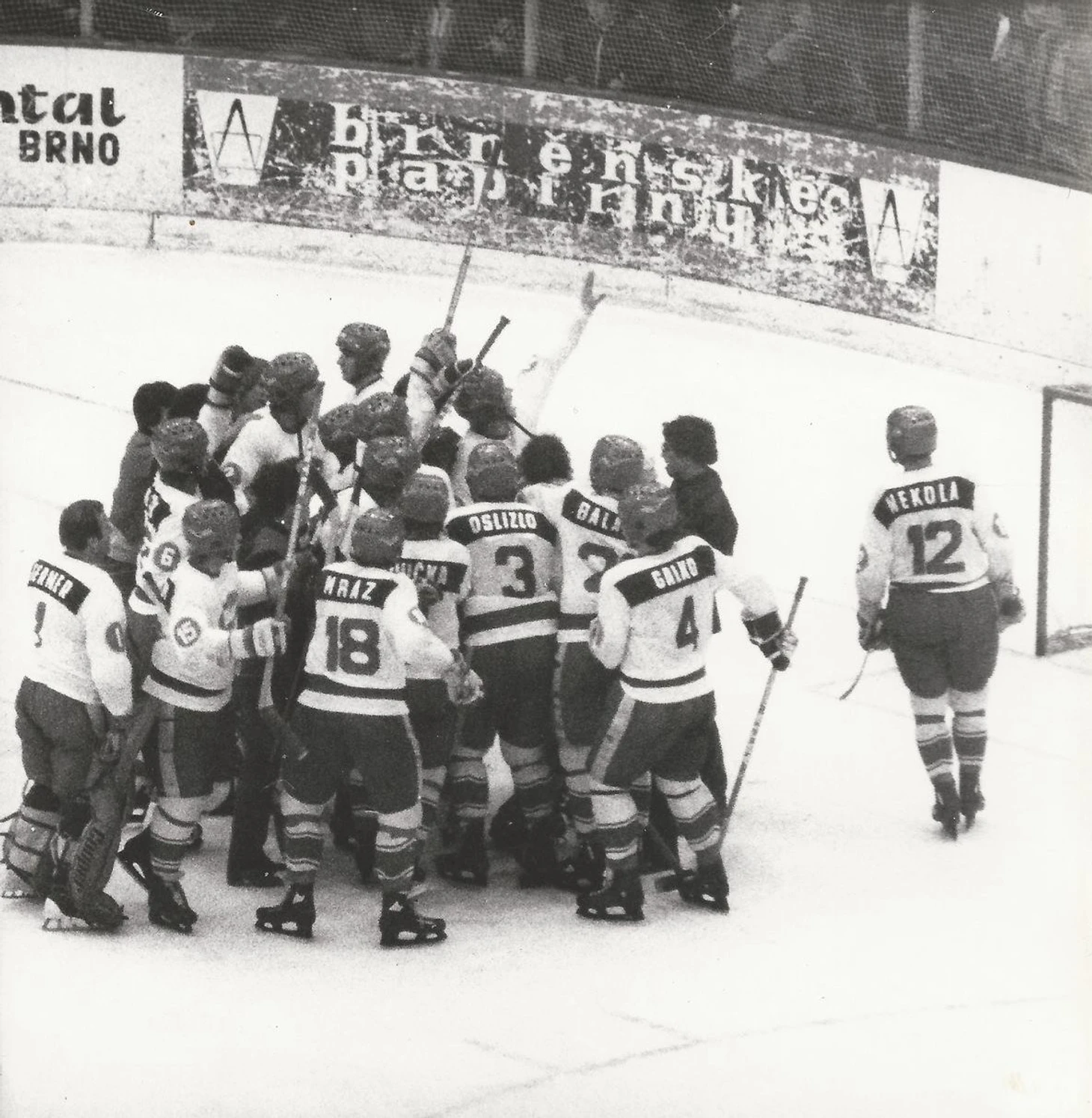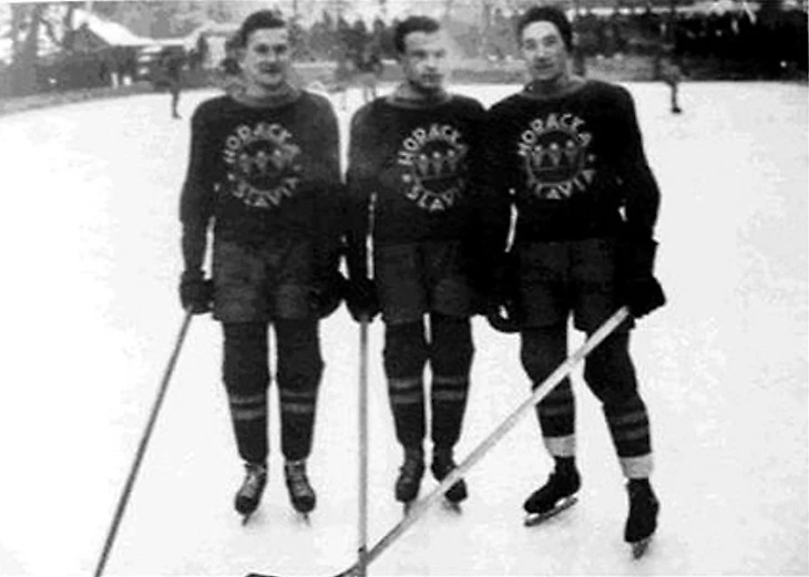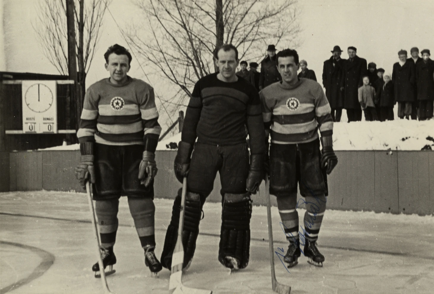 Игроки «Горацка Славии» (Тршебич) Карел Полак (первый справа) и Владимир Бузек (второй справа) после атаки: «где шайба?» (интересно, что у этой «Славии», в отличие от пражской, эмблемой служит не перевернутая звезда)