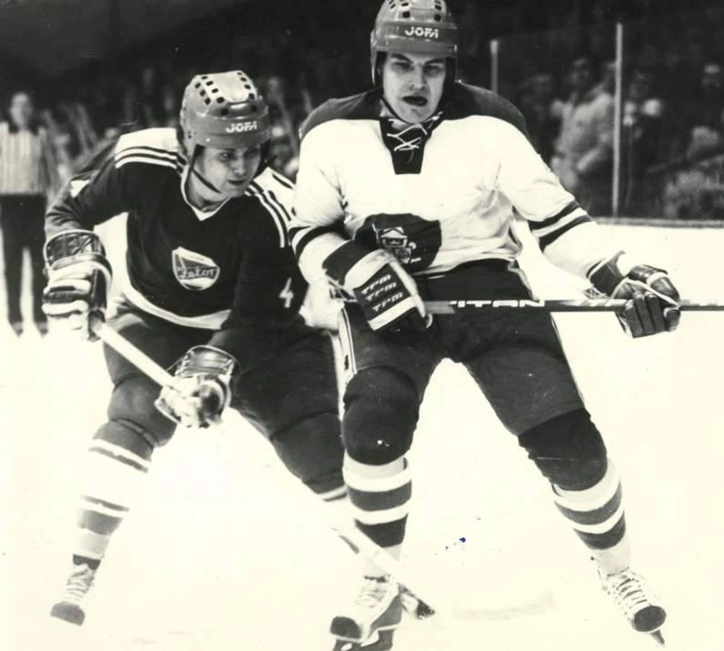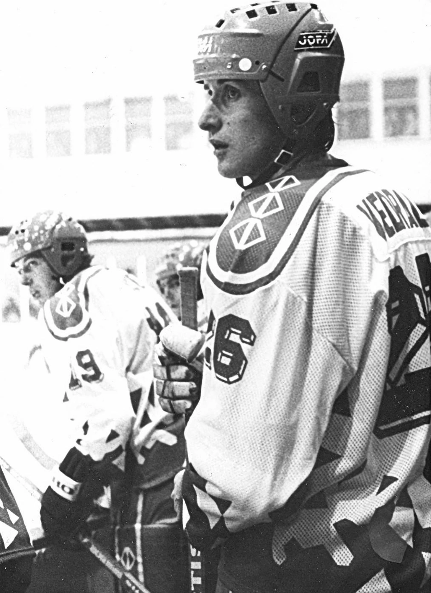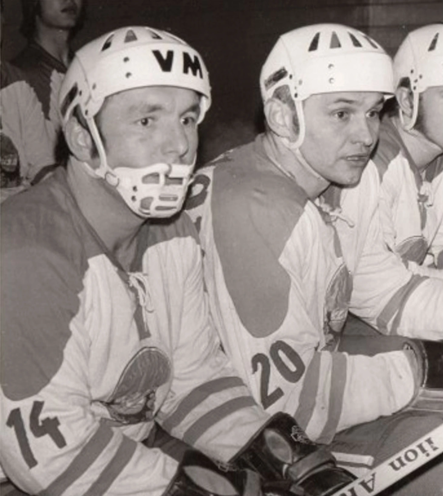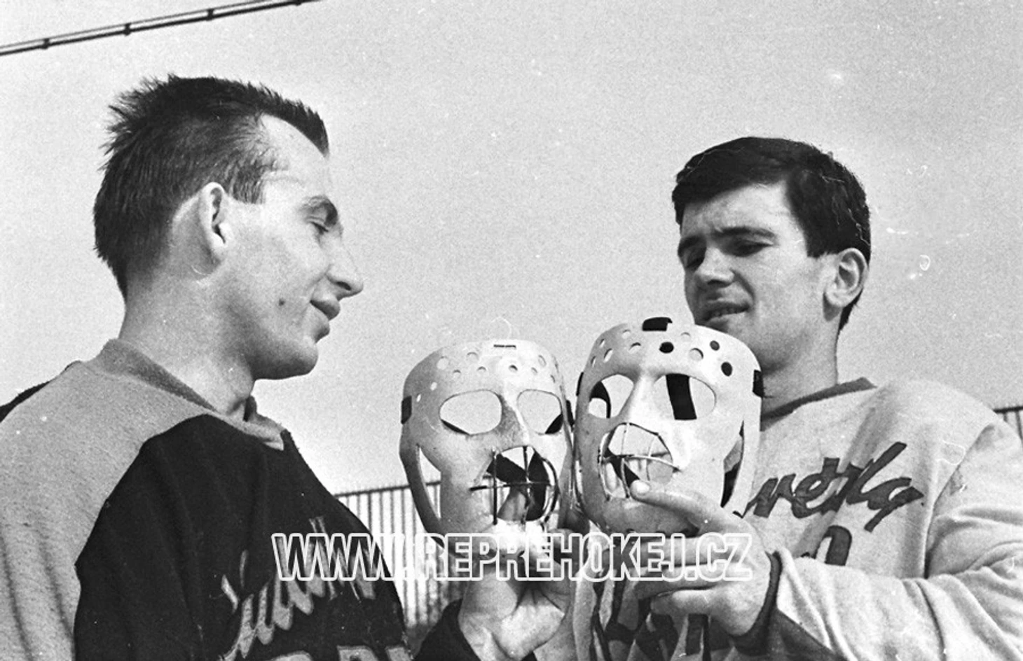 Игроки «Горацка Славии» (Тршебич) Карел Полак (первый справа) и Владимир Бузек (второй справа) после атаки: «где шайба?» (интересно, что у этой «Славии», в отличие от пражской, эмблемой служит не перевернутая звезда)