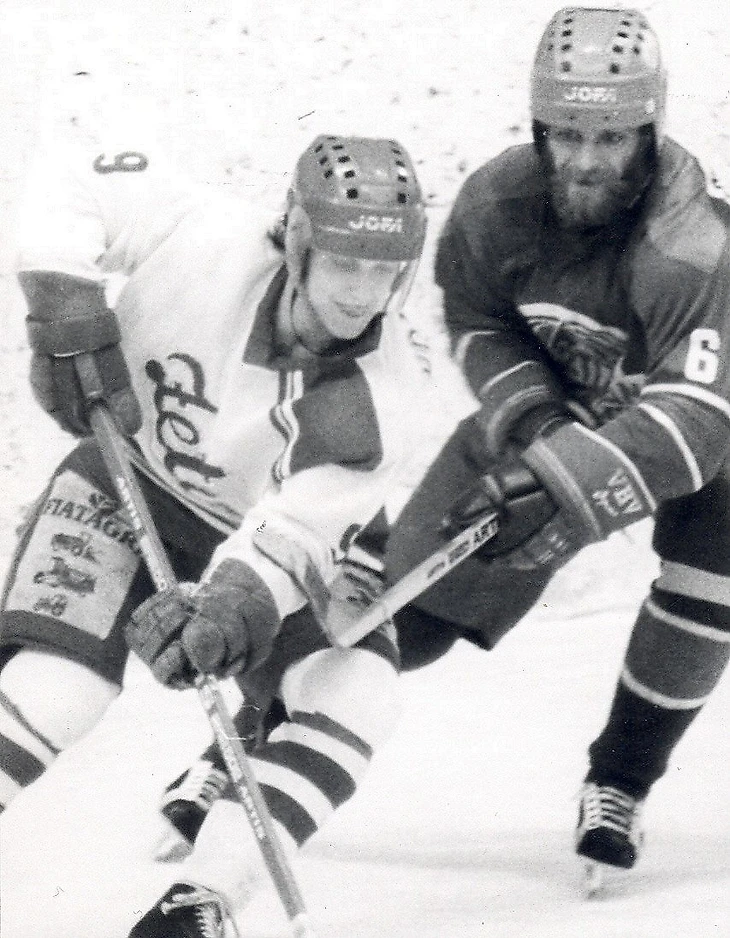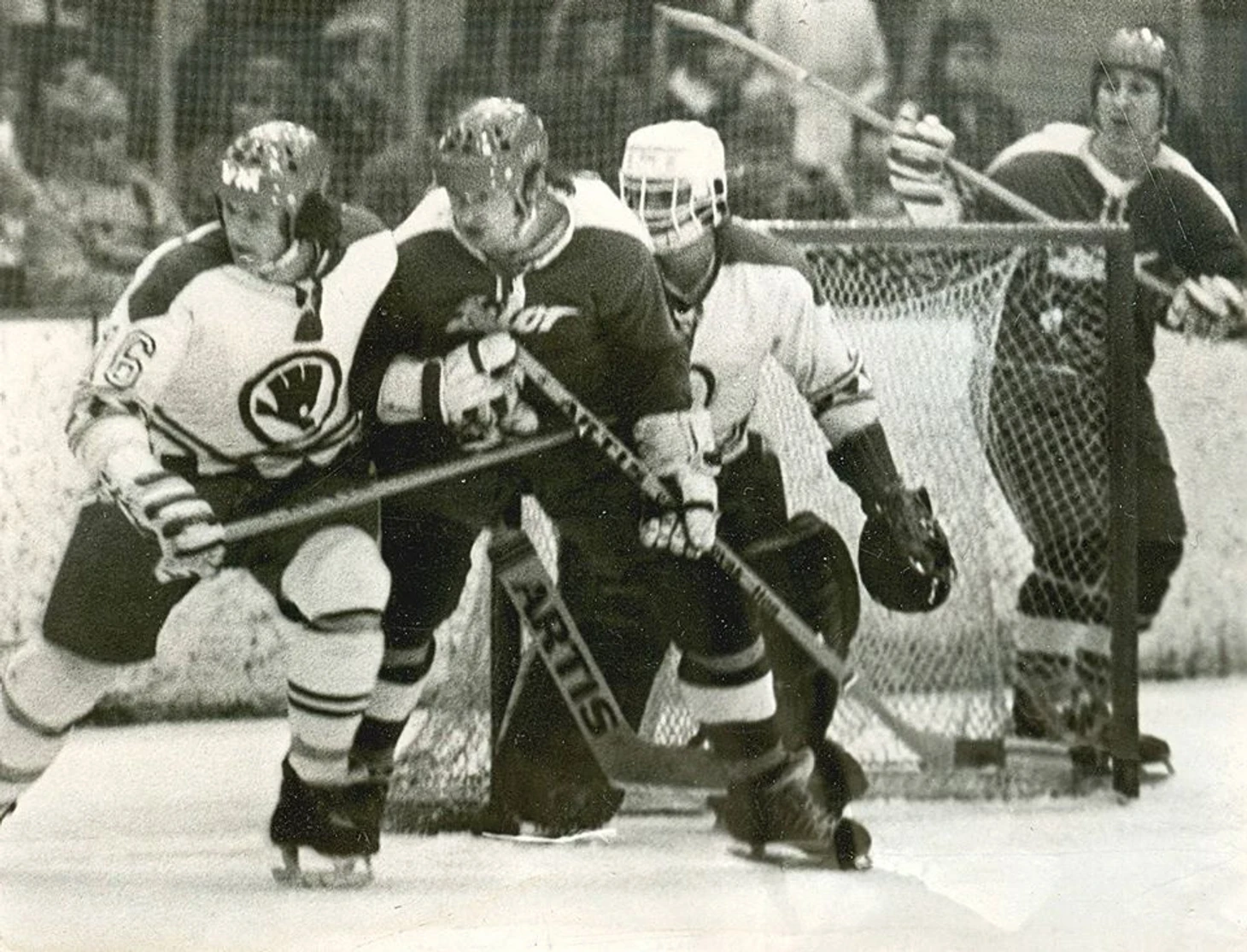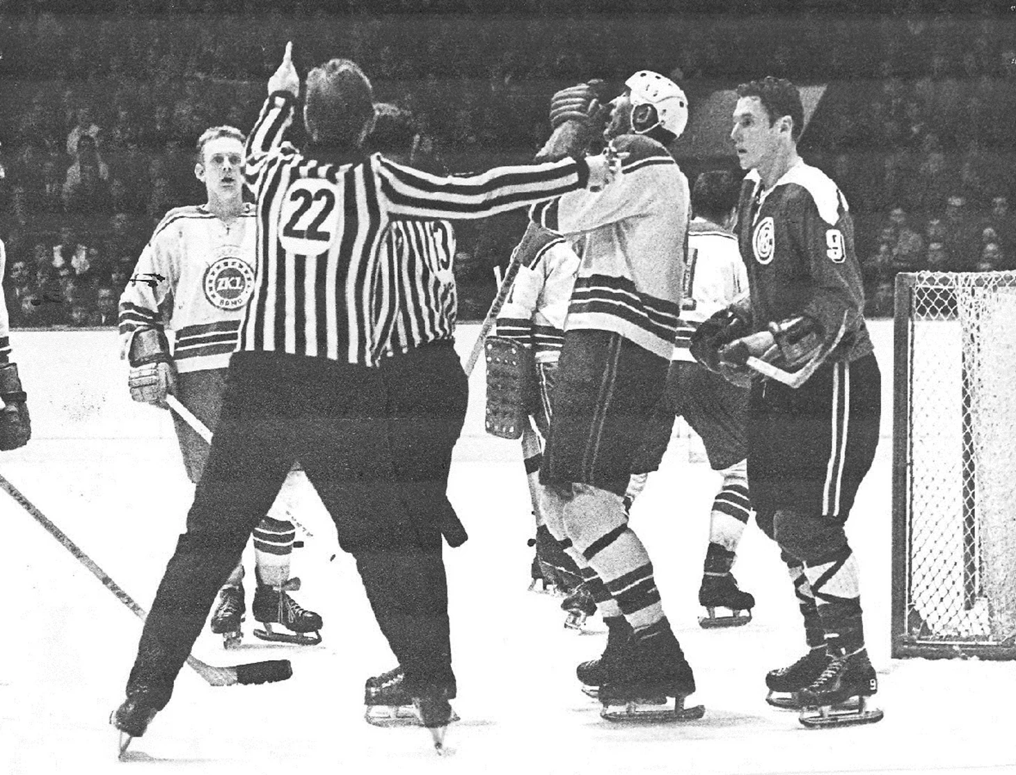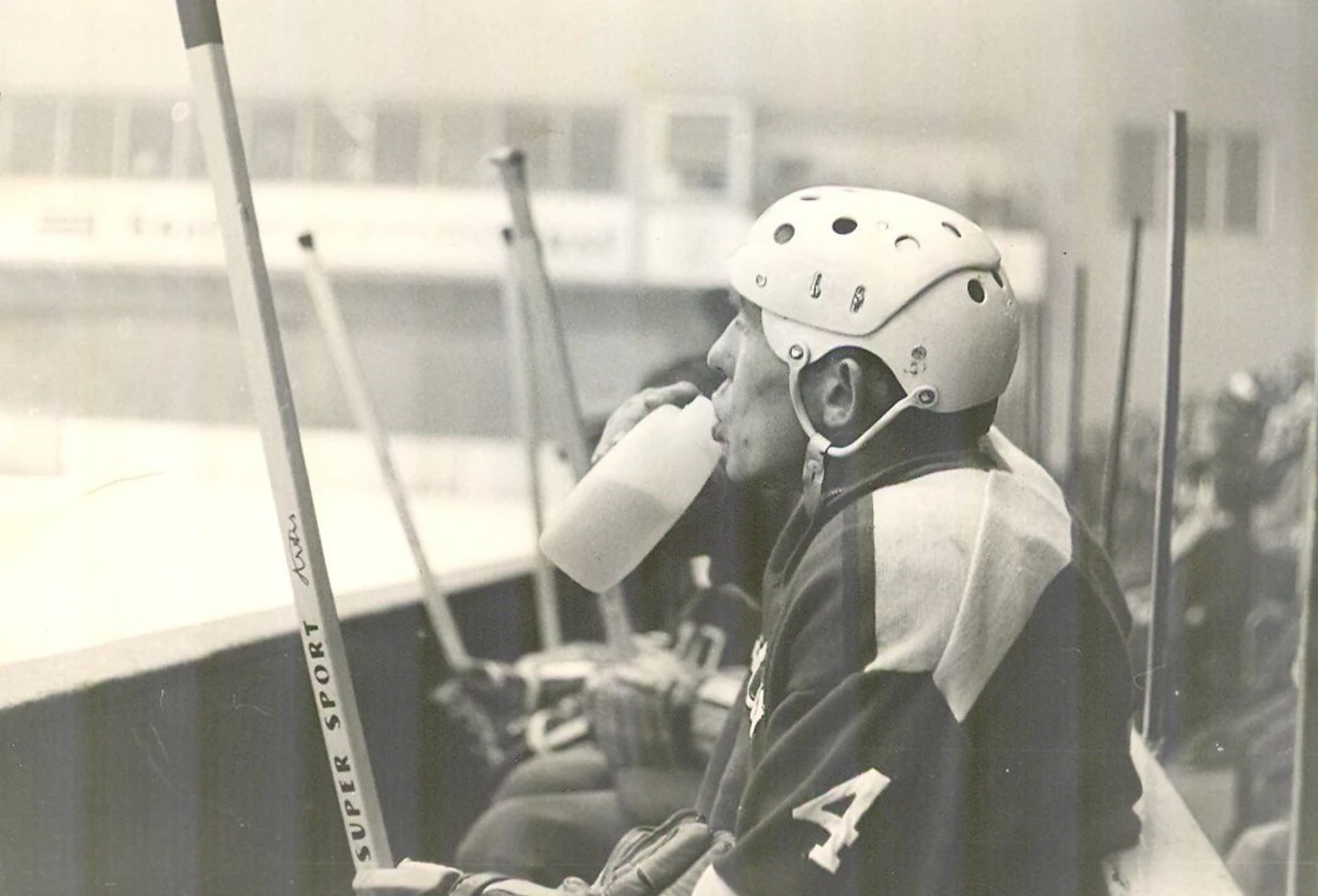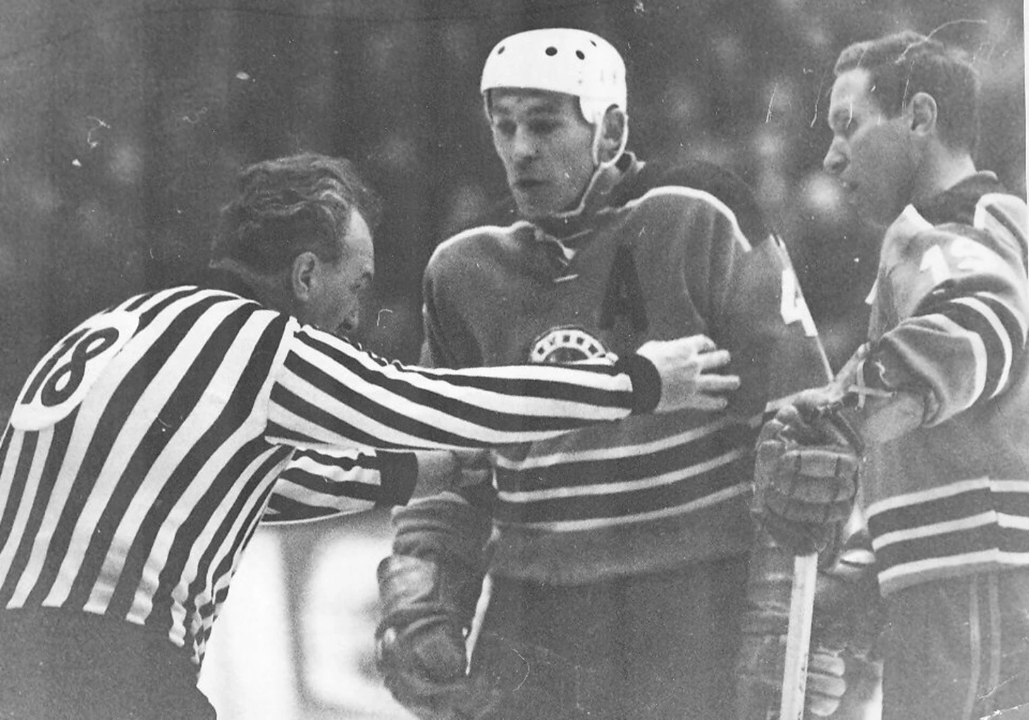 Игроки «Горацка Славии» (Тршебич) Карел Полак (первый справа) и Владимир Бузек (второй справа) после атаки: «где шайба?» (интересно, что у этой «Славии», в отличие от пражской, эмблемой служит не перевернутая звезда)
