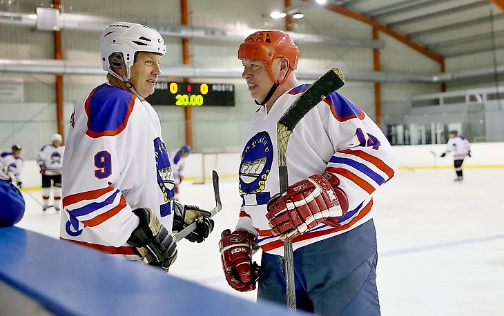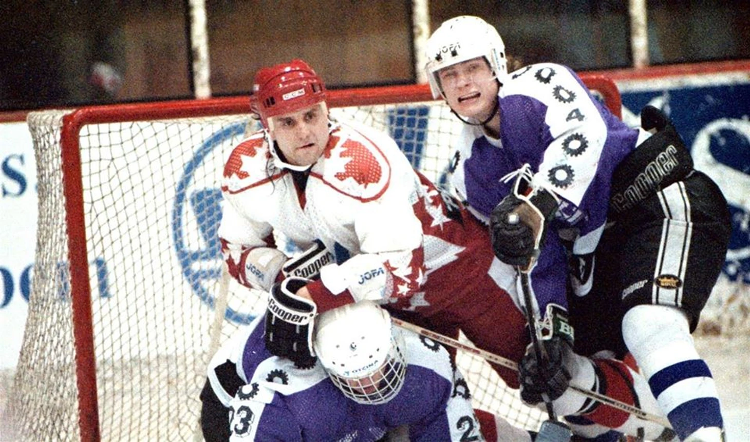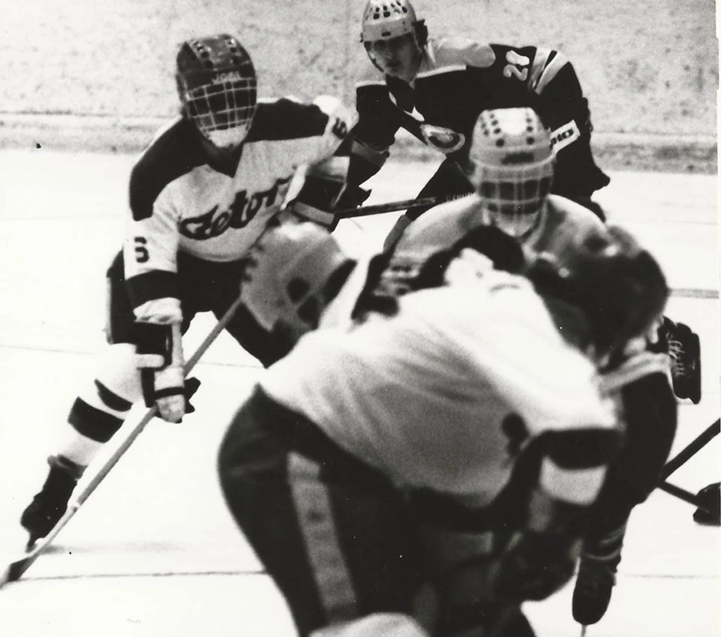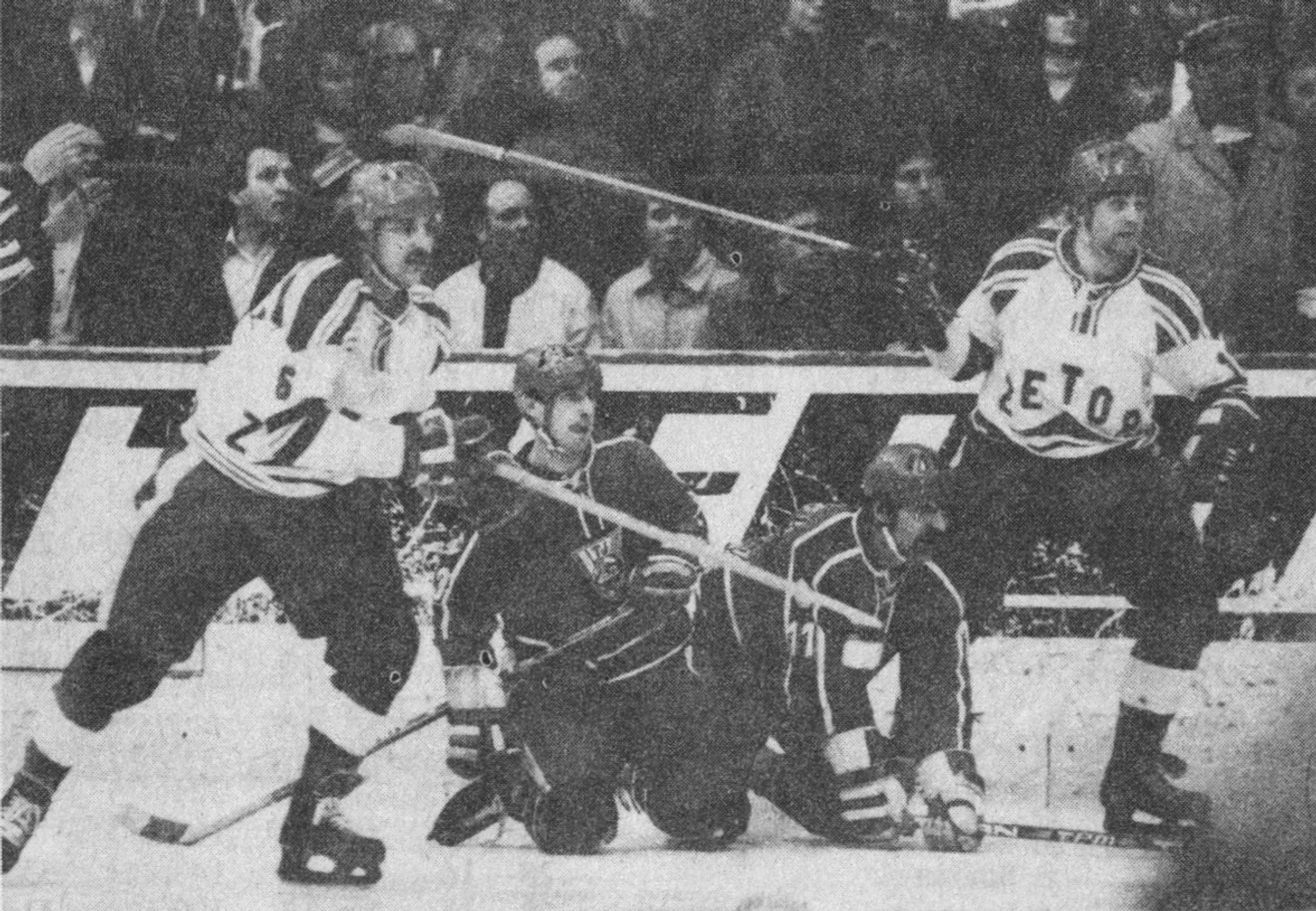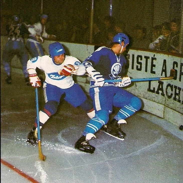 Игроки «Горацка Славии» (Тршебич) Карел Полак (первый справа) и Владимир Бузек (второй справа) после атаки: «где шайба?» (интересно, что у этой «Славии», в отличие от пражской, эмблемой служит не перевернутая звезда)