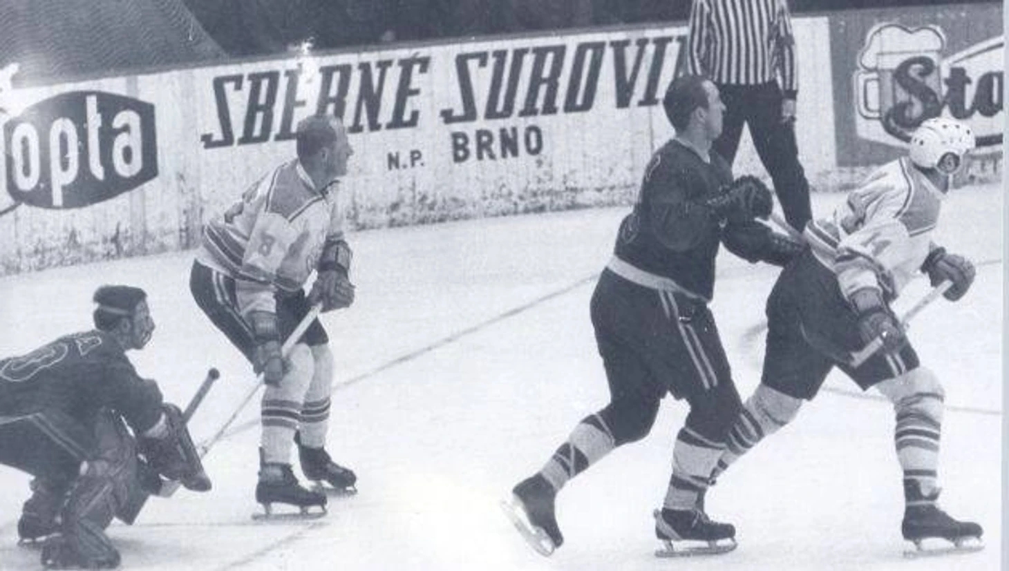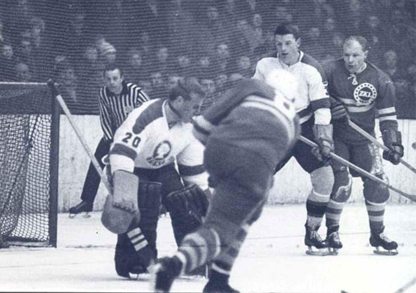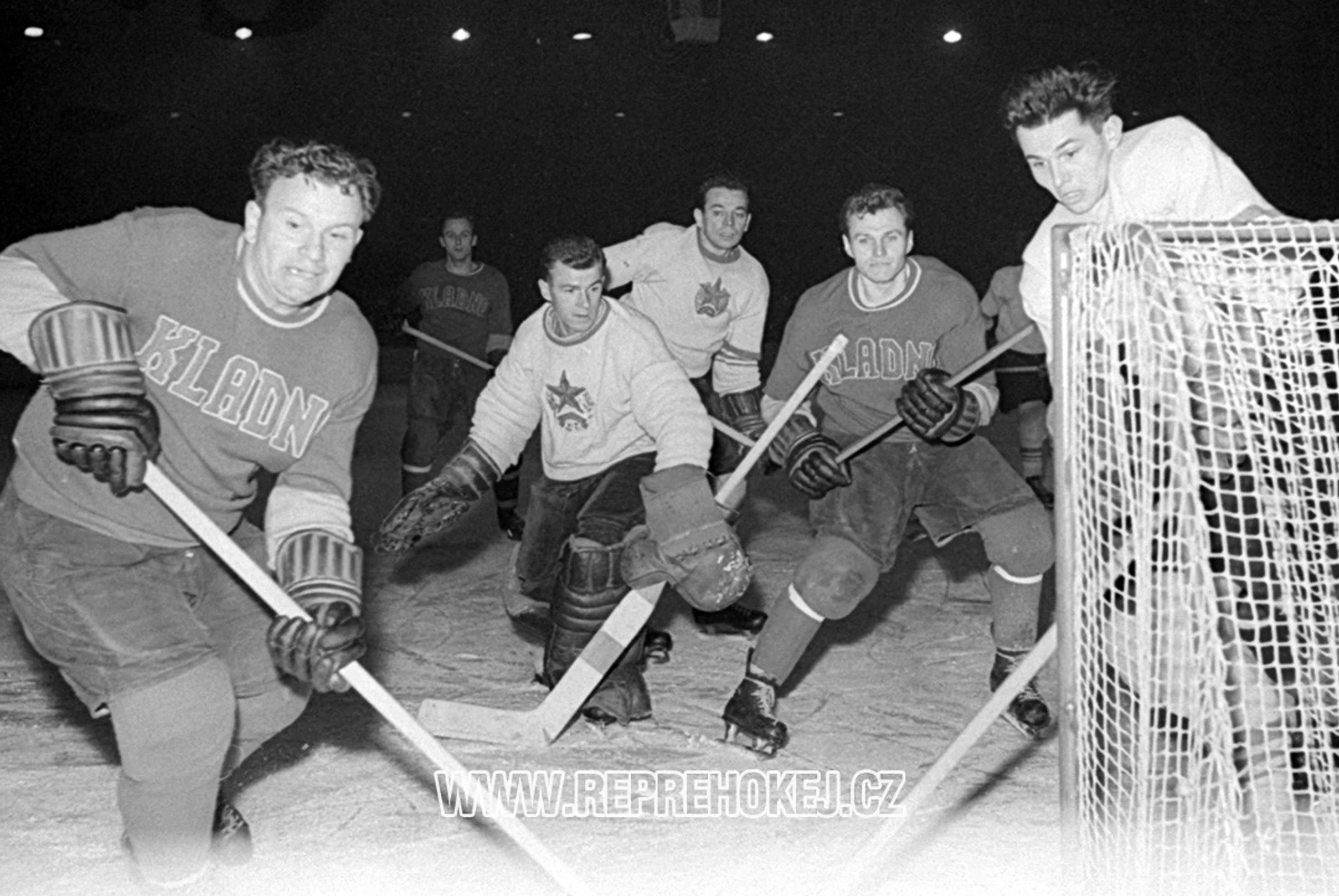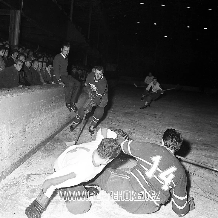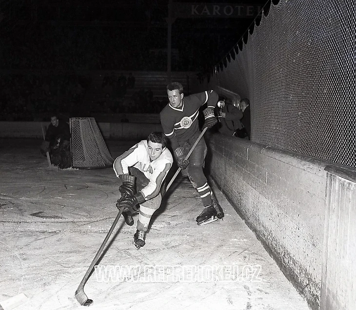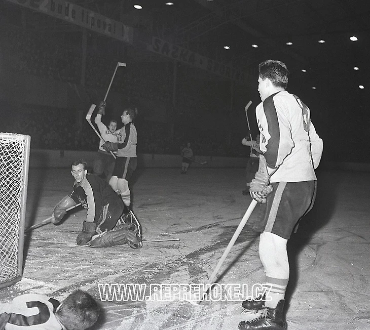 1957/58. «Баник» (Кладно) - «Руда гвезда» (Брно) - 4:2. Ярослав Иржик, будущая звезда Брно, проводящий свой дебютный сезон в лиге, угрожает воротам Иржи Колоуча, для которого это последний сезон в «Гвезде»
