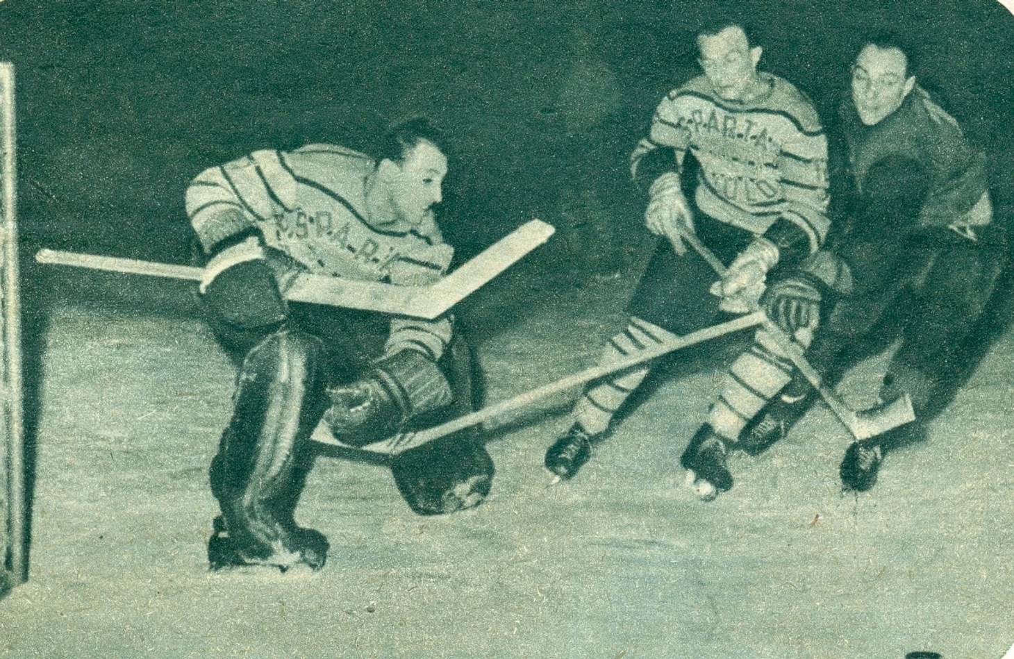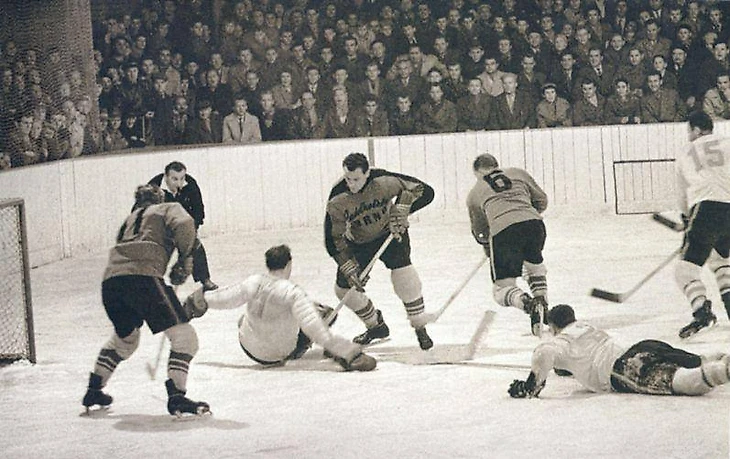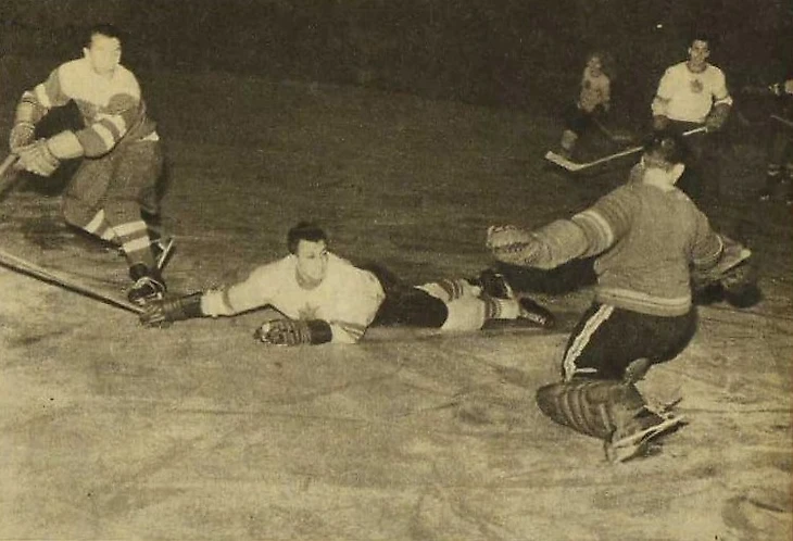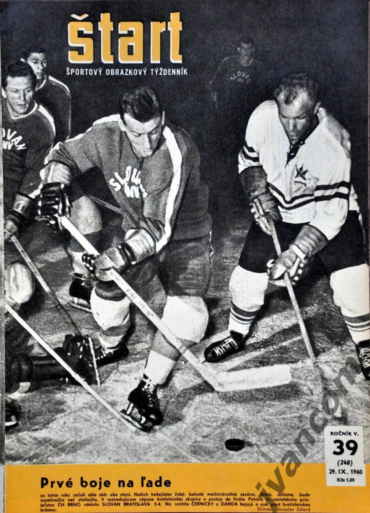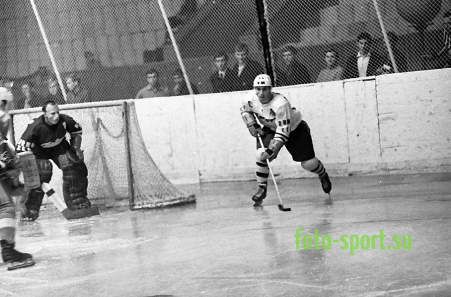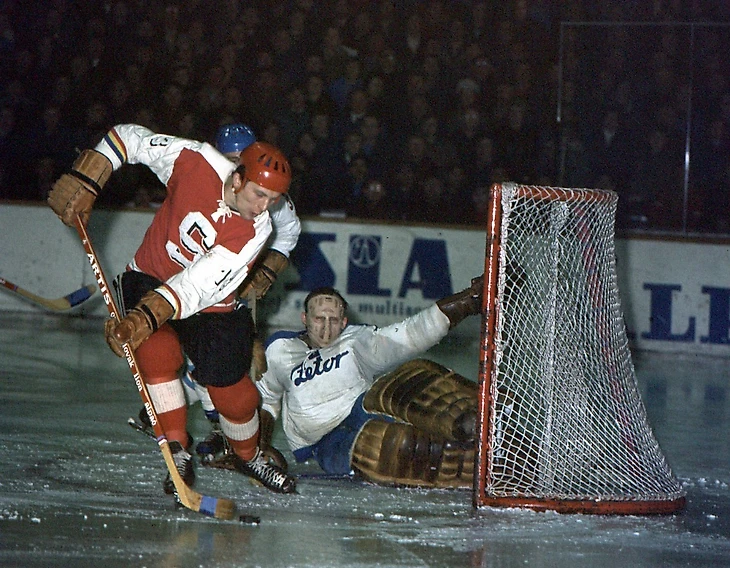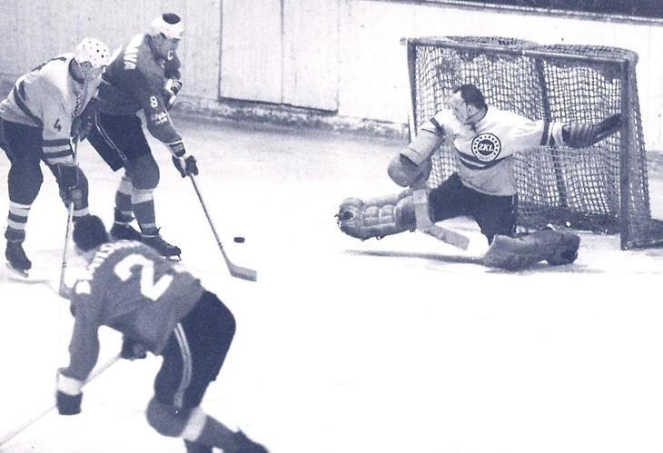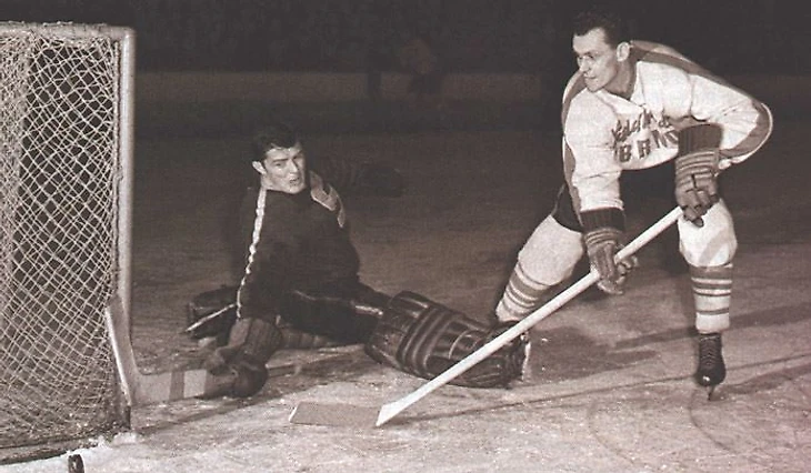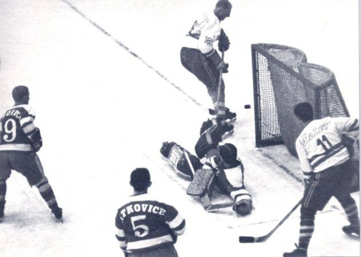 1957/58. «Баник» (Кладно) - «Руда гвезда» (Брно) - 4:2. Ярослав Иржик, будущая звезда Брно, проводящий свой дебютный сезон в лиге, угрожает воротам Иржи Колоуча, для которого это последний сезон в «Гвезде»