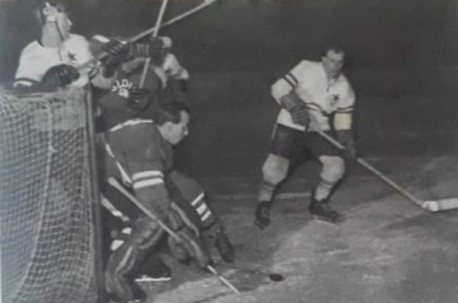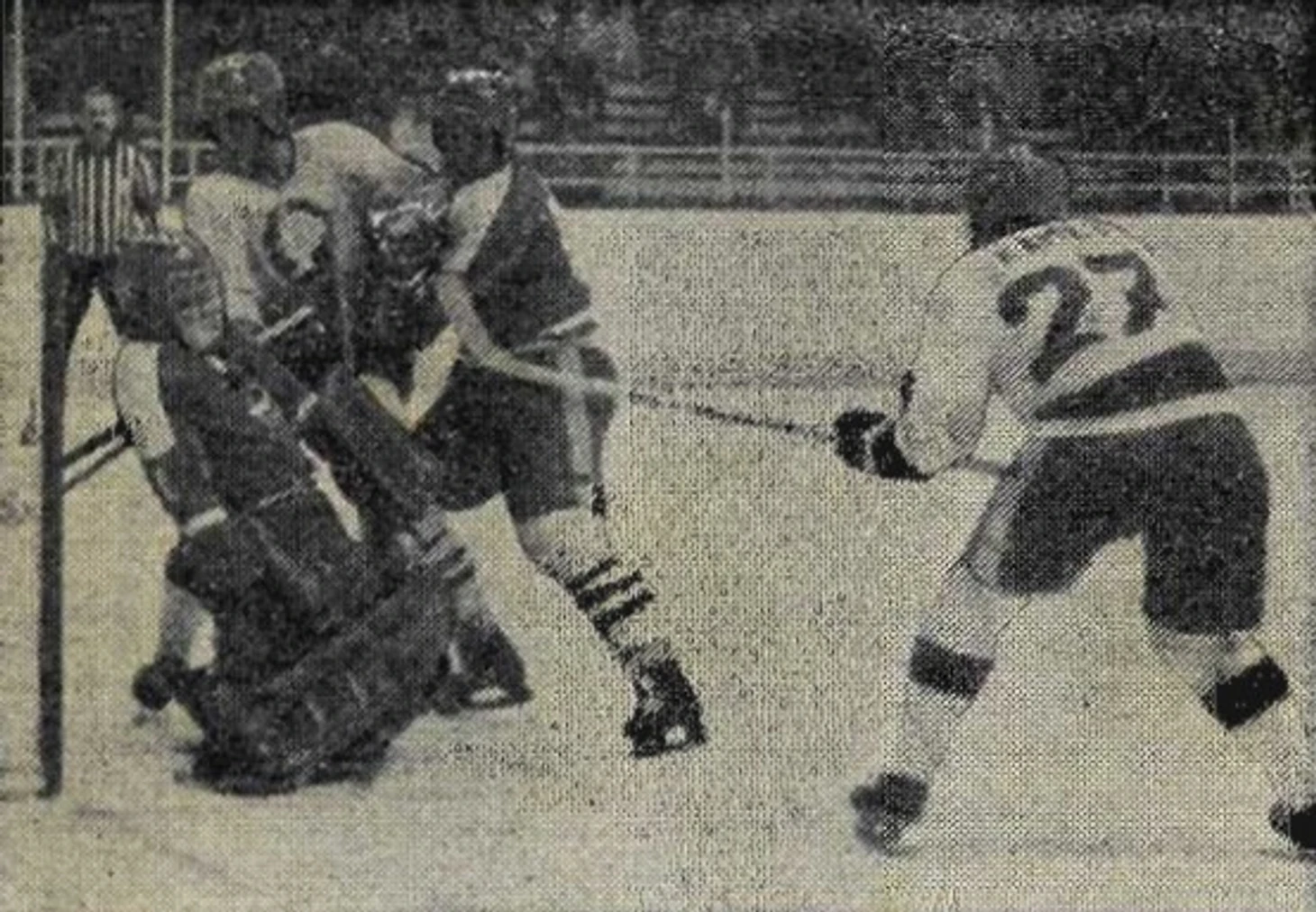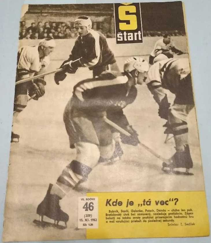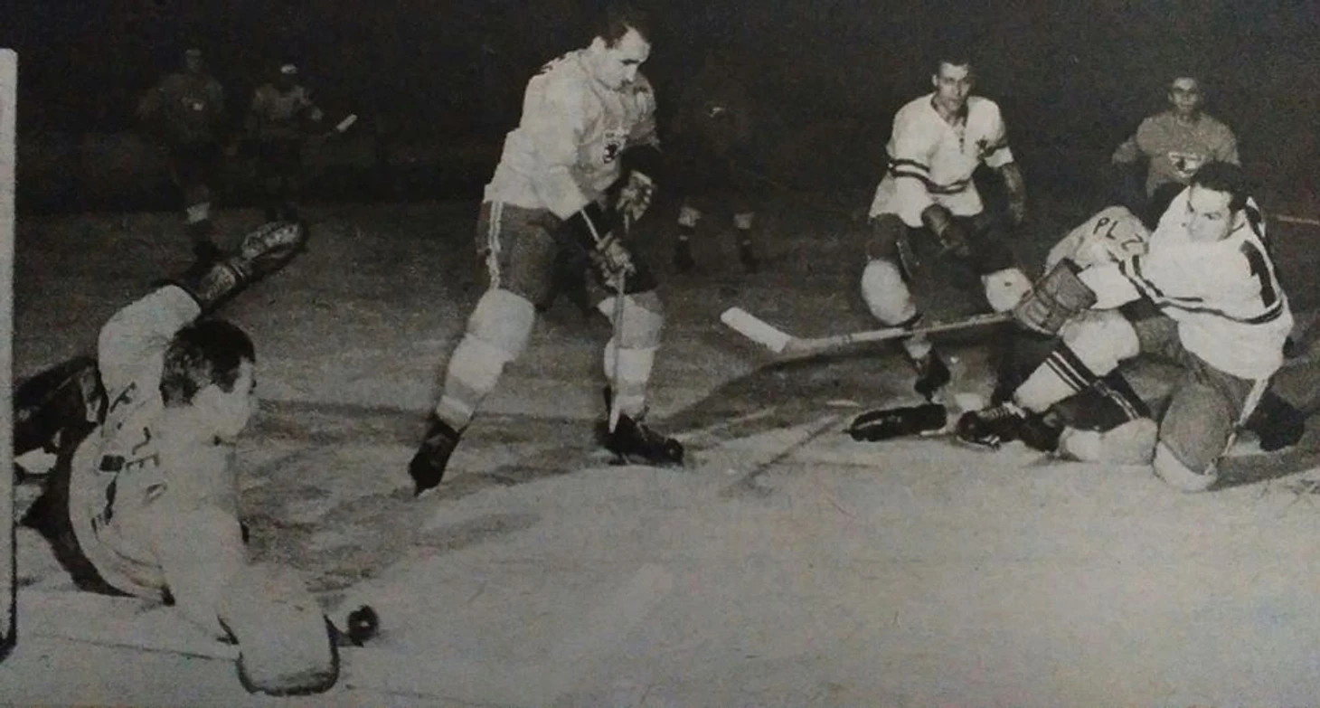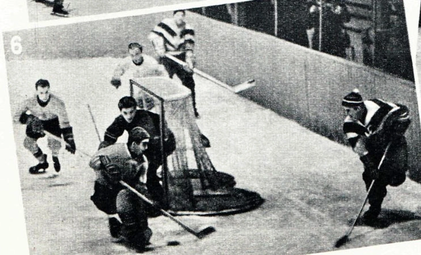 1957/58. «Баник» (Кладно) - «Руда гвезда» (Брно) - 4:2. Ярослав Иржик, будущая звезда Брно, проводящий свой дебютный сезон в лиге, угрожает воротам Иржи Колоуча, для которого это последний сезон в «Гвезде»