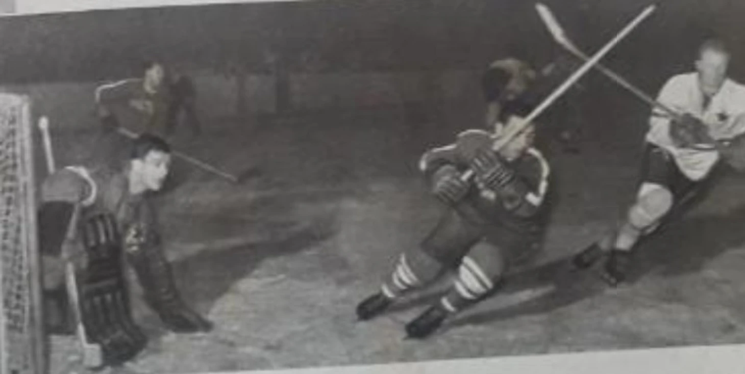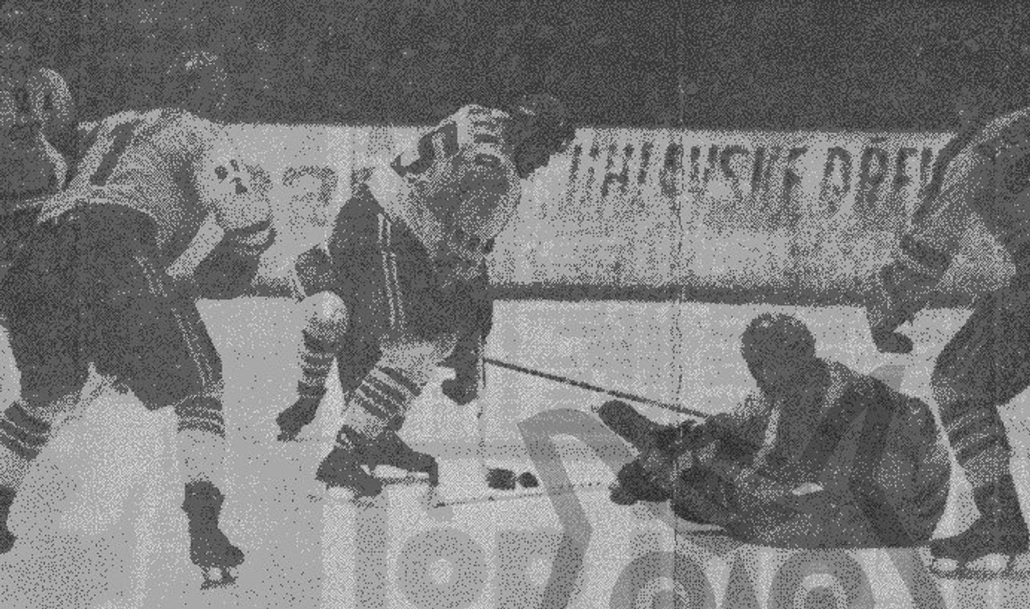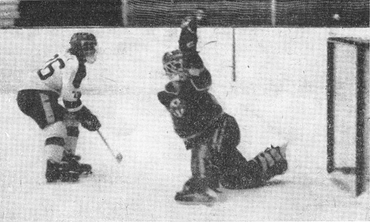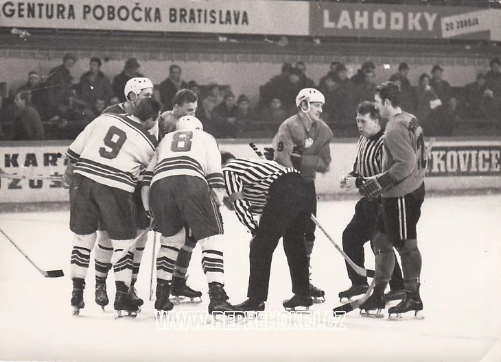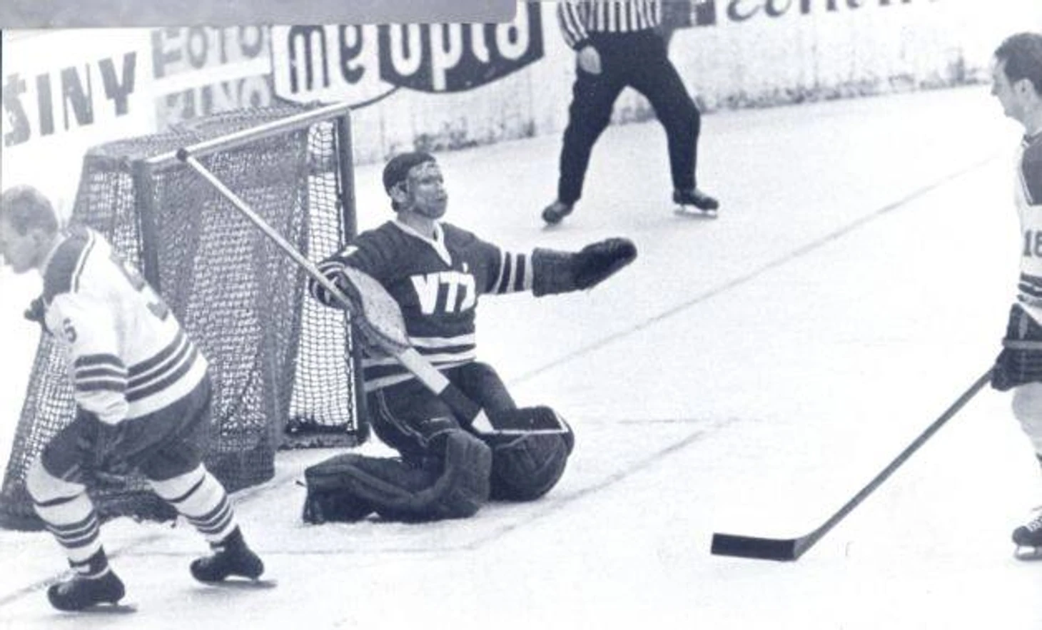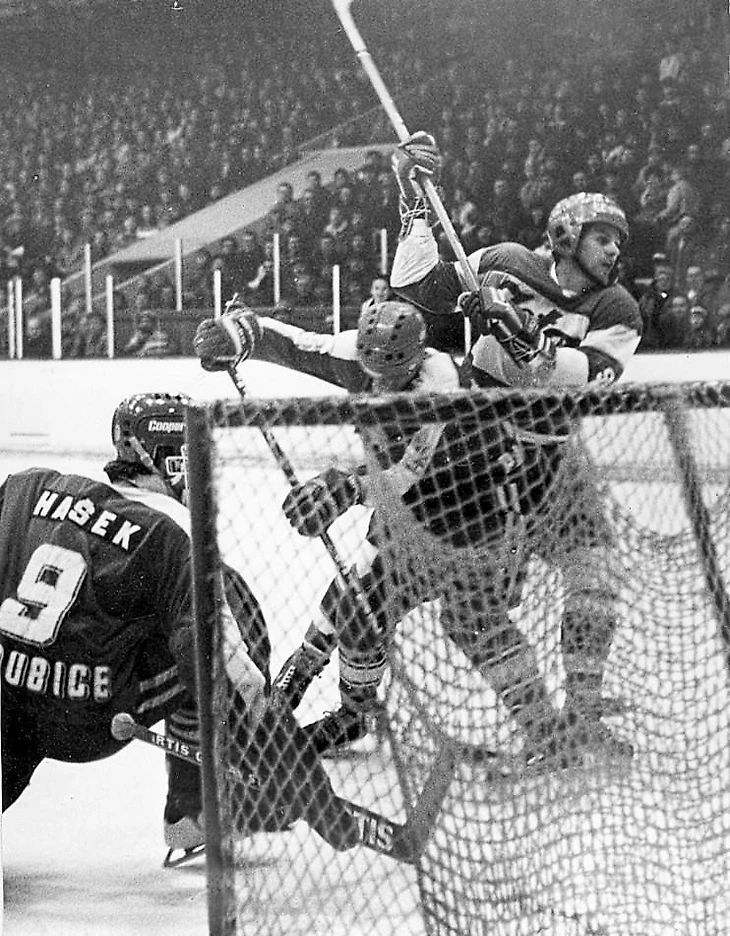 1957/58. «Баник» (Кладно) - «Руда гвезда» (Брно) - 4:2. Ярослав Иржик, будущая звезда Брно, проводящий свой дебютный сезон в лиге, угрожает воротам Иржи Колоуча, для которого это последний сезон в «Гвезде»