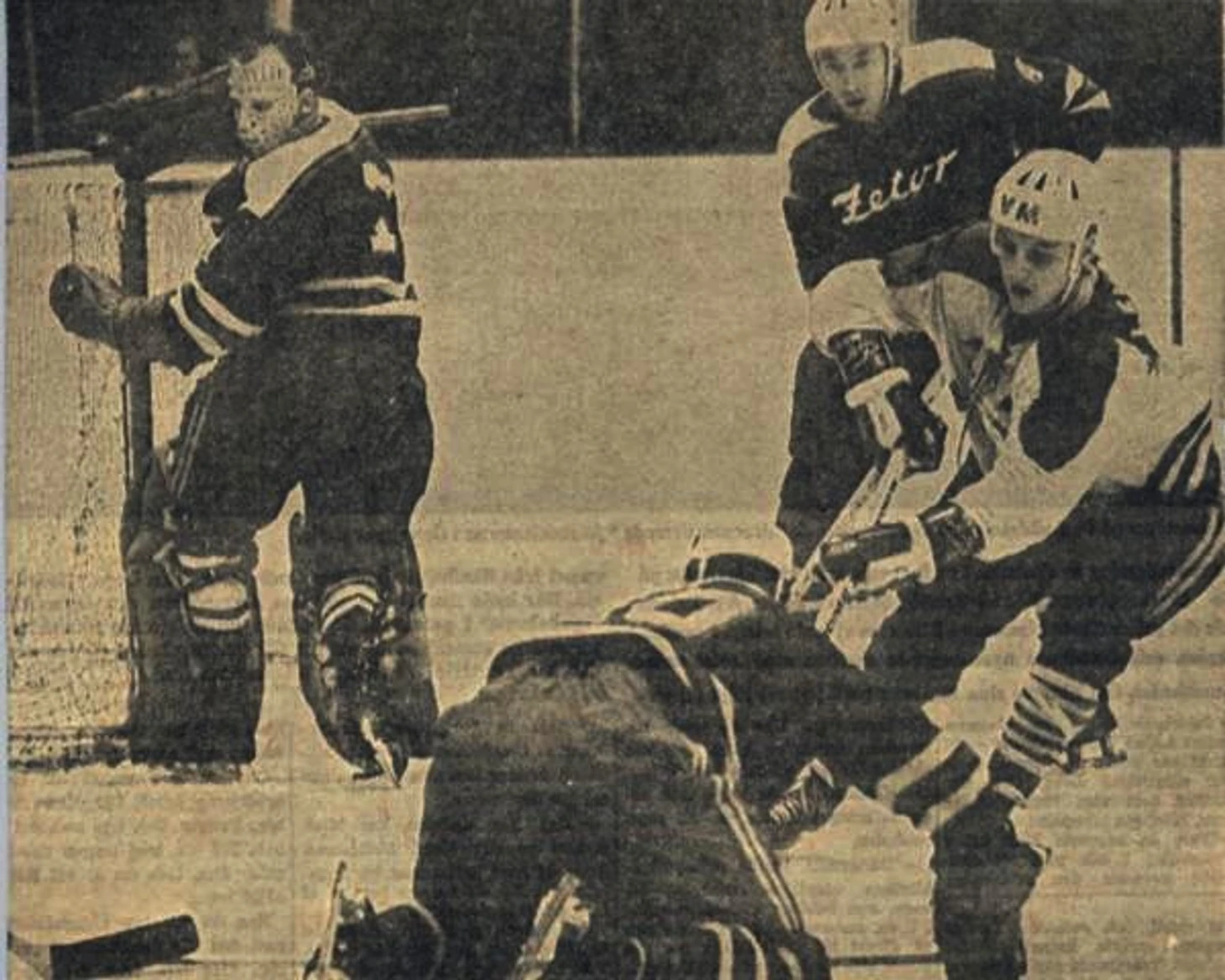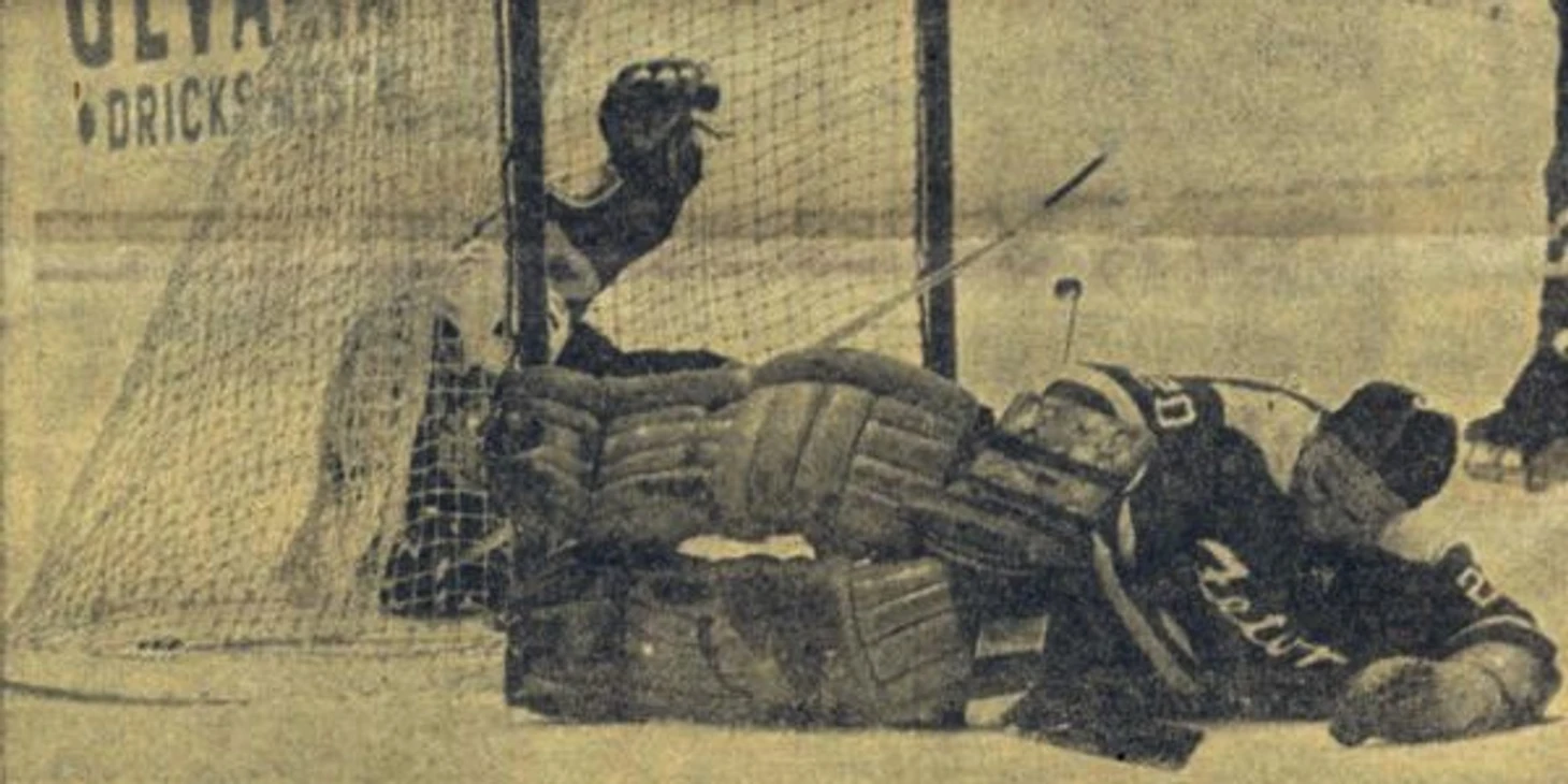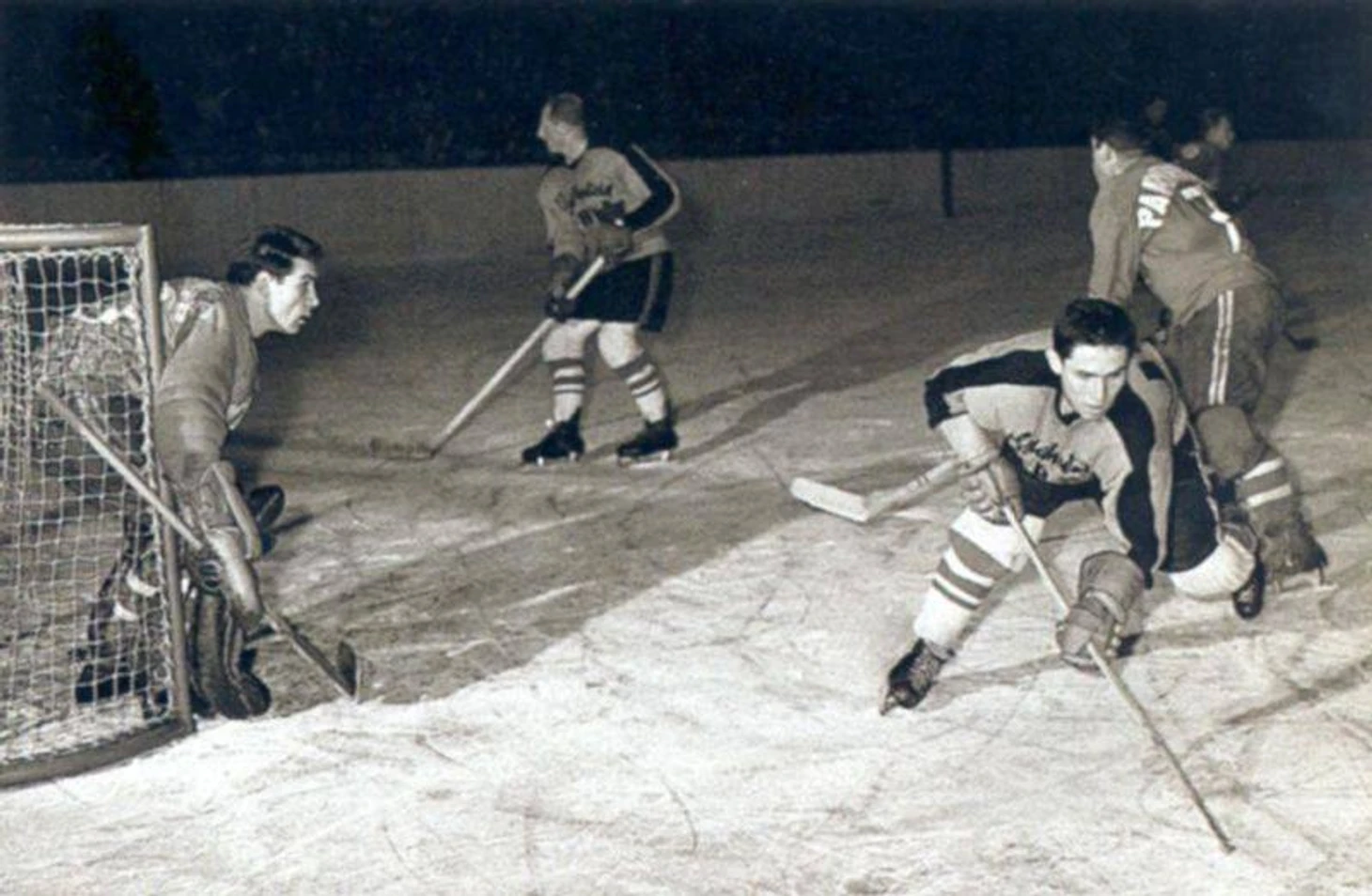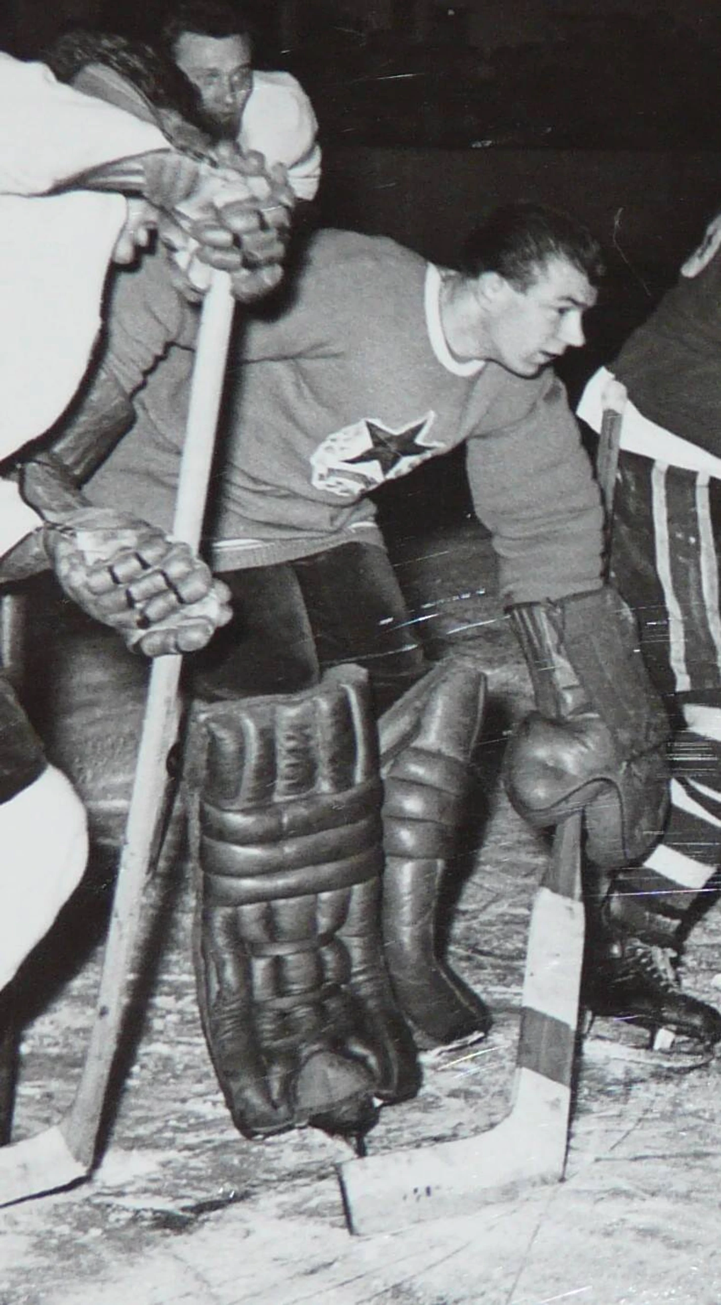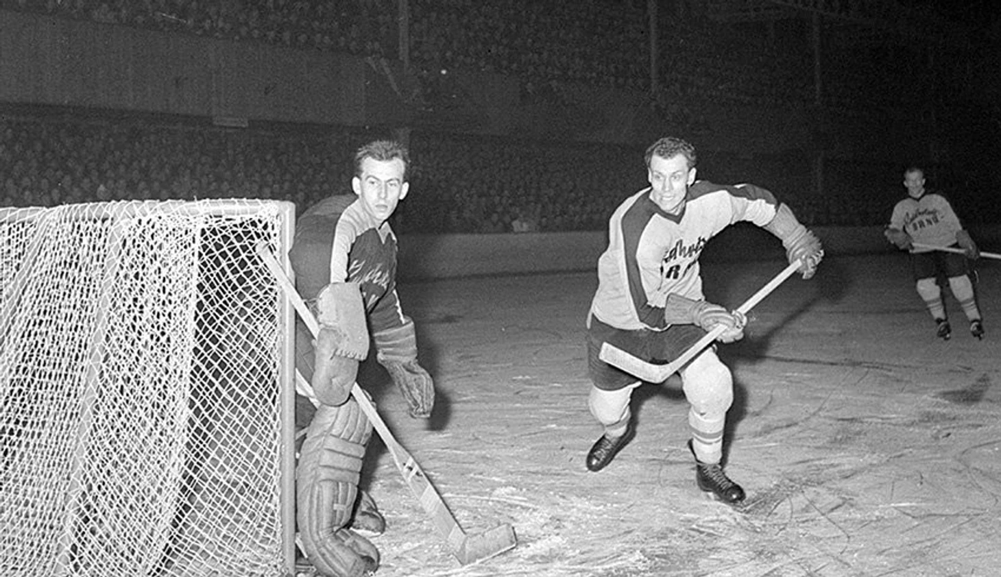 1957/58. «Баник» (Кладно) - «Руда гвезда» (Брно) - 4:2. Ярослав Иржик, будущая звезда Брно, проводящий свой дебютный сезон в лиге, угрожает воротам Иржи Колоуча, для которого это последний сезон в «Гвезде»
