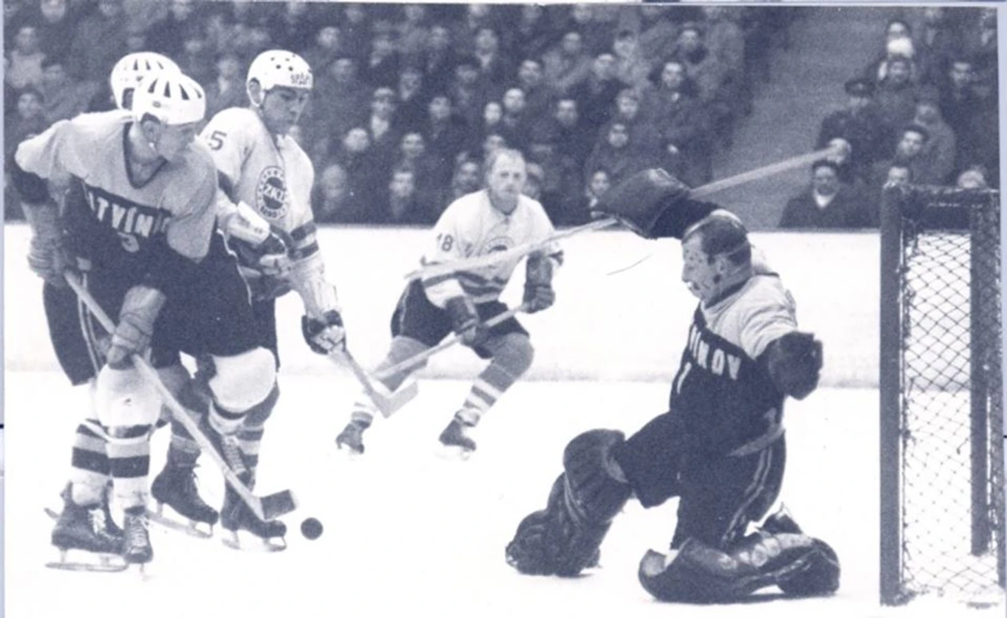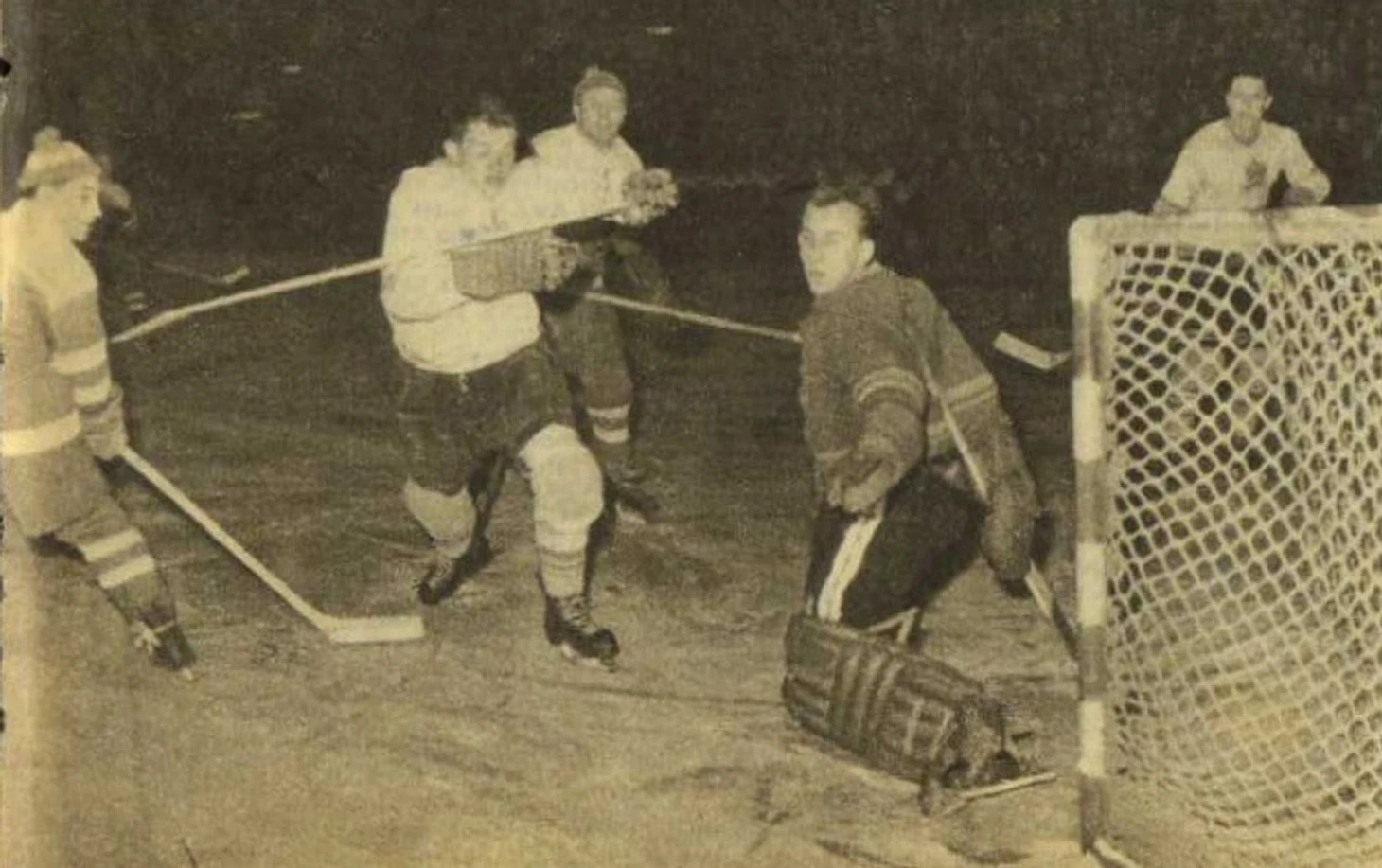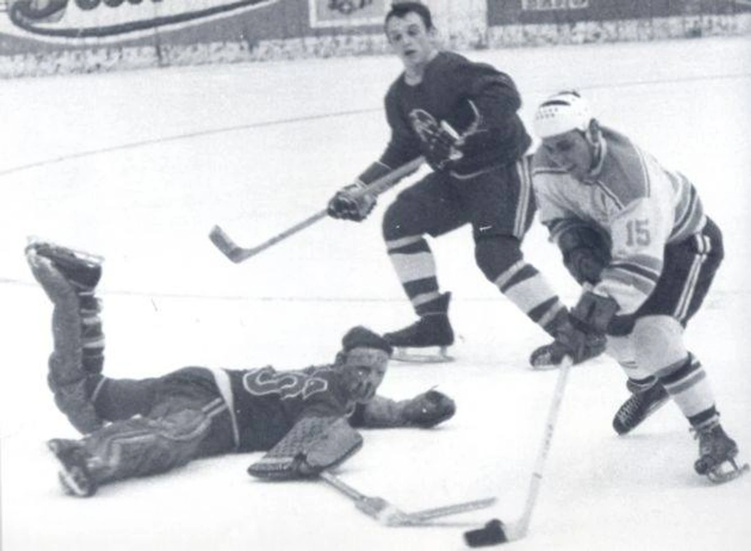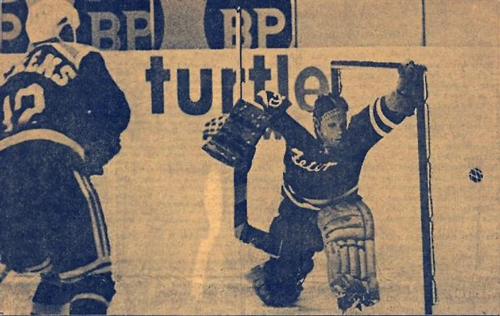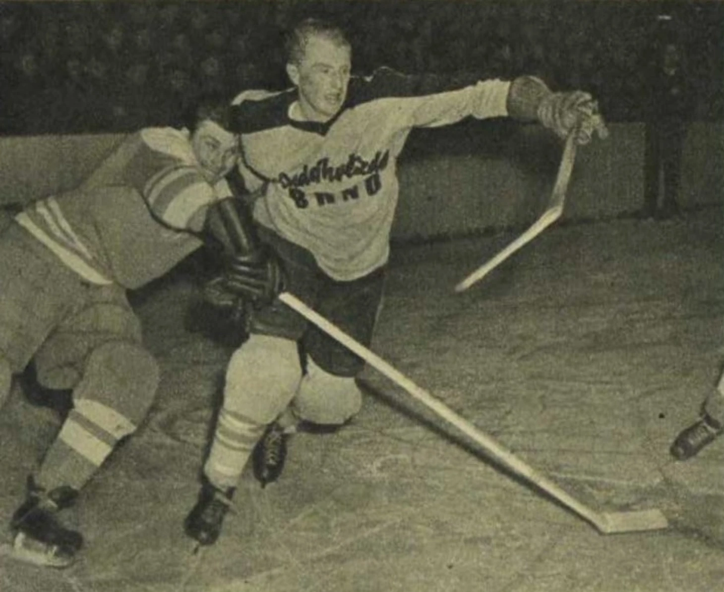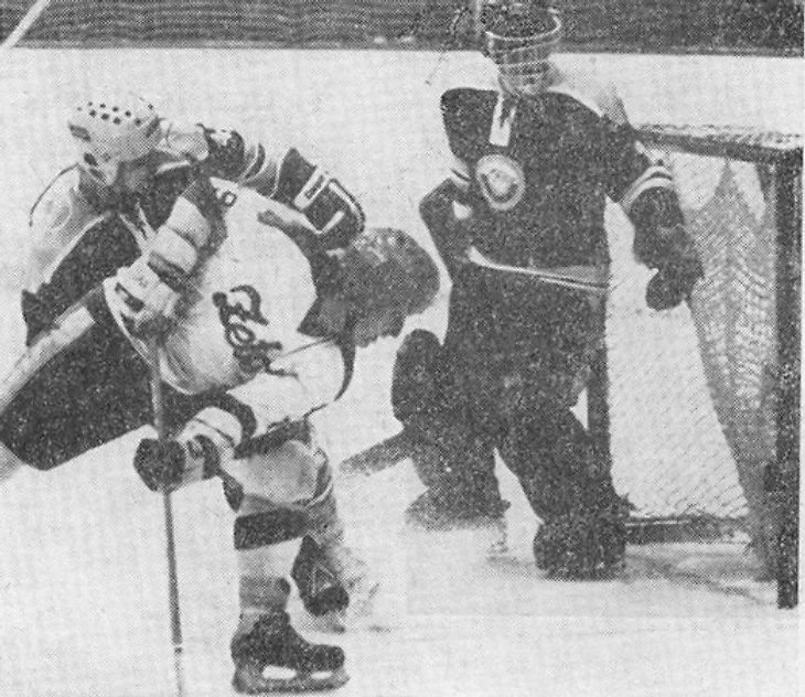 1957/58. «Баник» (Кладно) - «Руда гвезда» (Брно) - 4:2. Ярослав Иржик, будущая звезда Брно, проводящий свой дебютный сезон в лиге, угрожает воротам Иржи Колоуча, для которого это последний сезон в «Гвезде»