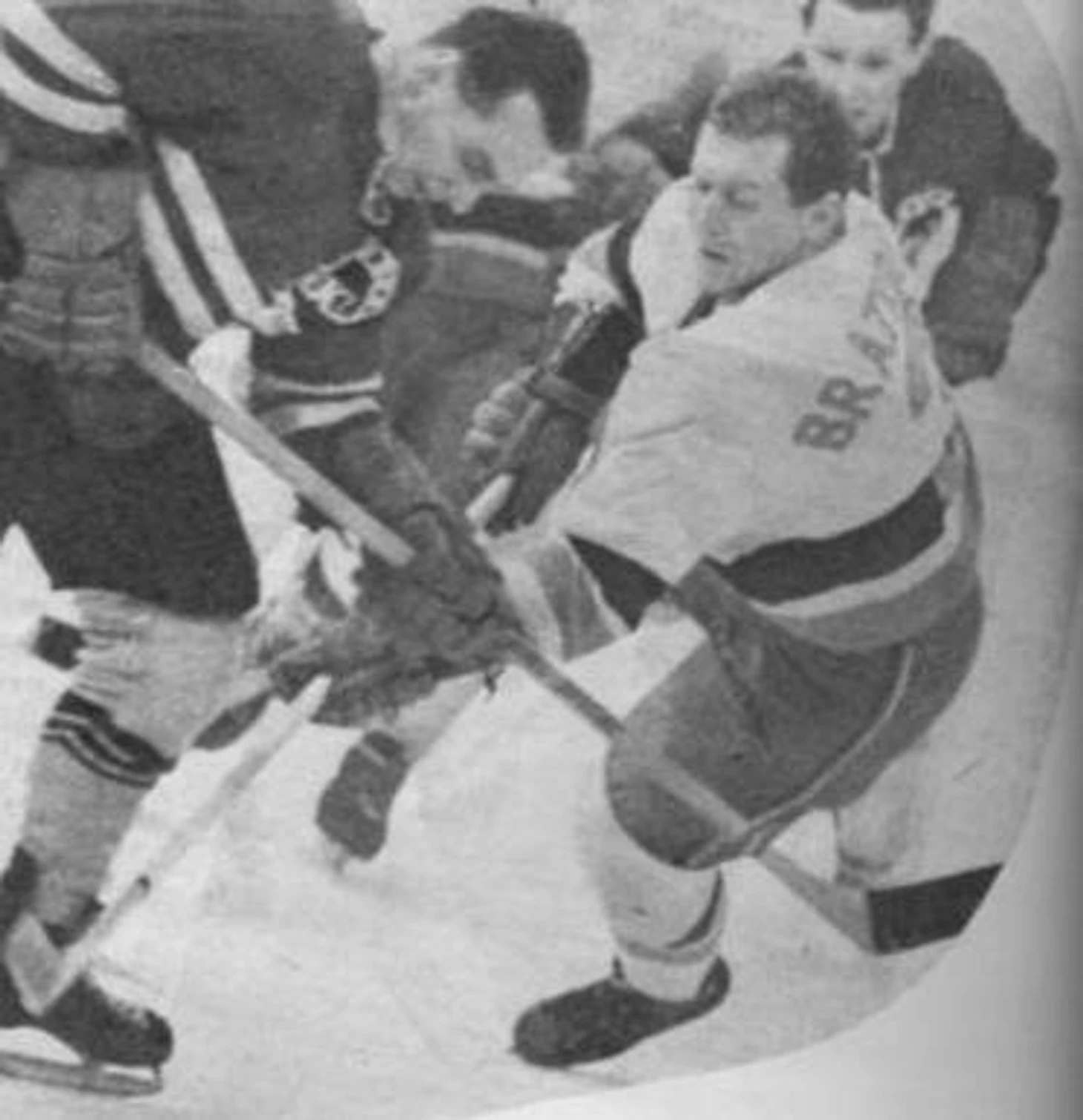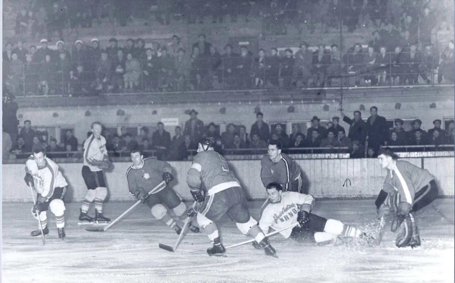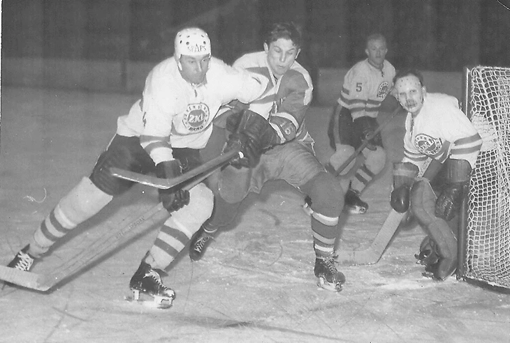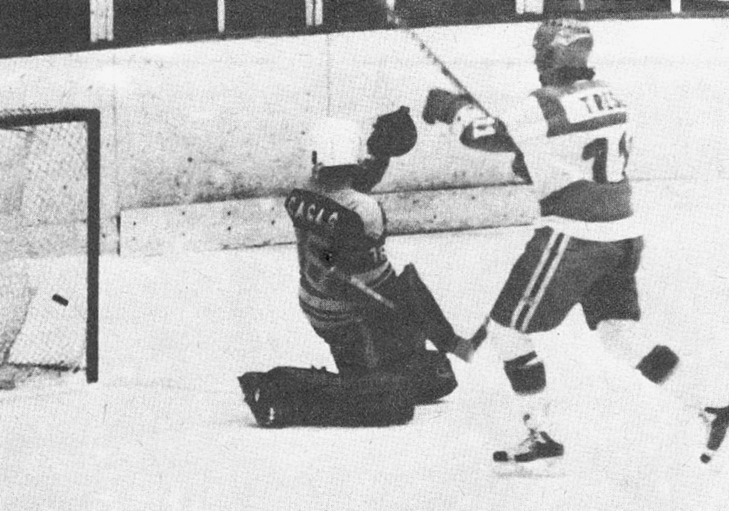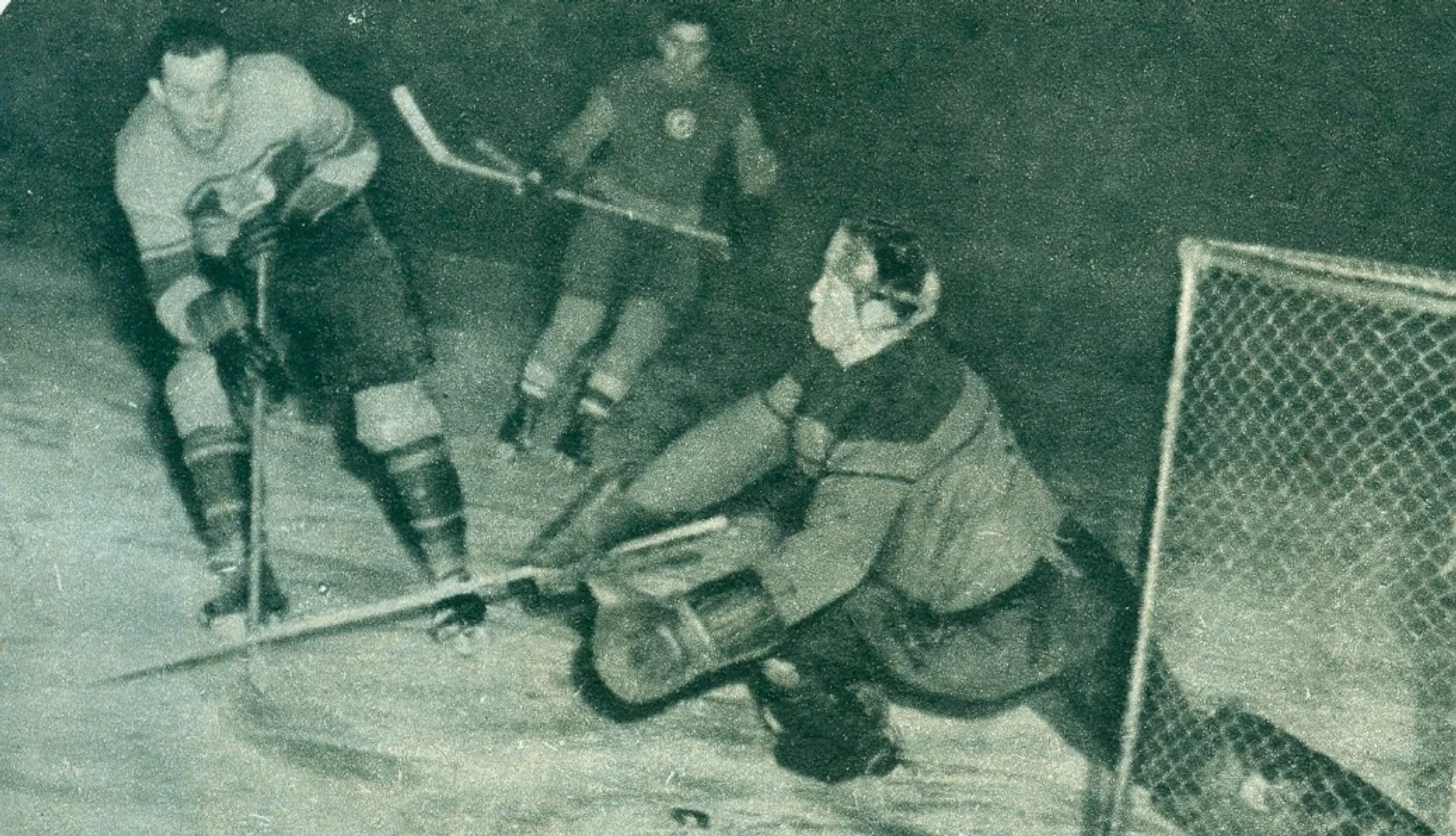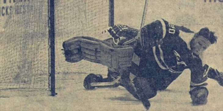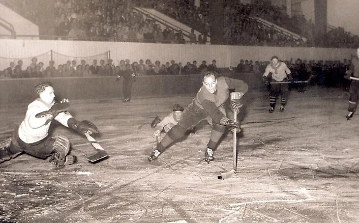 1957/58. «Баник» (Кладно) - «Руда гвезда» (Брно) - 4:2. Ярослав Иржик, будущая звезда Брно, проводящий свой дебютный сезон в лиге, угрожает воротам Иржи Колоуча, для которого это последний сезон в «Гвезде»