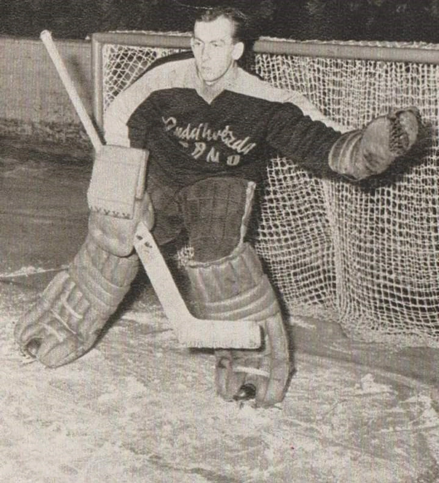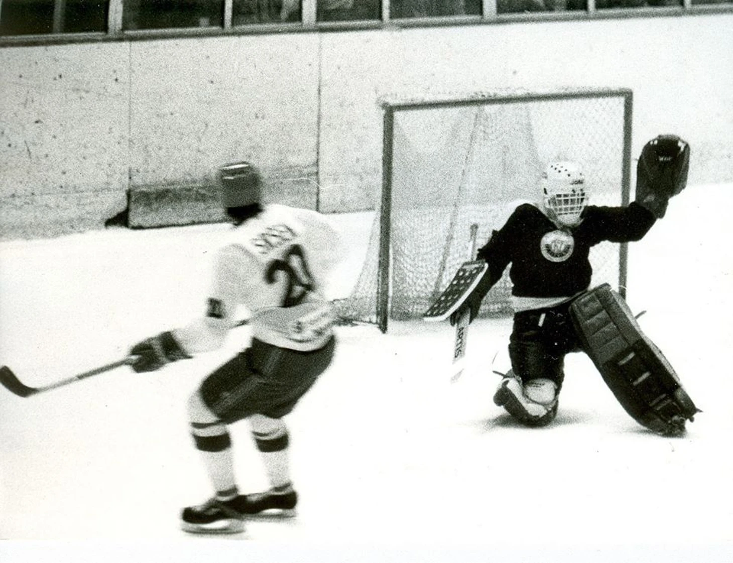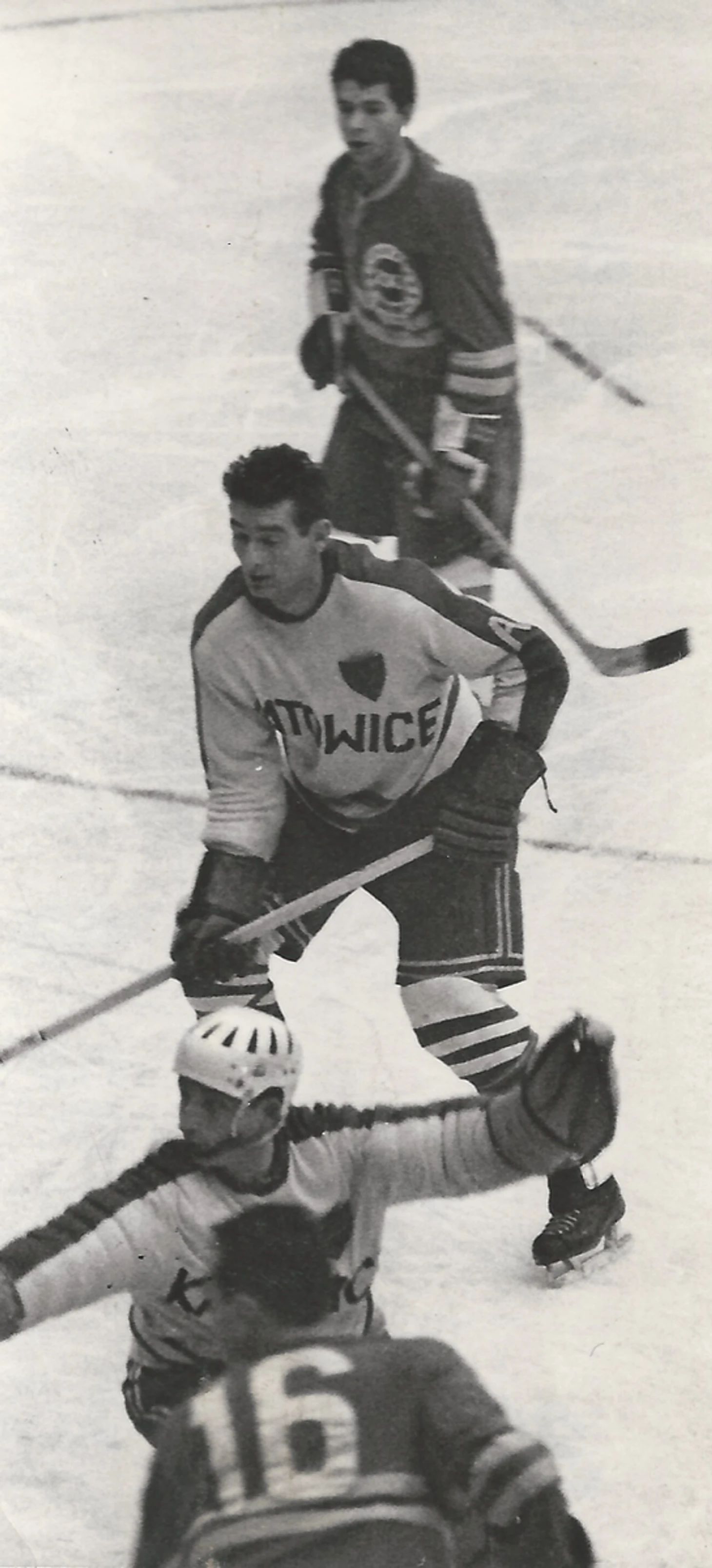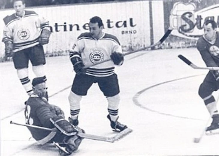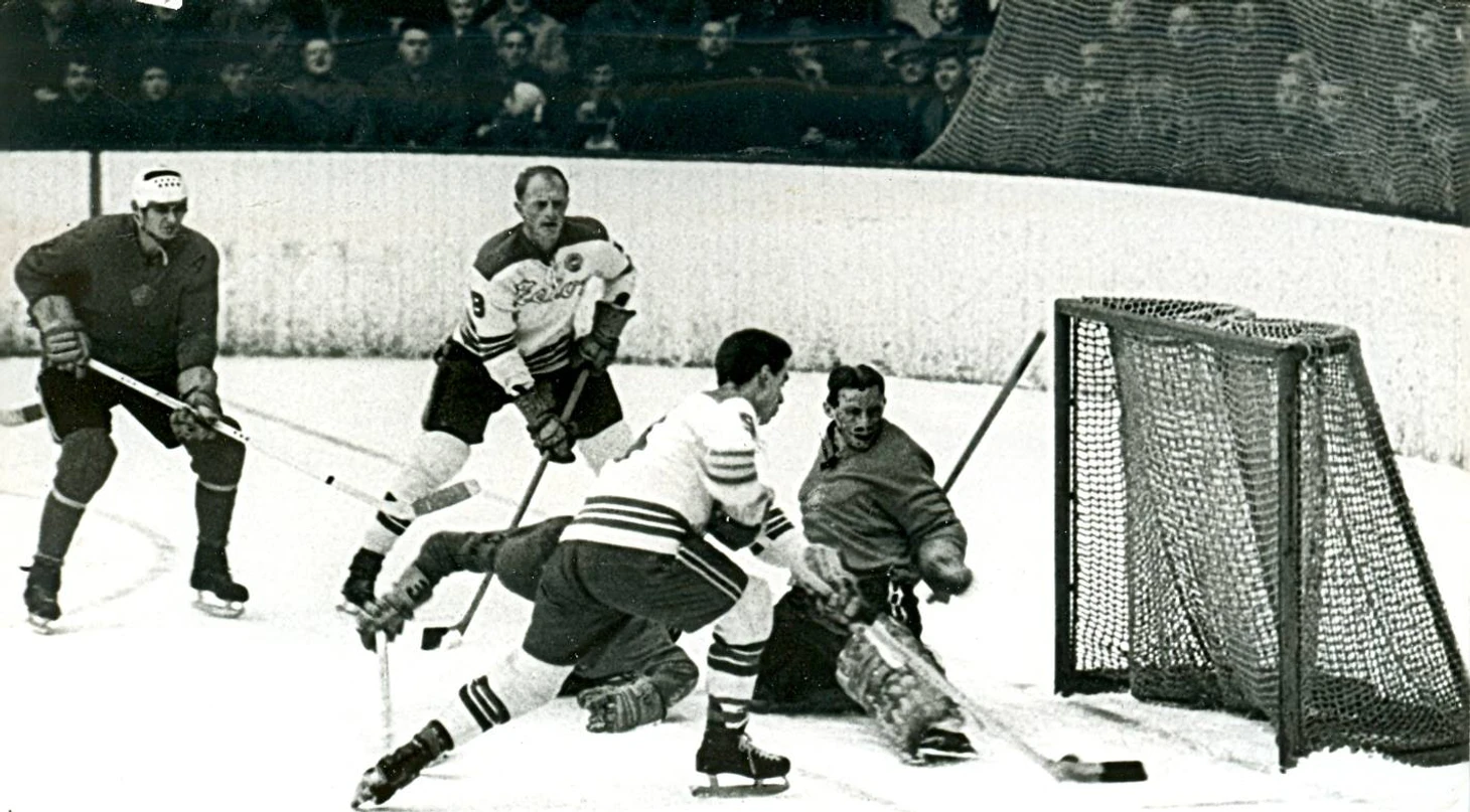 1957/58. «Баник» (Кладно) - «Руда гвезда» (Брно) - 4:2. Ярослав Иржик, будущая звезда Брно, проводящий свой дебютный сезон в лиге, угрожает воротам Иржи Колоуча, для которого это последний сезон в «Гвезде»