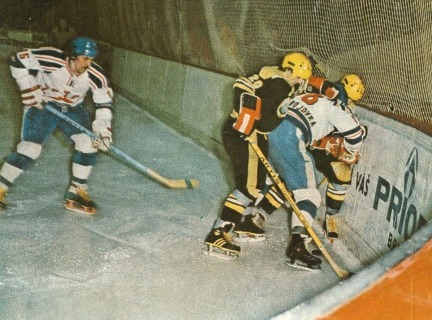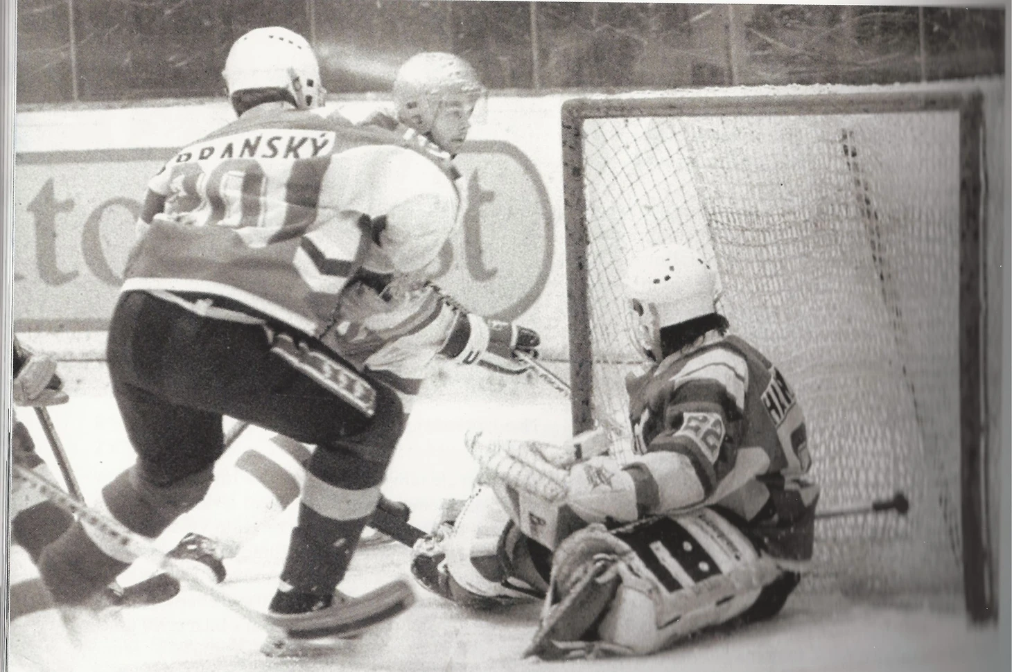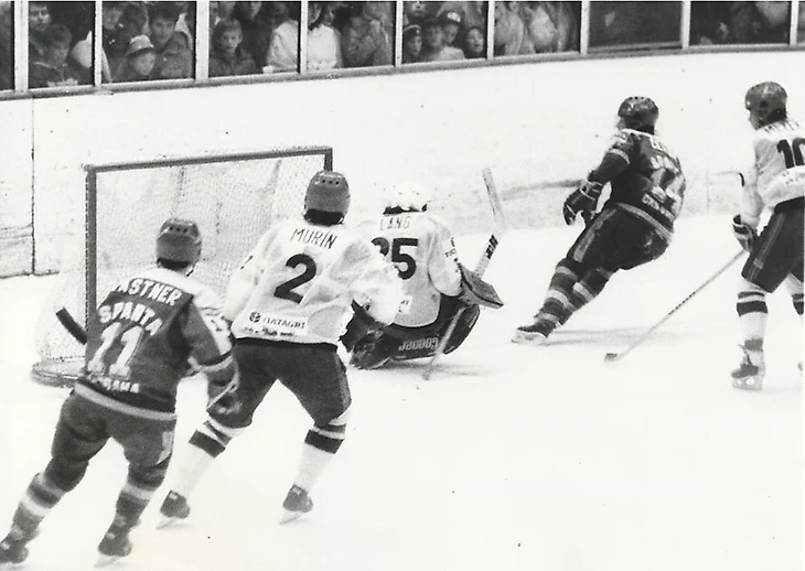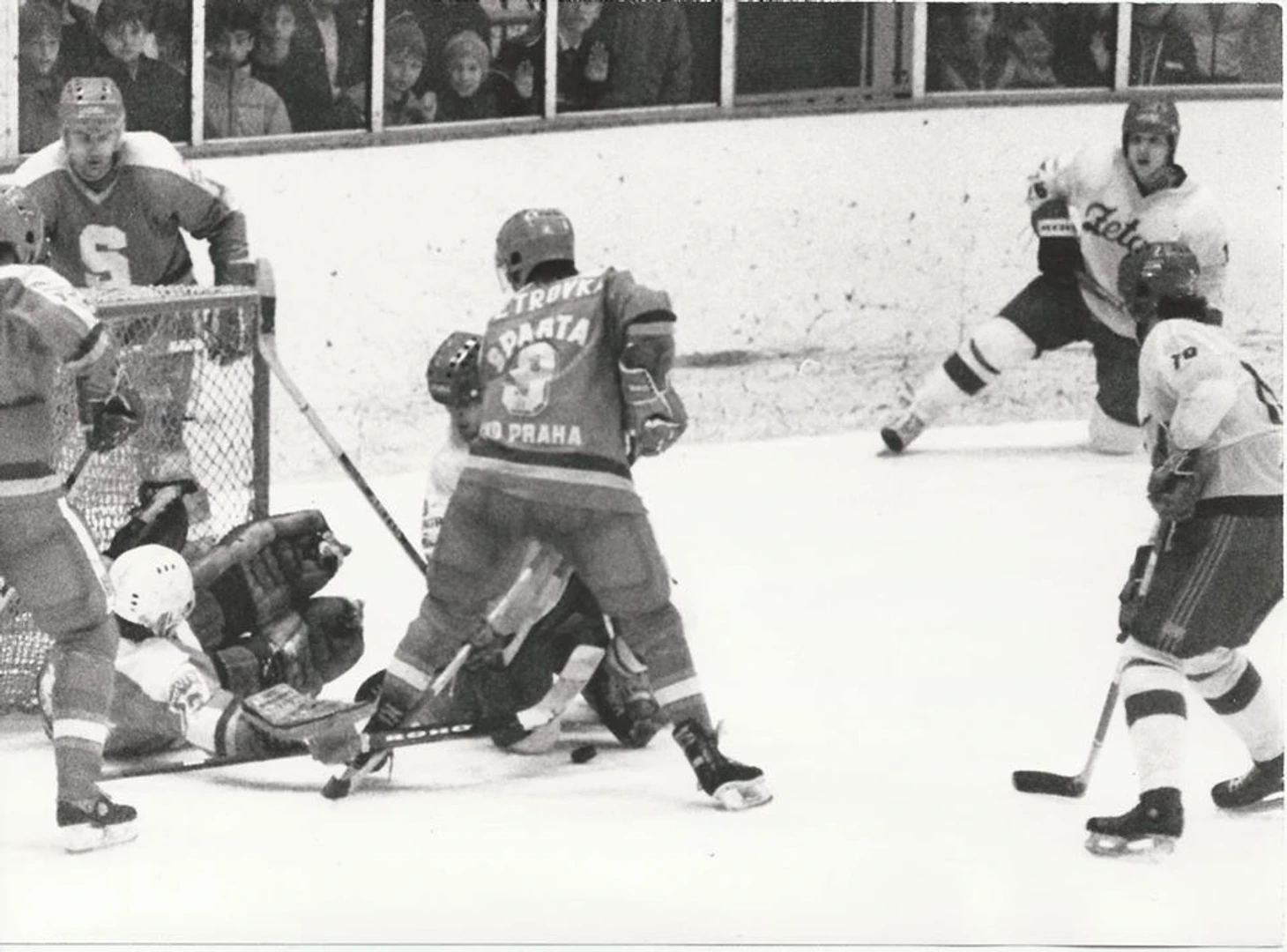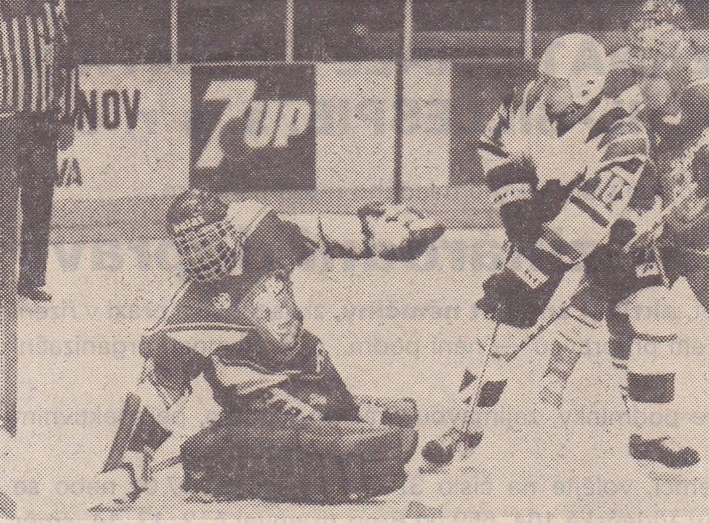 25 января 1987 года. «Польди» (Кладно) - «Локомотив-Ингстав» (Брно) - 5:2. Голкипер гостей Либор Спурны против Мартина Кутхана (№ 14) и Милана Новы (№ 6)