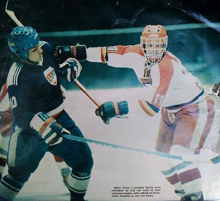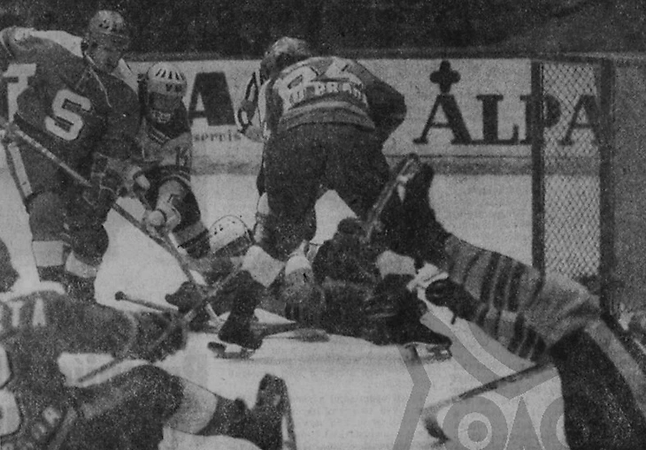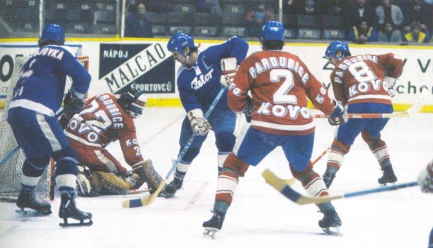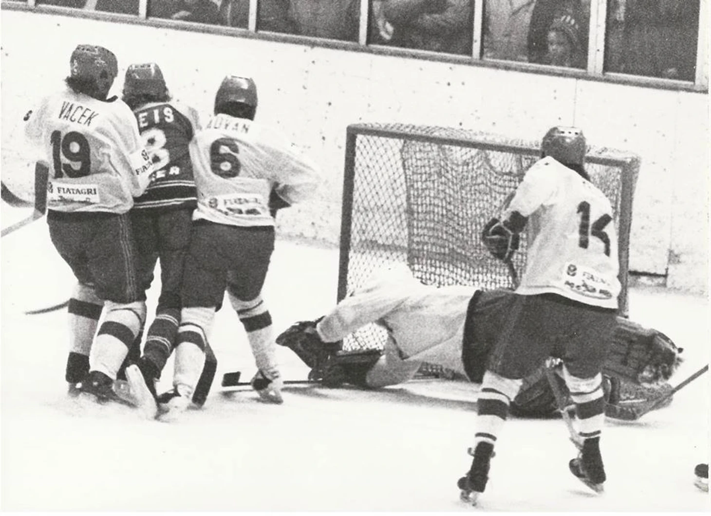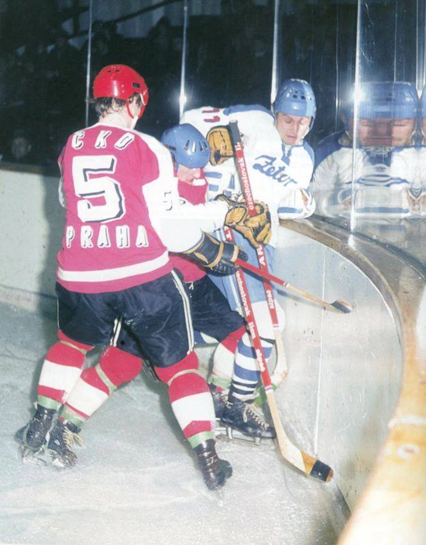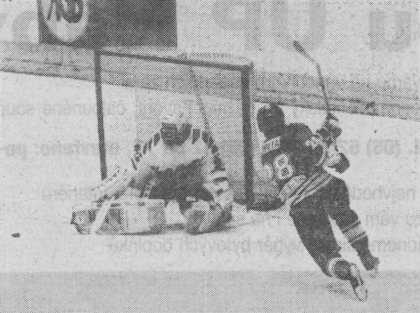 25 января 1987 года. «Польди» (Кладно) - «Локомотив-Ингстав» (Брно) - 5:2. Голкипер гостей Либор Спурны против Мартина Кутхана (№ 14) и Милана Новы (№ 6)