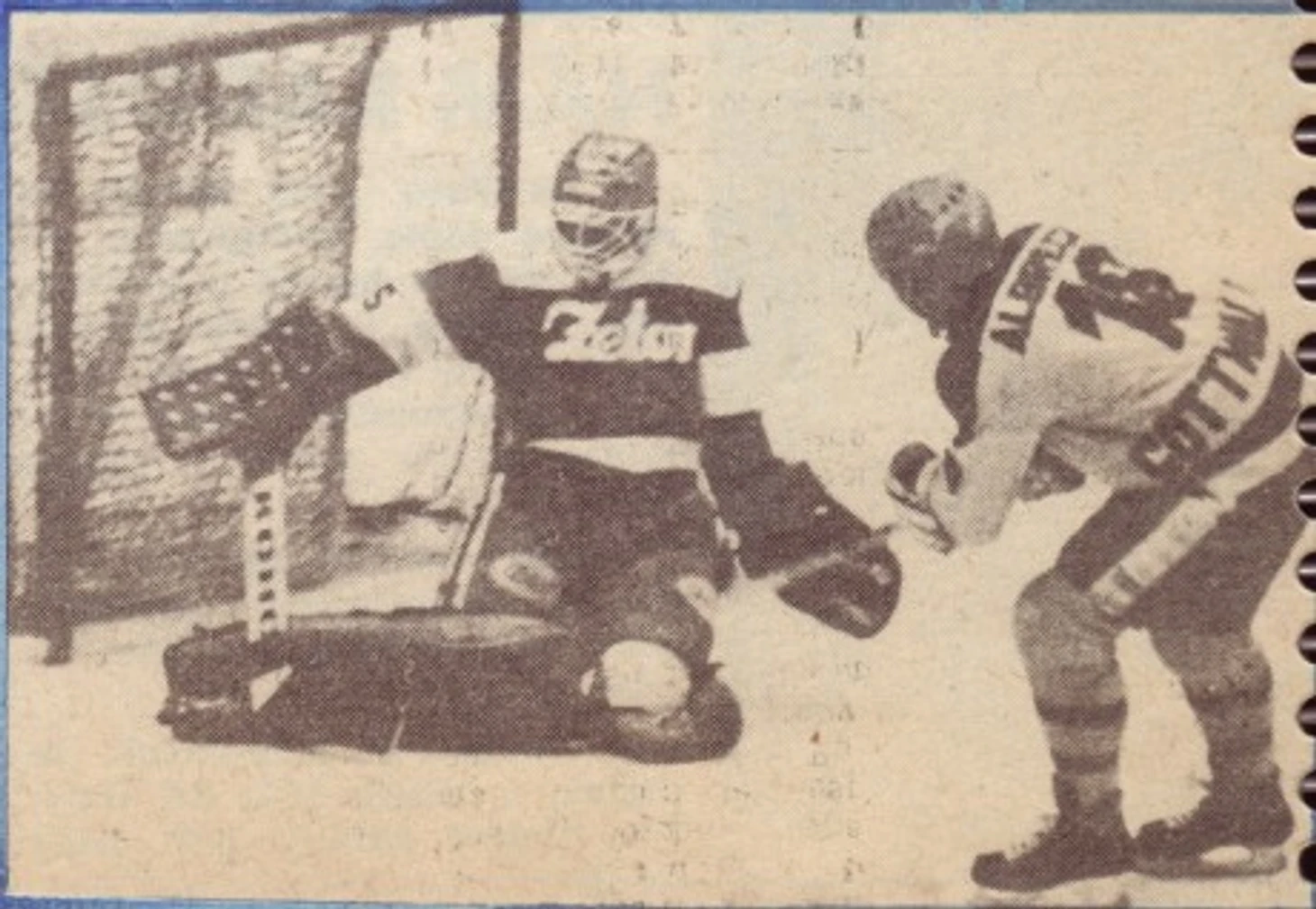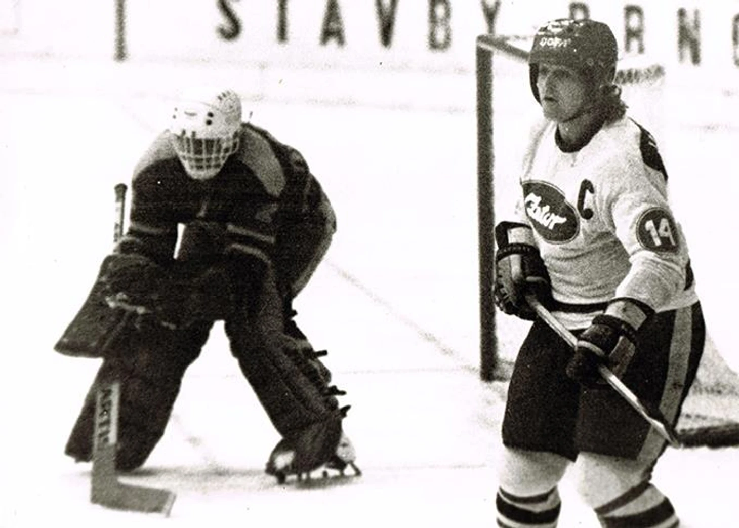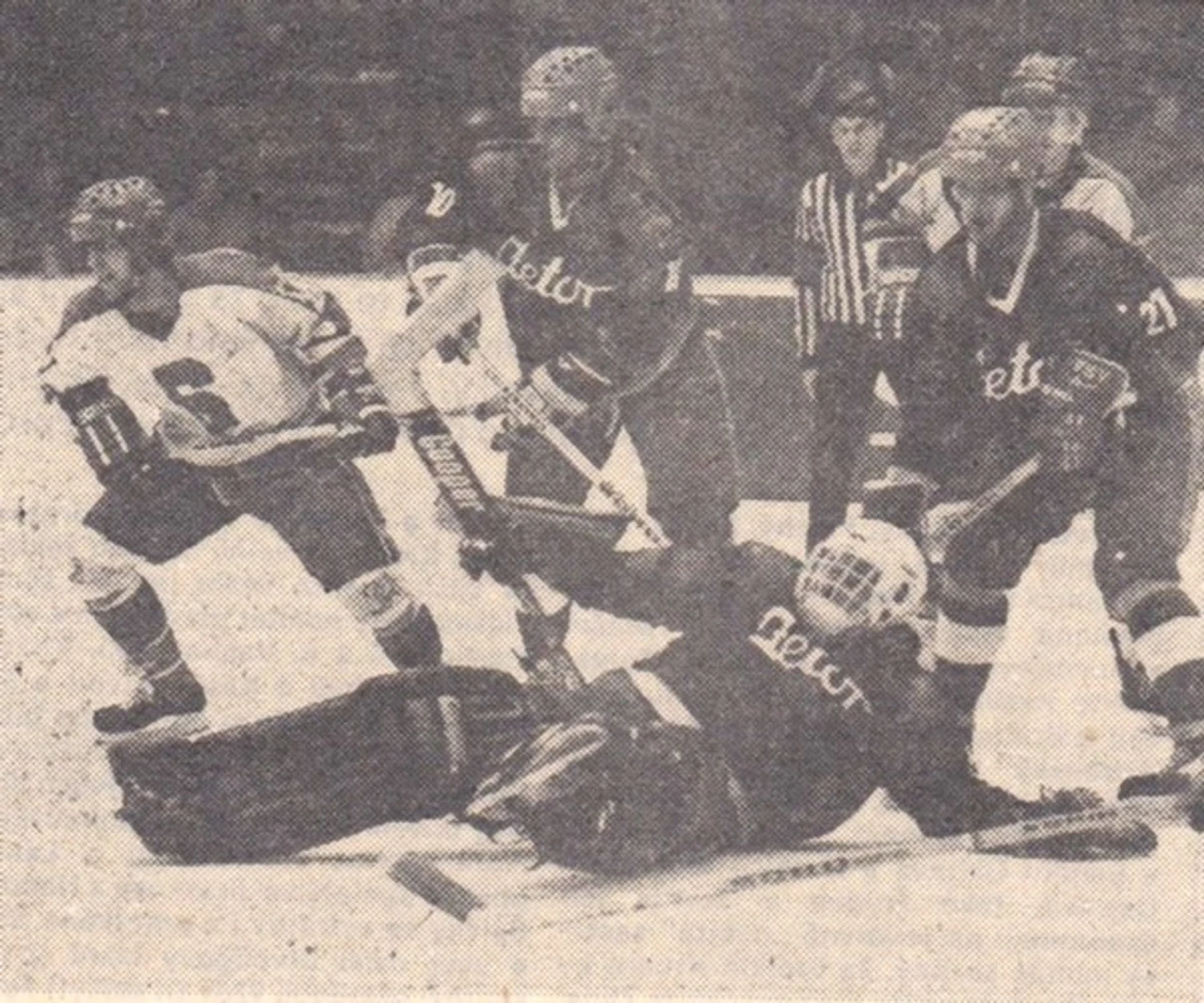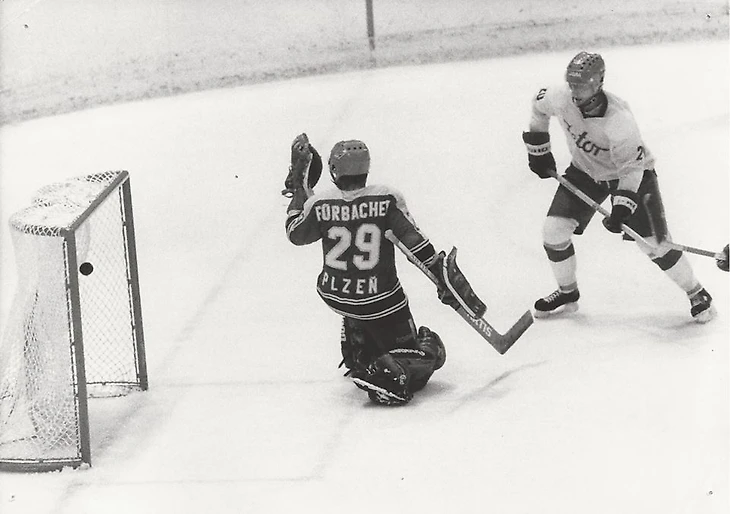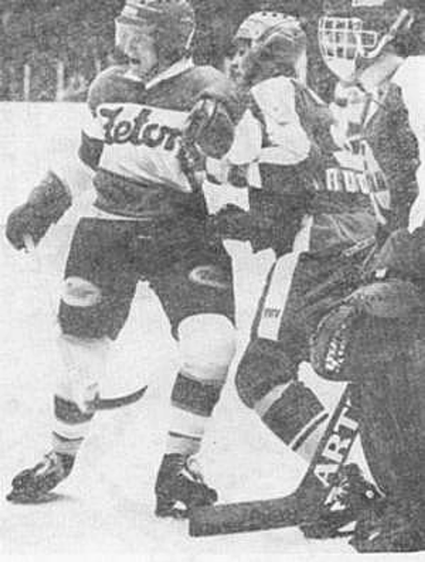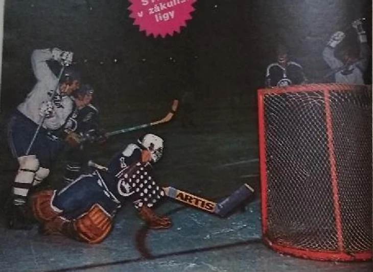 25 января 1987 года. «Польди» (Кладно) - «Локомотив-Ингстав» (Брно) - 5:2. Голкипер гостей Либор Спурны против Мартина Кутхана (№ 14) и Милана Новы (№ 6)