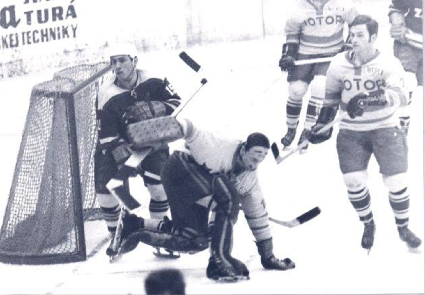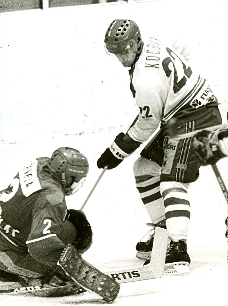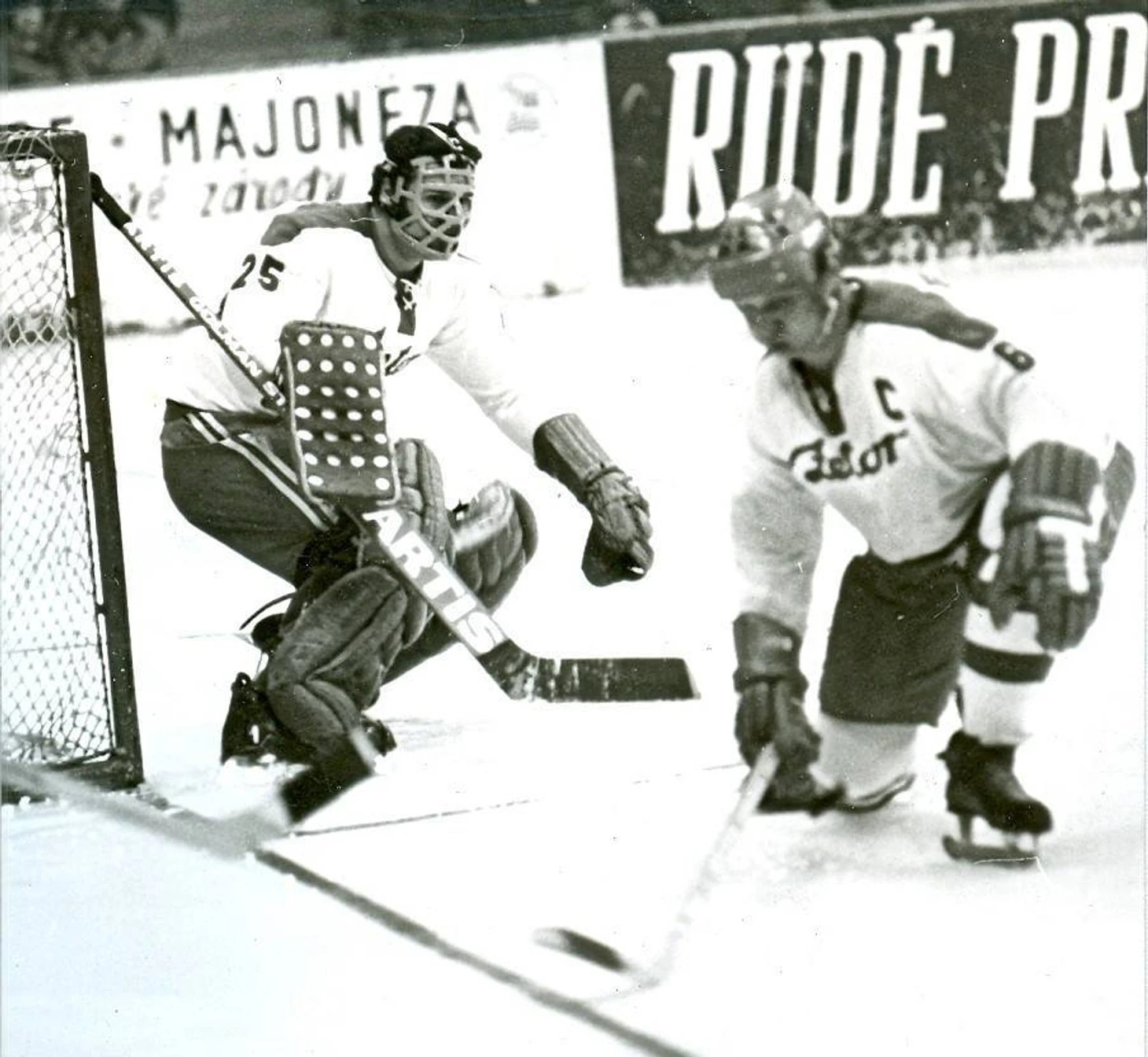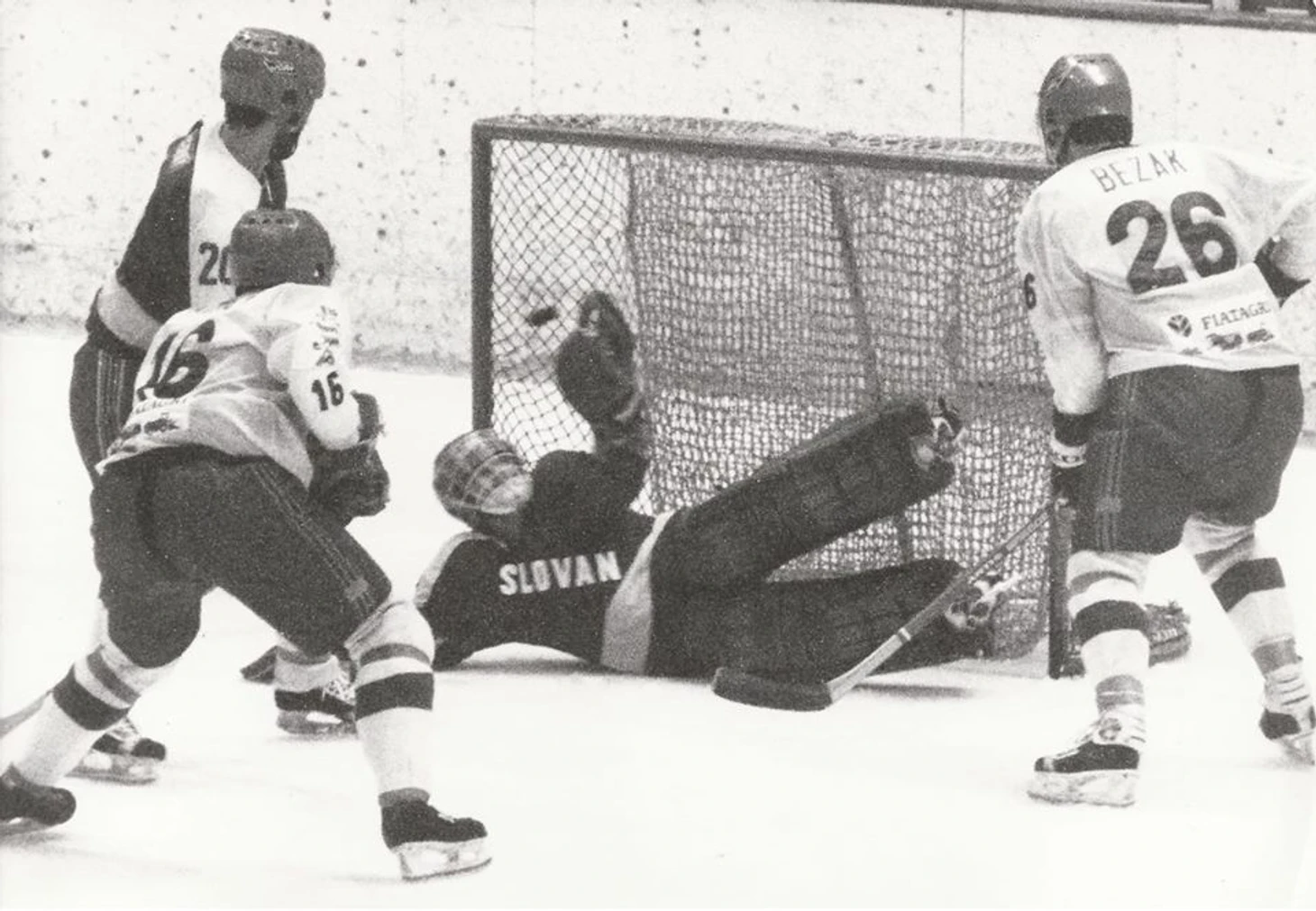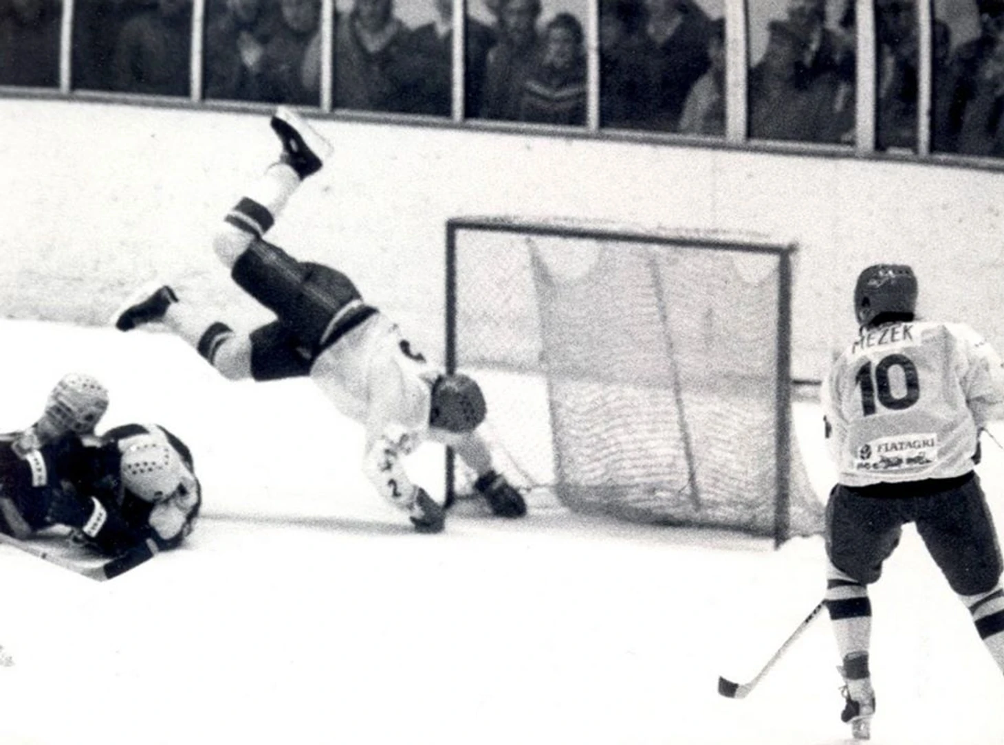 25 января 1987 года. «Польди» (Кладно) - «Локомотив-Ингстав» (Брно) - 5:2. Голкипер гостей Либор Спурны против Мартина Кутхана (№ 14) и Милана Новы (№ 6)