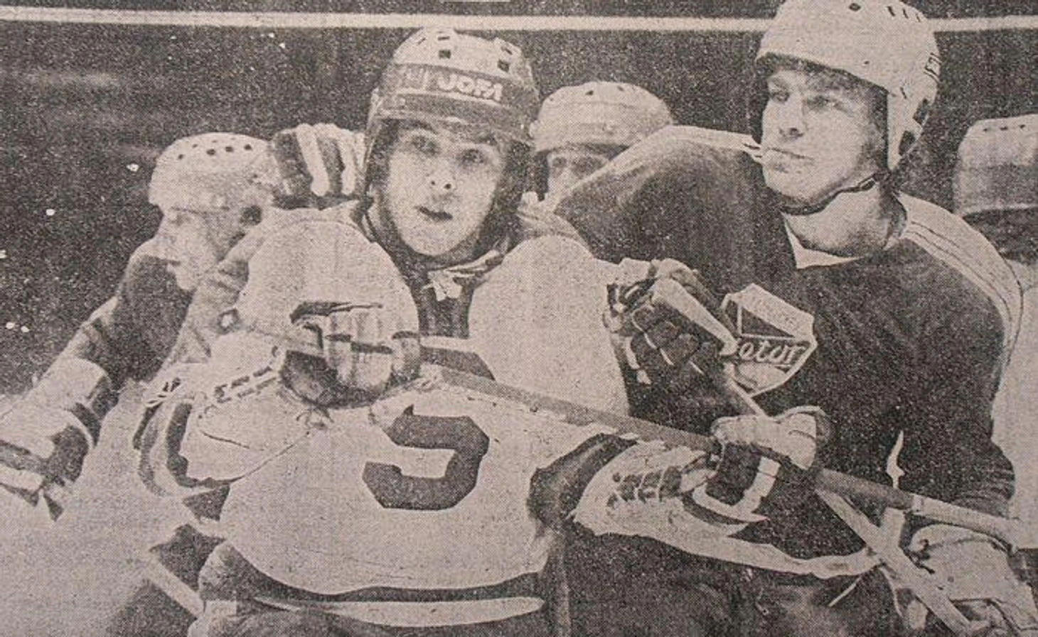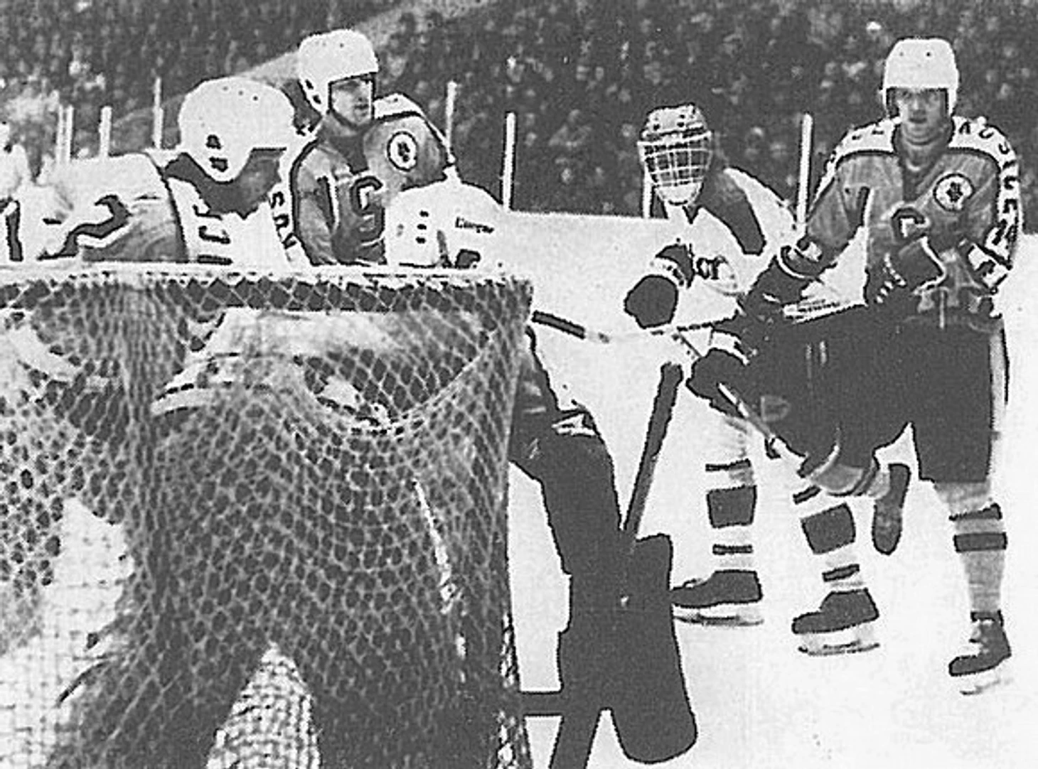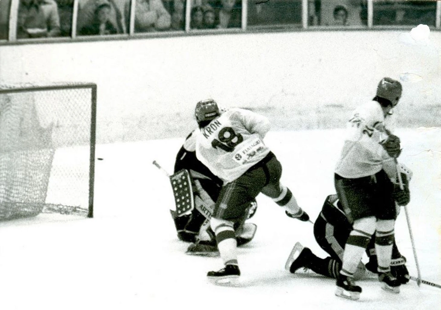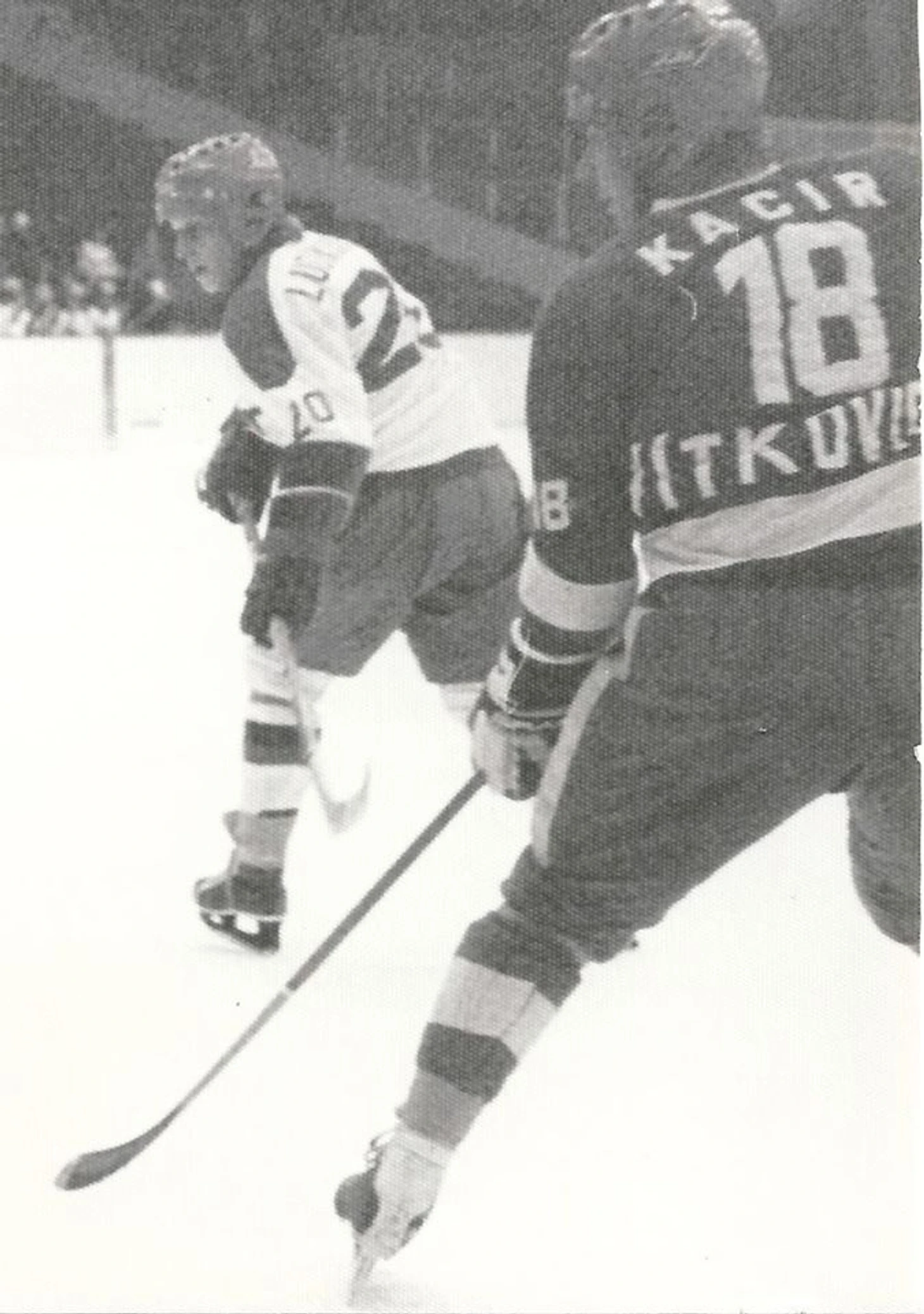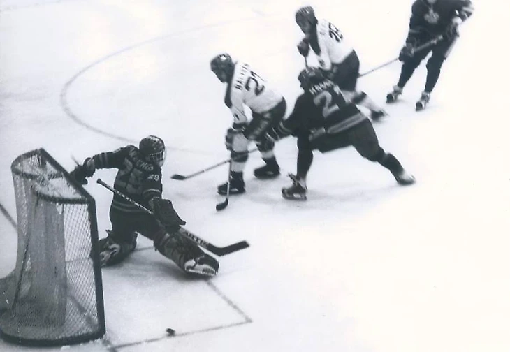25 января 1987 года. «Польди» (Кладно) - «Локомотив-Ингстав» (Брно) - 5:2. Голкипер гостей Либор Спурны против Мартина Кутхана (№ 14) и Милана Новы (№ 6)