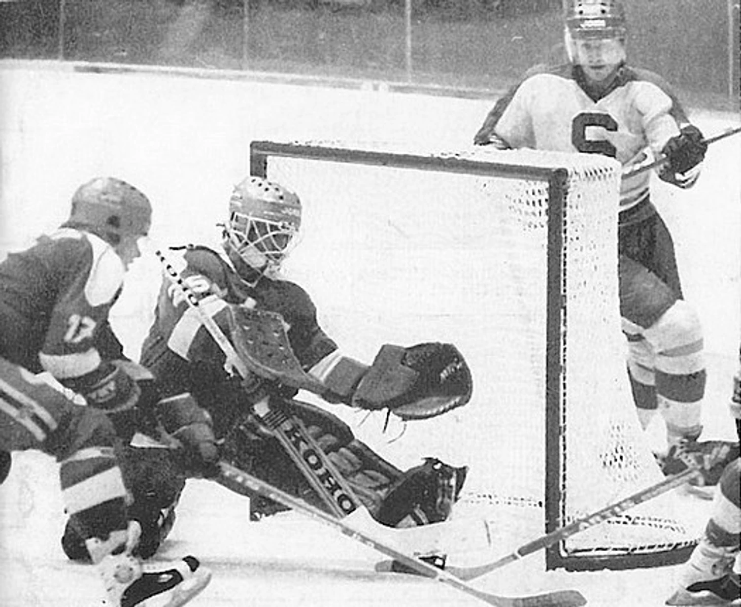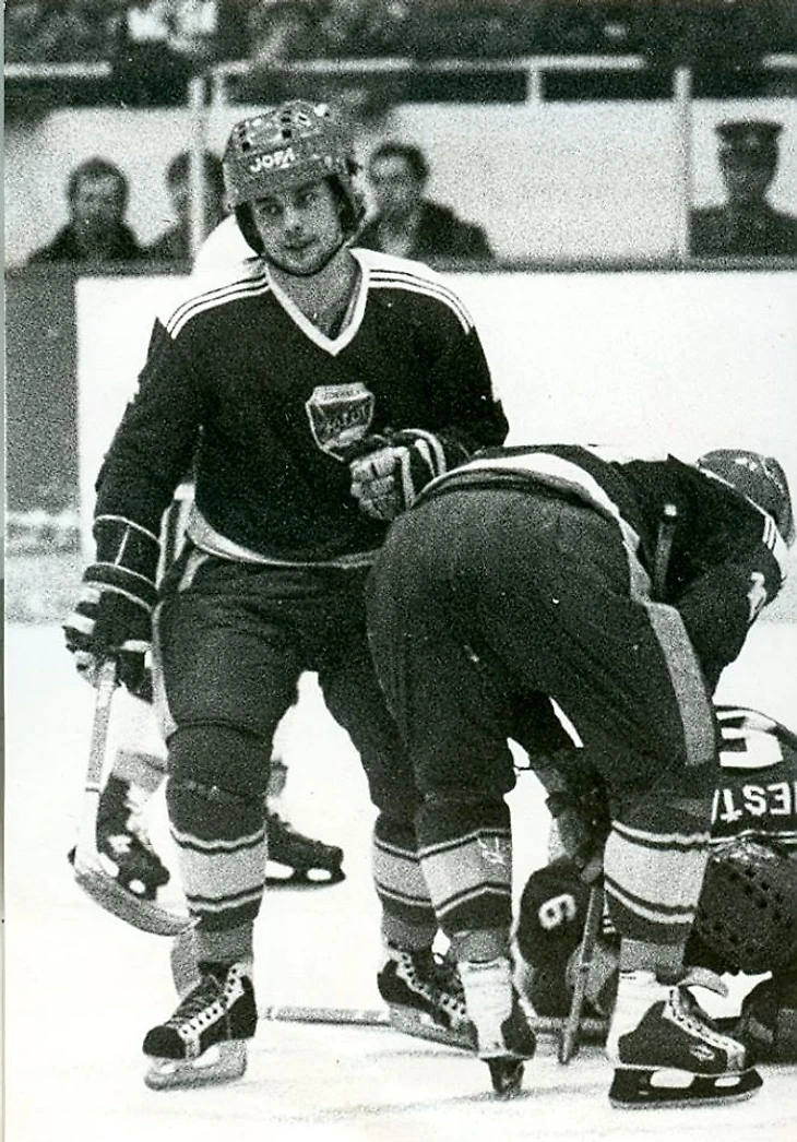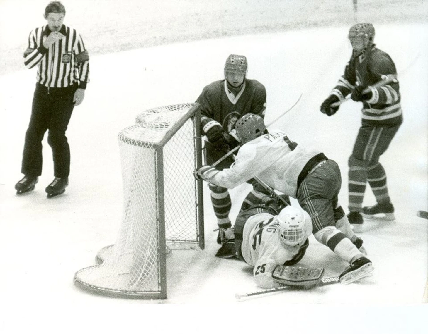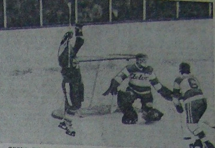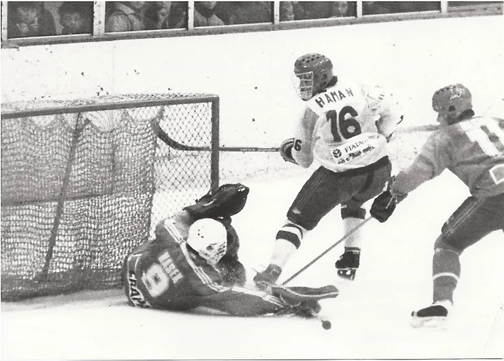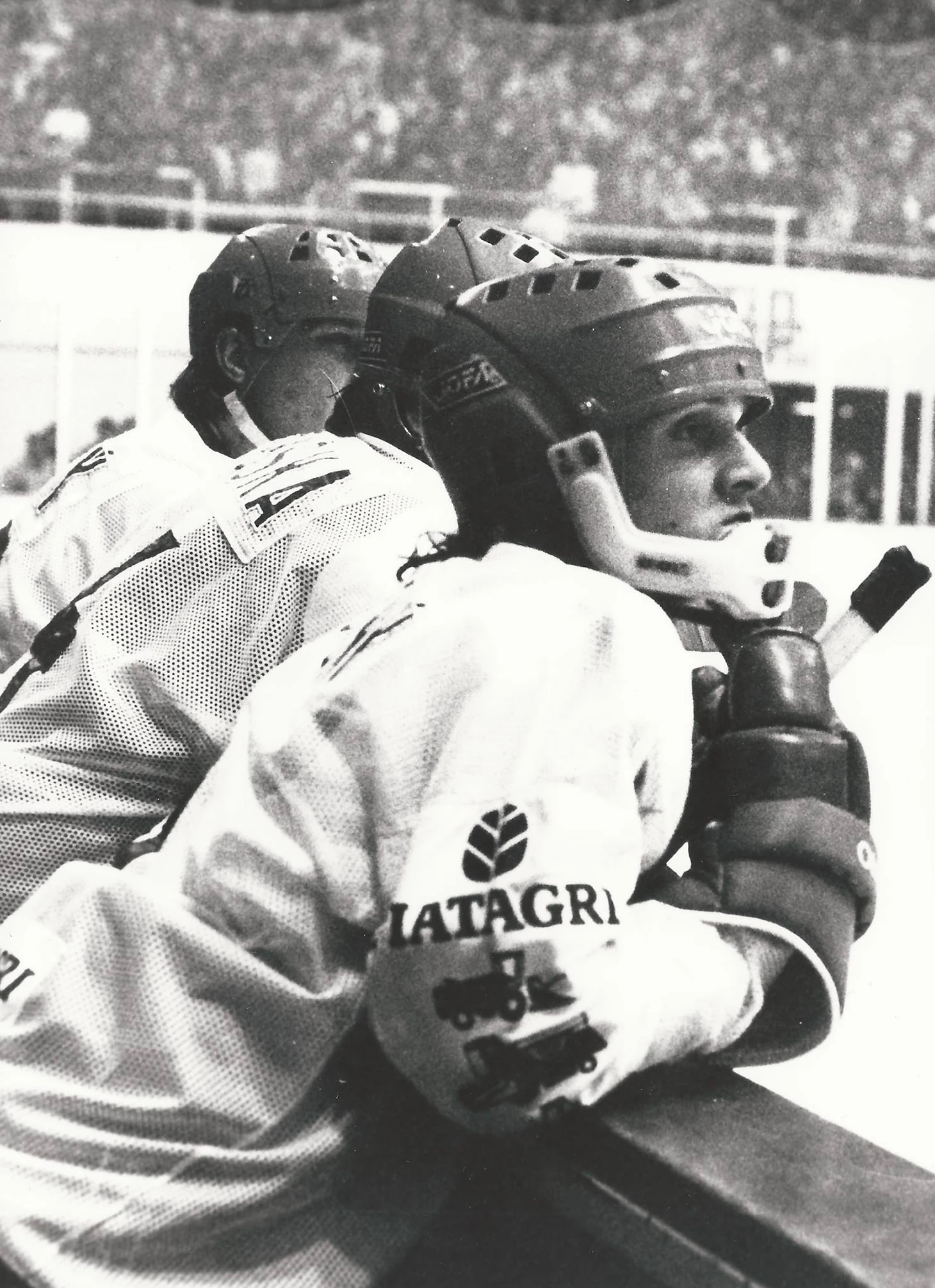 25 января 1987 года. «Польди» (Кладно) - «Локомотив-Ингстав» (Брно) - 5:2. Голкипер гостей Либор Спурны против Мартина Кутхана (№ 14) и Милана Новы (№ 6)