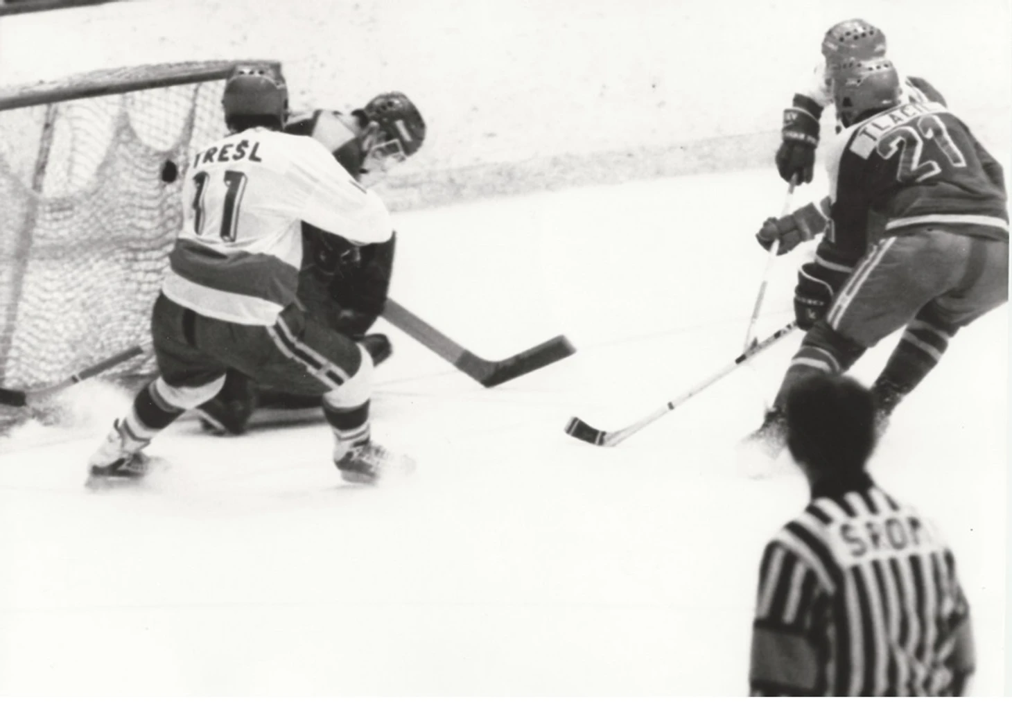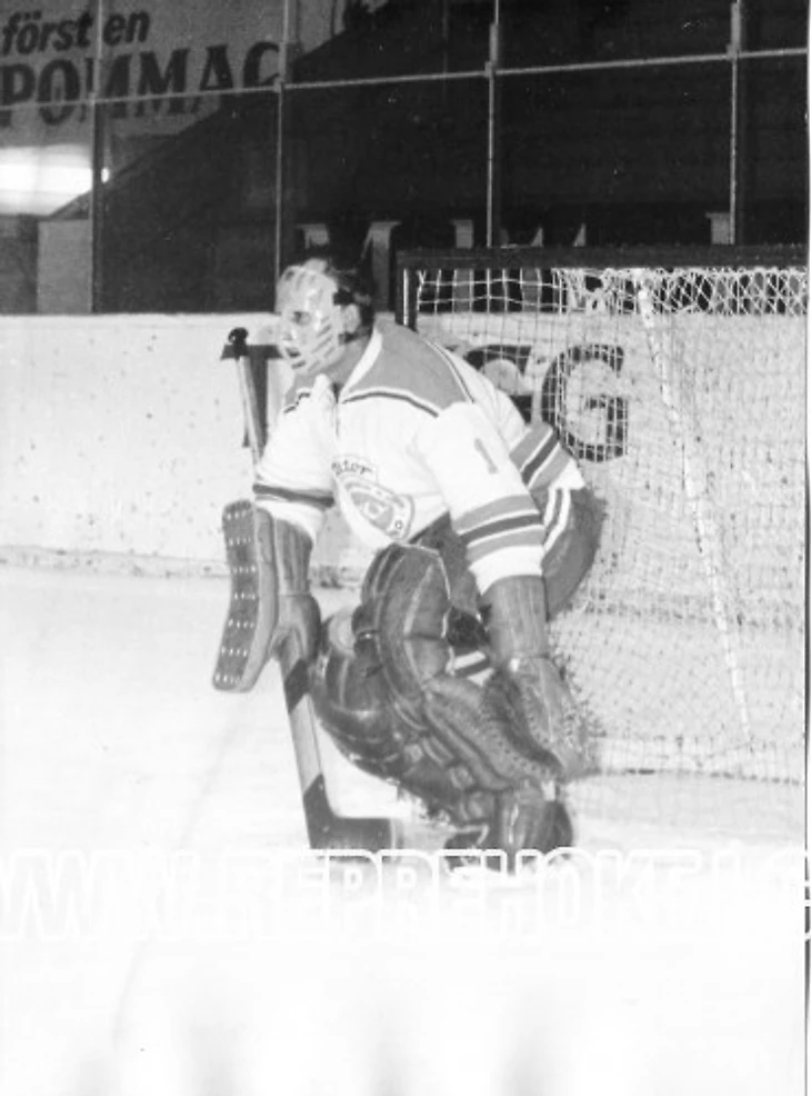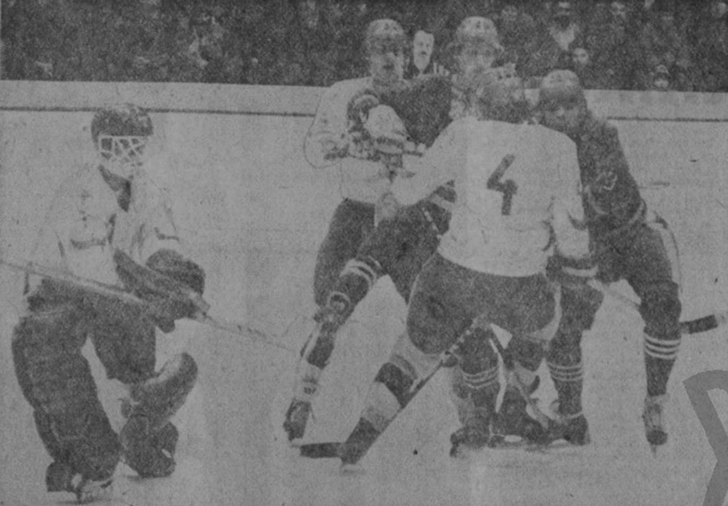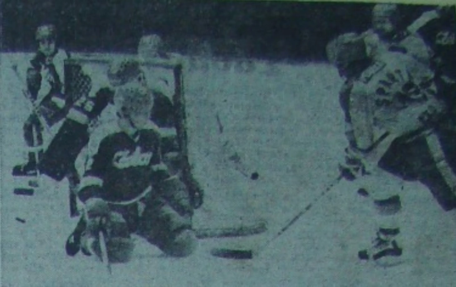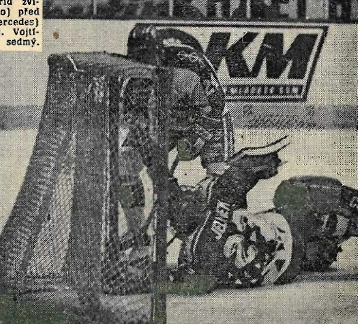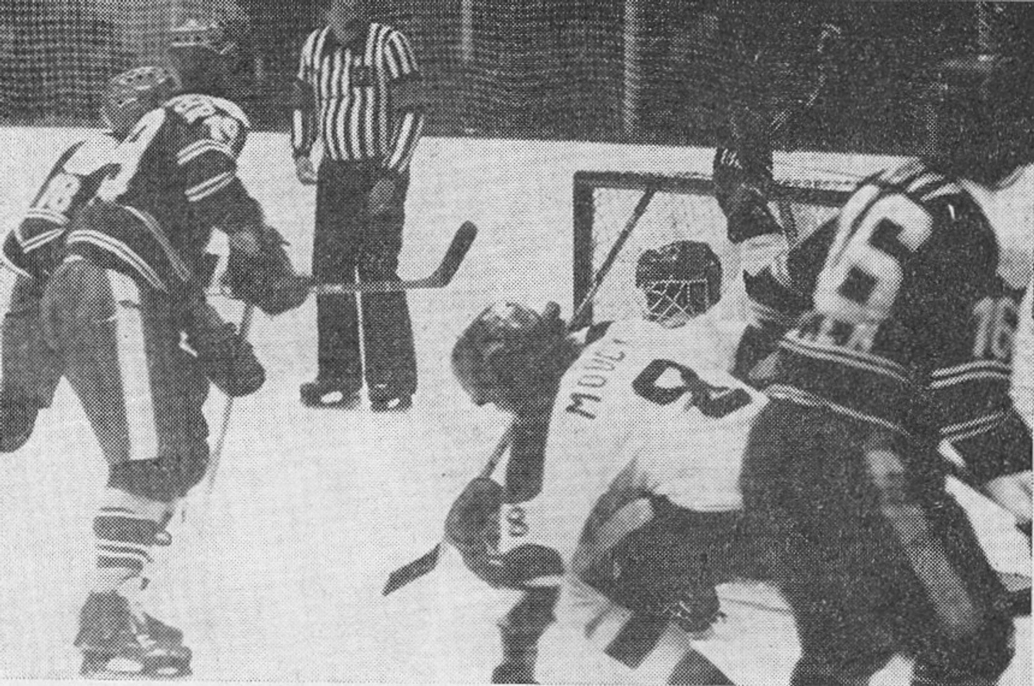 25 января 1987 года. «Польди» (Кладно) - «Локомотив-Ингстав» (Брно) - 5:2. Голкипер гостей Либор Спурны против Мартина Кутхана (№ 14) и Милана Новы (№ 6)