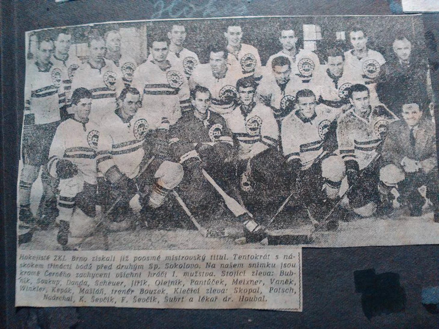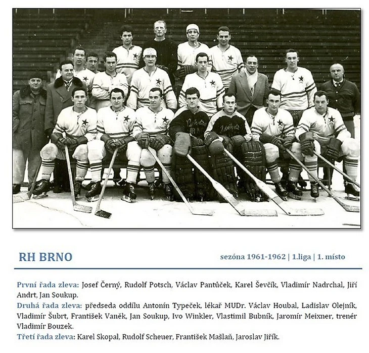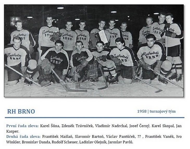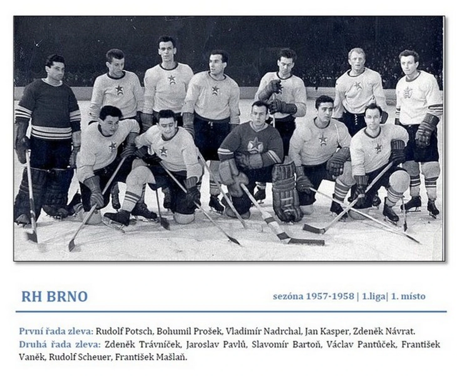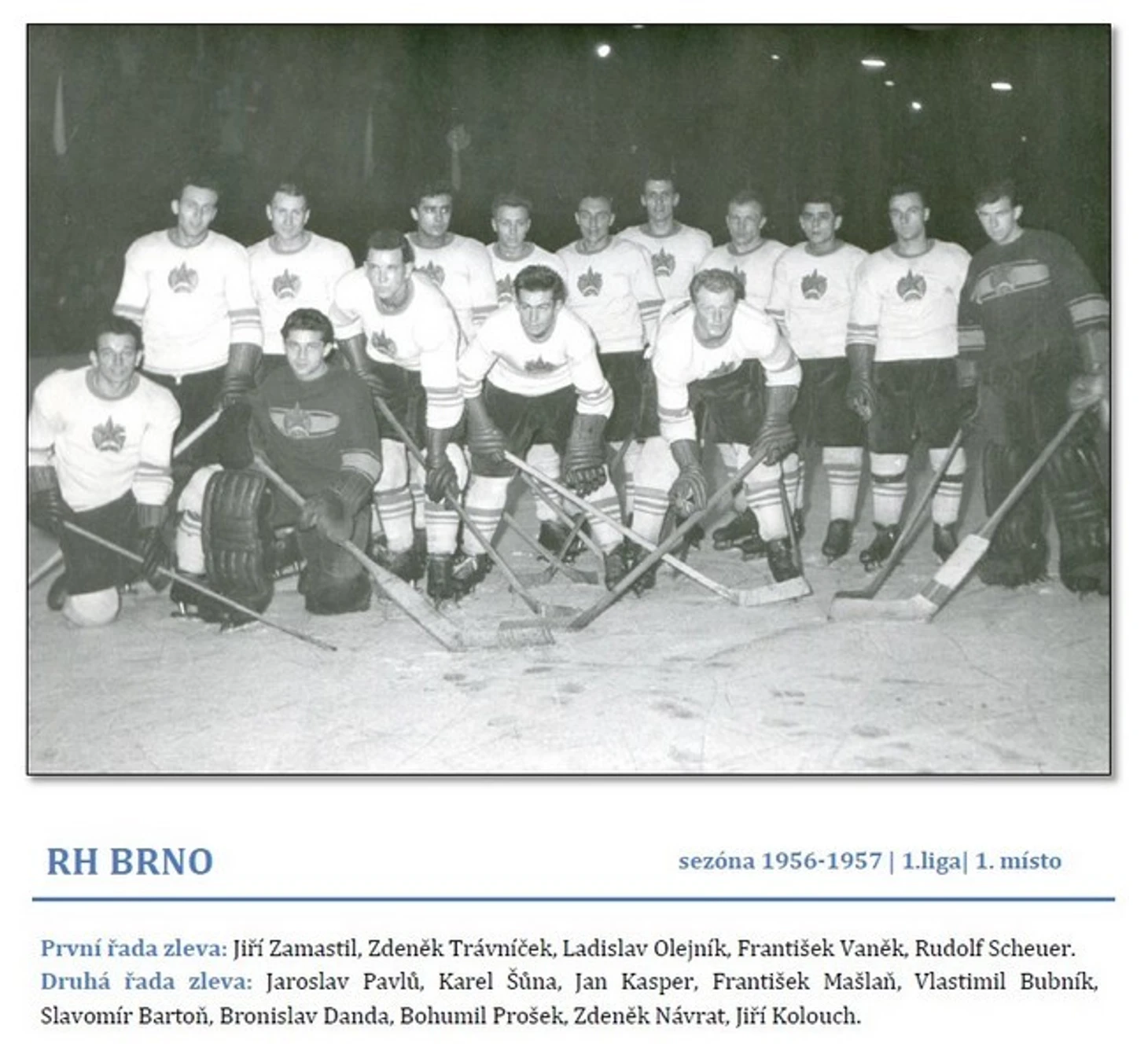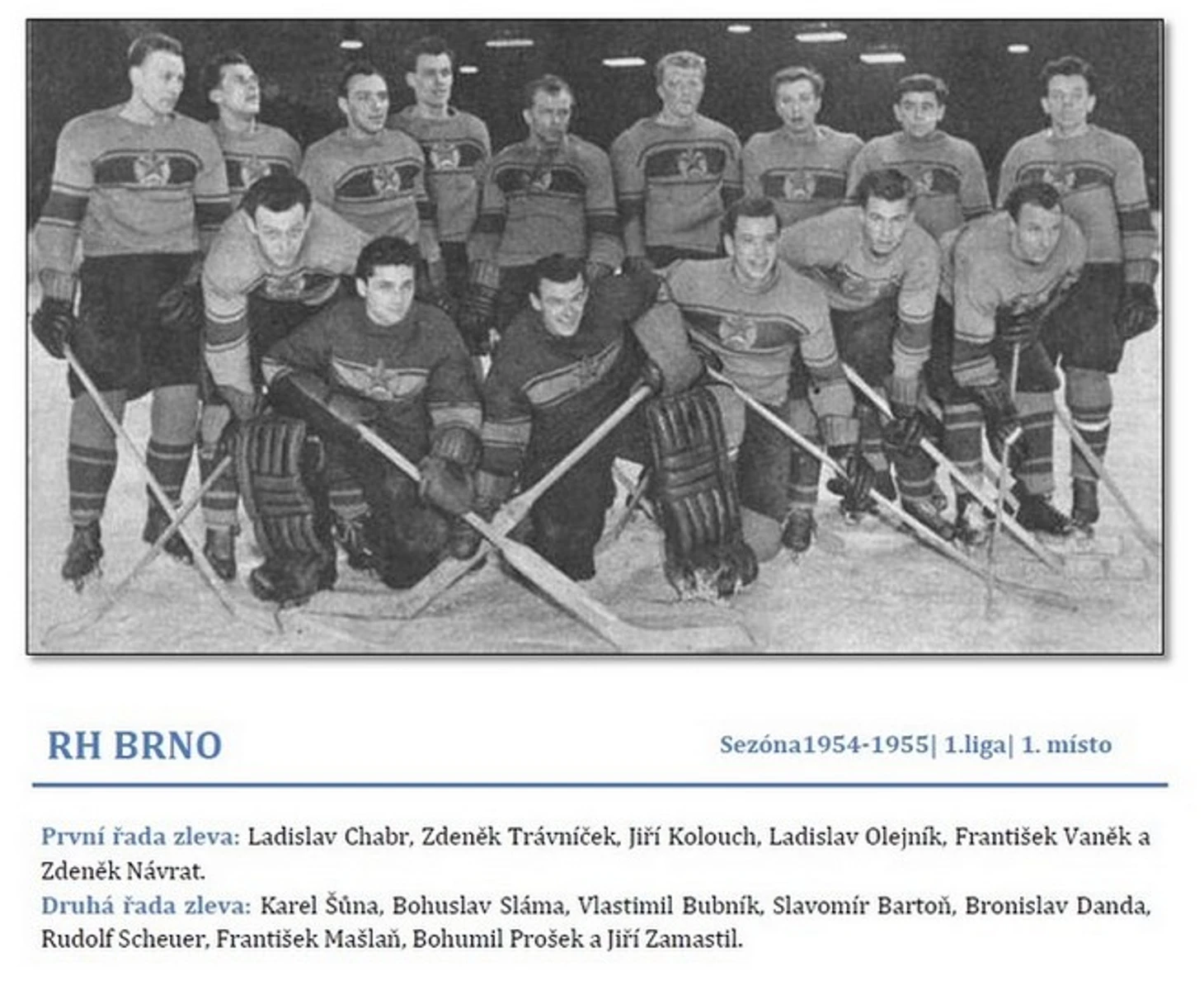 31 декабря 1955 года. Давос. Кубок Шпенглера. «Руда гвезда» (Брно). Нижний ряд (слева направо): Ладислав Хабр, Богуслав Слама, Иржи Колоуч, Иржи Замастил, Зденек Травничек, Рудольф Шойер, Ладислав Олейник. Стоят (слева направо): старший тренер Владимир Бозек, неизвестный (возможно, Карел Клима - председатель брененского отделения ДСО «Руда гвезда»), Богумил Прошек, Карел Шуна, Зденек Наврат, Франтишек Ванек, Властимил Бубник, Славомир Бартонь, Бронислав Данда, Ян Каспер, неизвестный