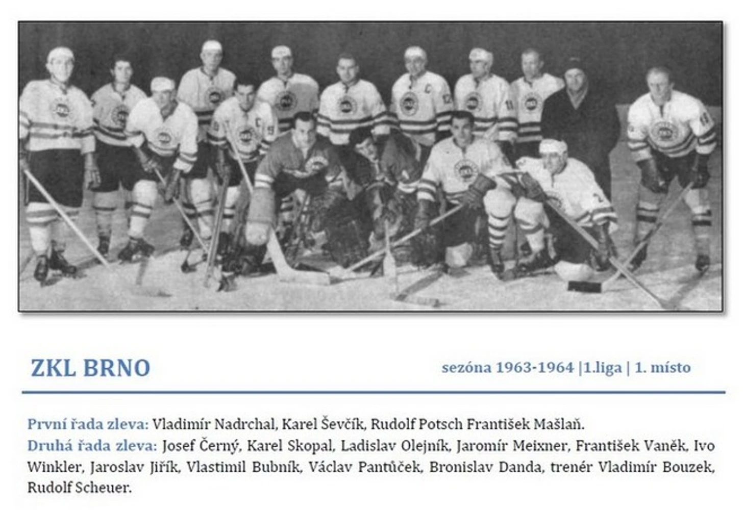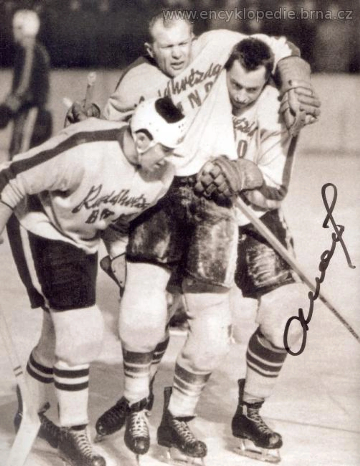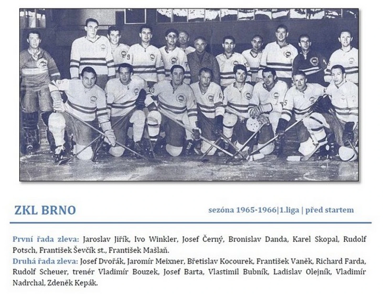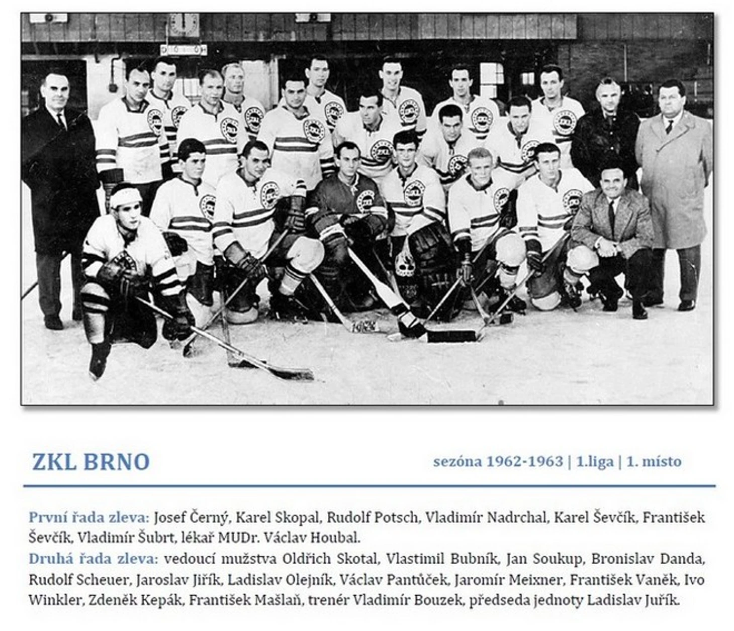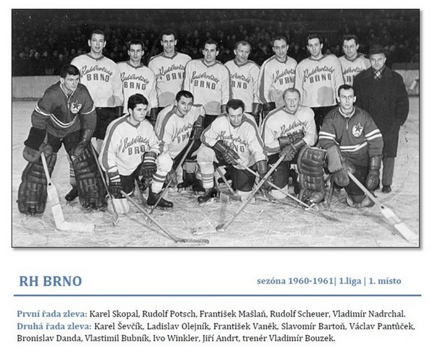 31 декабря 1955 года. Давос. Кубок Шпенглера. «Руда гвезда» (Брно). Нижний ряд (слева направо): Ладислав Хабр, Богуслав Слама, Иржи Колоуч, Иржи Замастил, Зденек Травничек, Рудольф Шойер, Ладислав Олейник. Стоят (слева направо): старший тренер Владимир Бозек, неизвестный (возможно, Карел Клима - председатель брененского отделения ДСО «Руда гвезда»), Богумил Прошек, Карел Шуна, Зденек Наврат, Франтишек Ванек, Властимил Бубник, Славомир Бартонь, Бронислав Данда, Ян Каспер, неизвестный