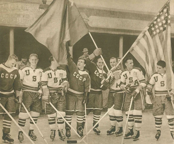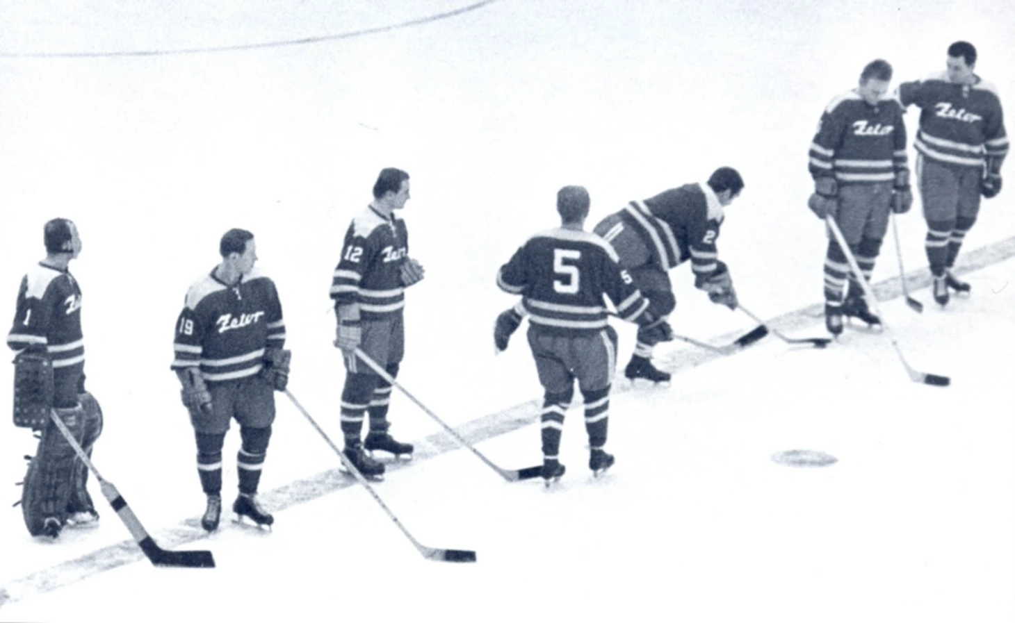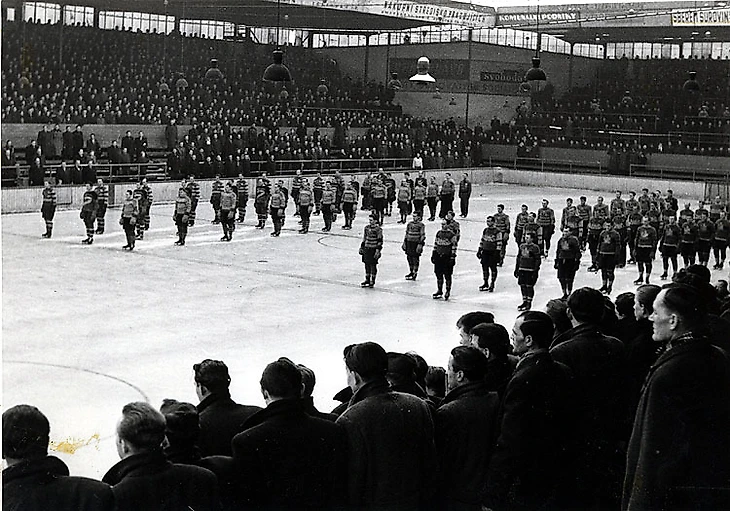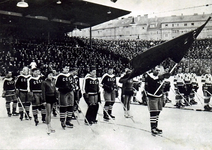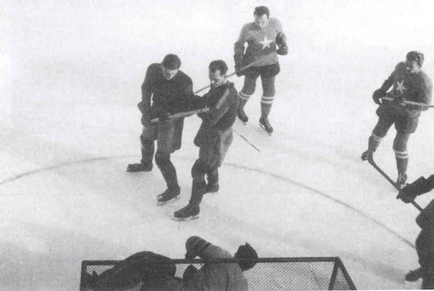 Март 1959 года. Брно. Национальный стадион имени Эдварда Бенеша. Тренировочное поле. Репетиция церемонии открытия. Хоккеисты сборных СССР и США