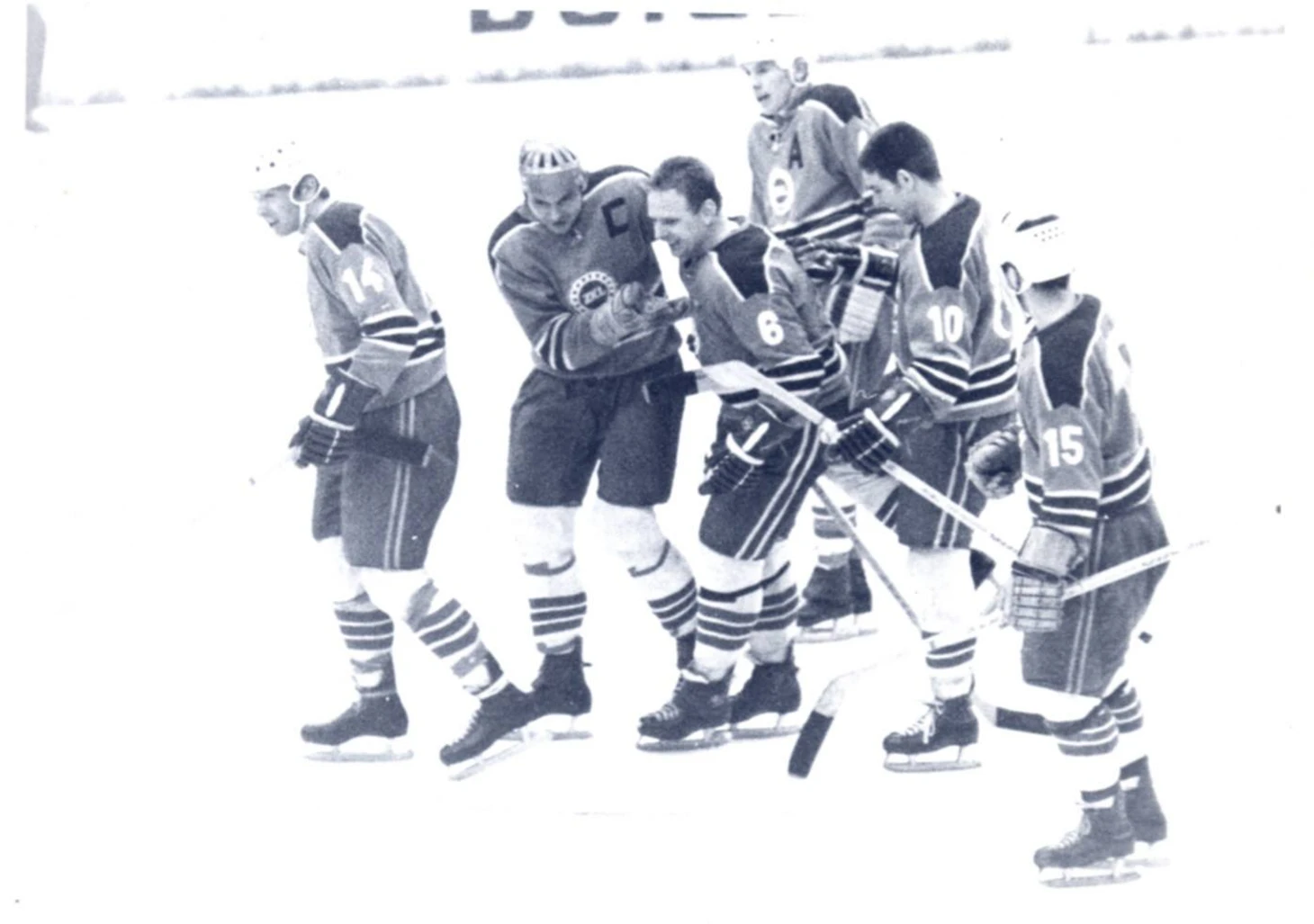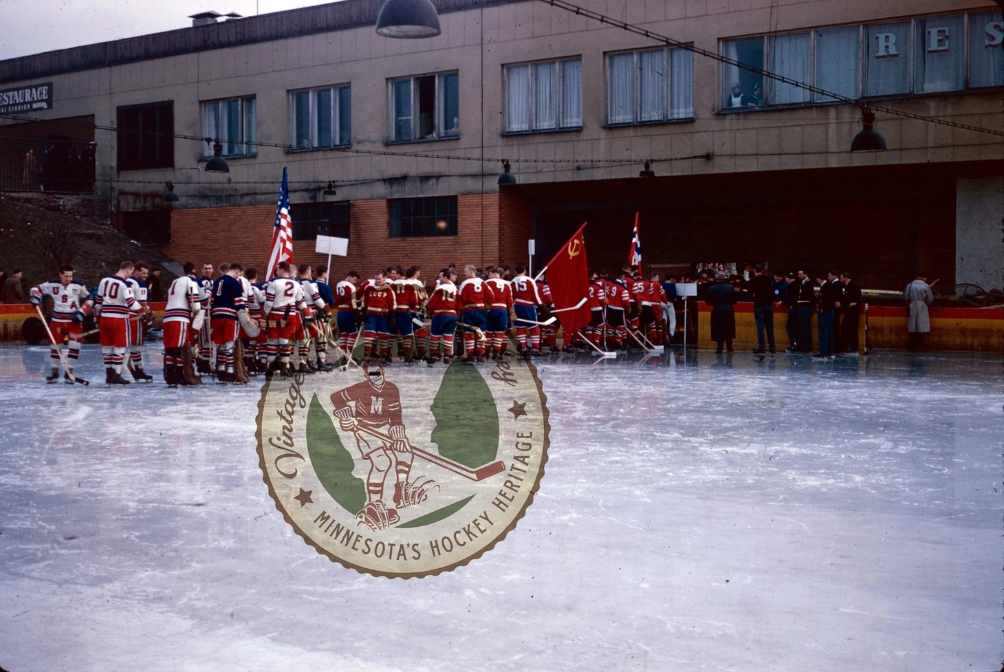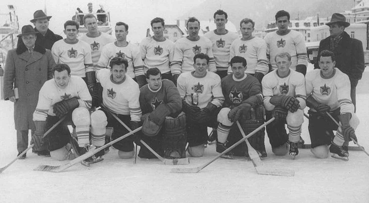 Март 1959 года. Брно. Национальный стадион имени Эдварда Бенеша. Тренировочное поле. Репетиция церемонии открытия. Хоккеисты сборных СССР и США