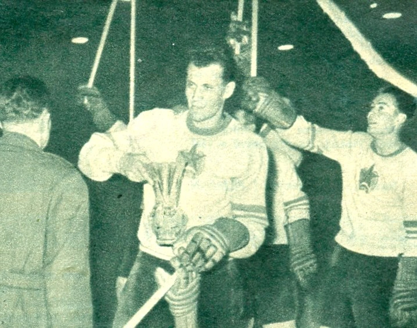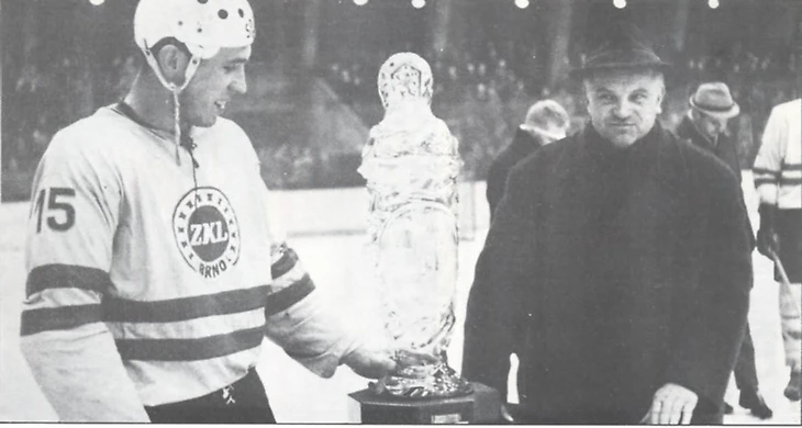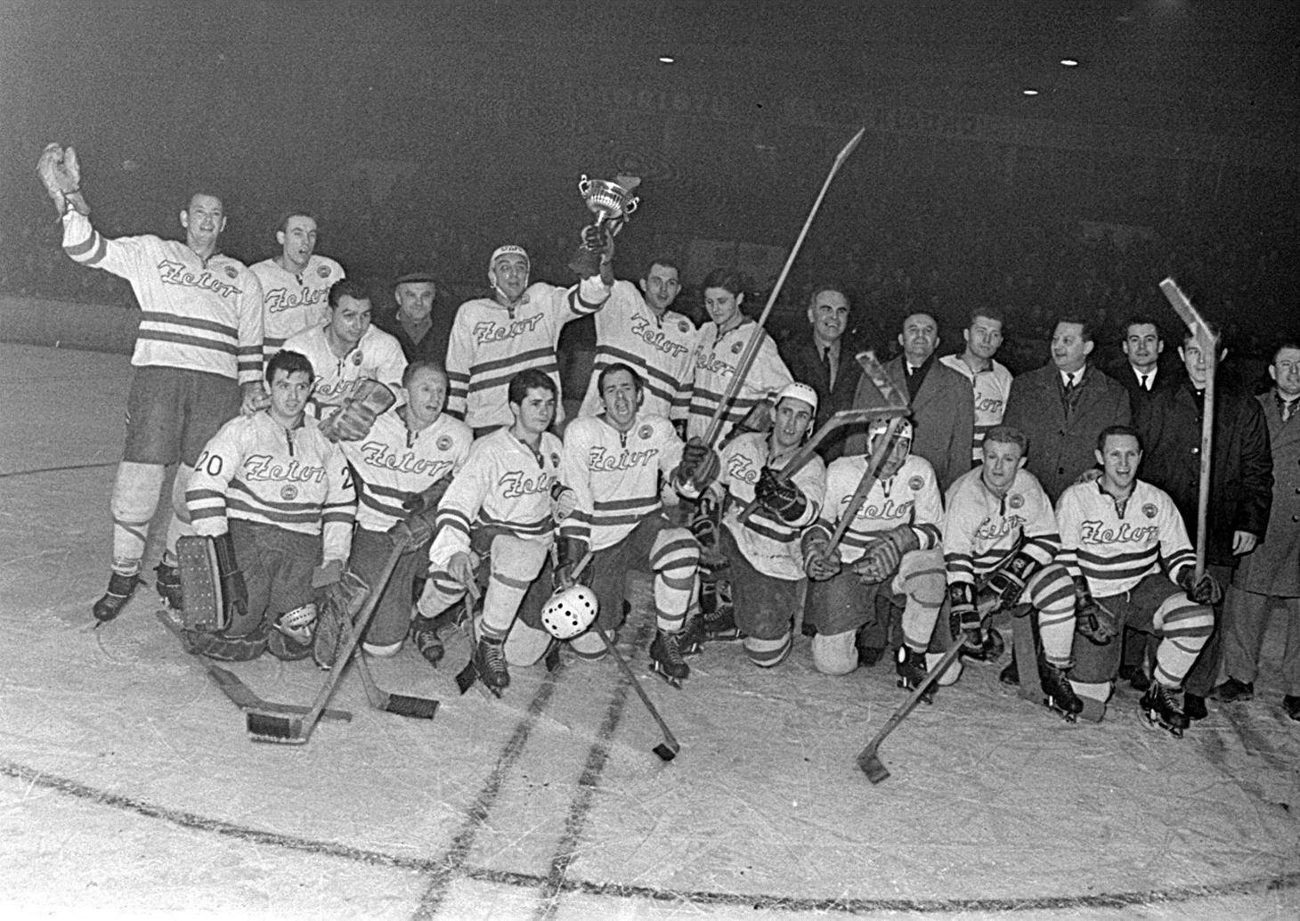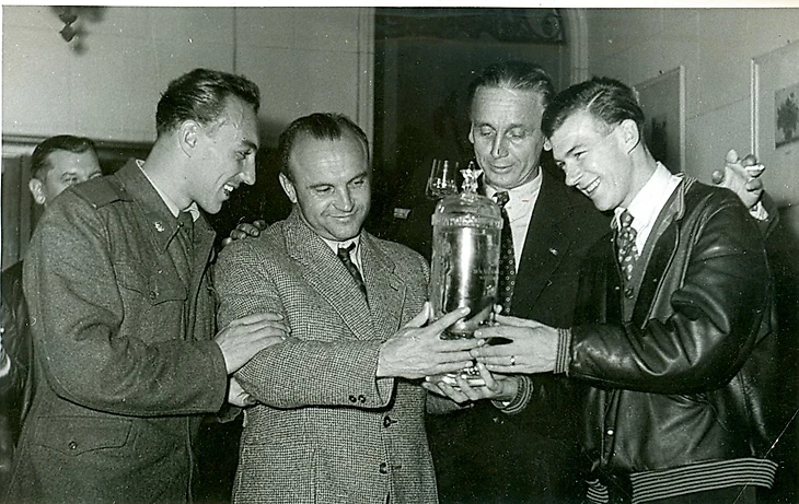 1954-55 (?). Представители «Руда гвезда» - форвард Властимил Бубник, старший тренер Владимир Бузек, председатель брененского отделения ДСО Карел Клима (в 1949-54 годах он возглавлял федерацию хоккей Чехословакии) и вратарь Иржи Колоуч любуются самым первым (?) трофеем в истории команды