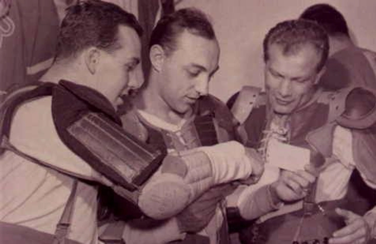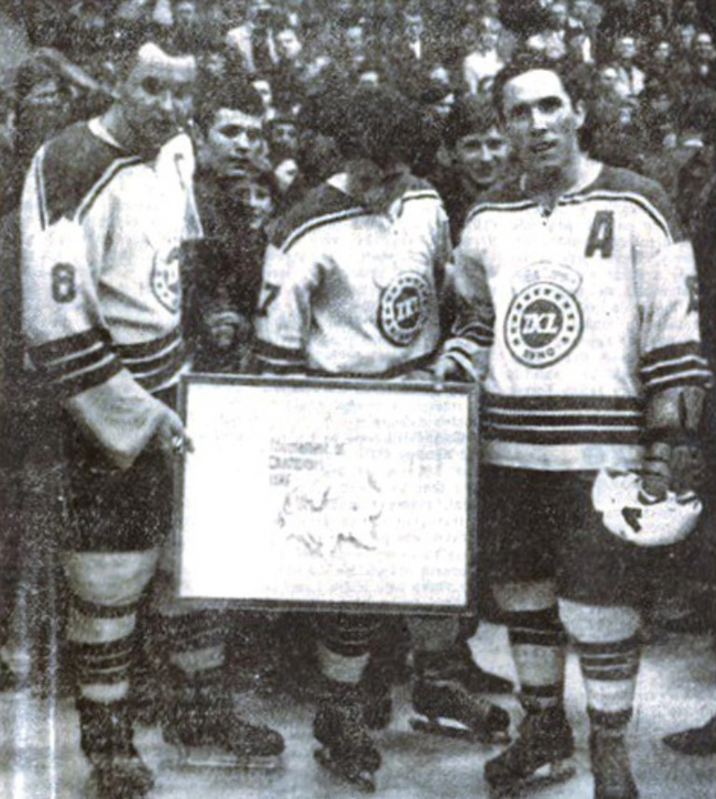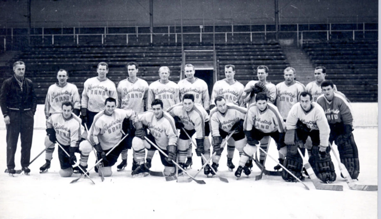 1954-55 (?). Представители «Руда гвезда» - форвард Властимил Бубник, старший тренер Владимир Бузек, председатель брененского отделения ДСО Карел Клима (в 1949-54 годах он возглавлял федерацию хоккей Чехословакии) и вратарь Иржи Колоуч любуются самым первым (?) трофеем в истории команды