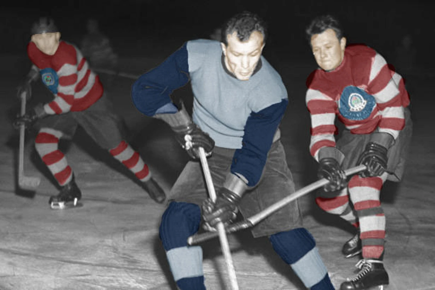 Март 1959 года. Брно. Национальный стадион имени Эдварда Бенеша. Тренировочное поле. Репетиция церемонии открытия. Хоккеисты сборных США, СССР и Норвегии