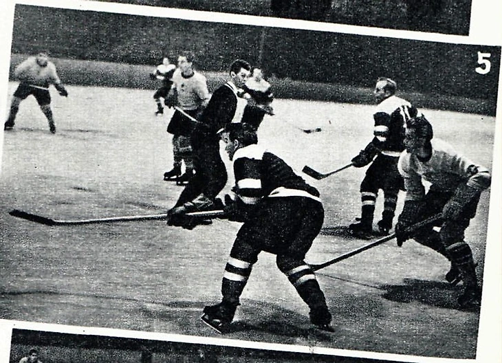 23 декабря 1957 года. «Руда гвезда» (Брно) - «Динамо» (Москва) - 4:3. Рудольф Шойер (№ 13) и Ярослав Павлу (№2) в борьбе за шайбу с динамовцами Николаем Карповым, Владимиром Юрзиновым и Валентином Чистовым. За ней наблюдают вратарь Владимир Чинов, Виктор Тихонов и Карел Шуна