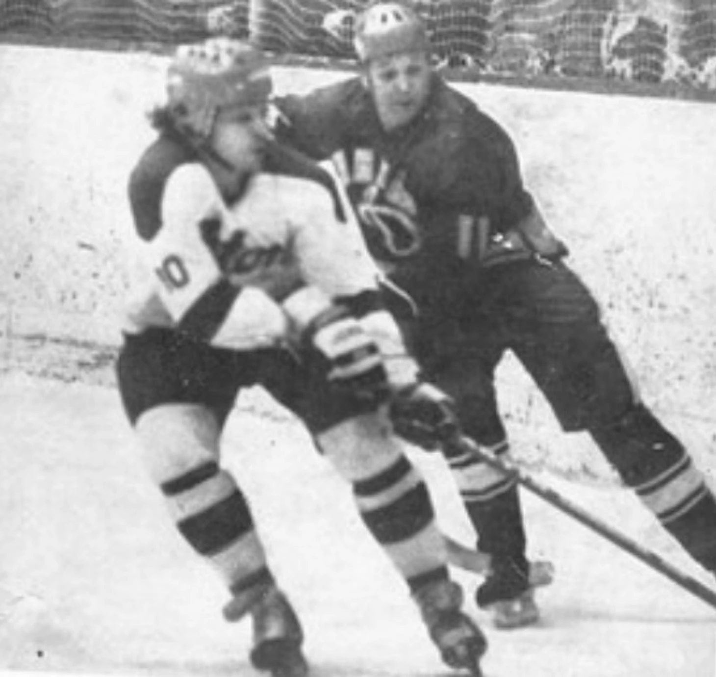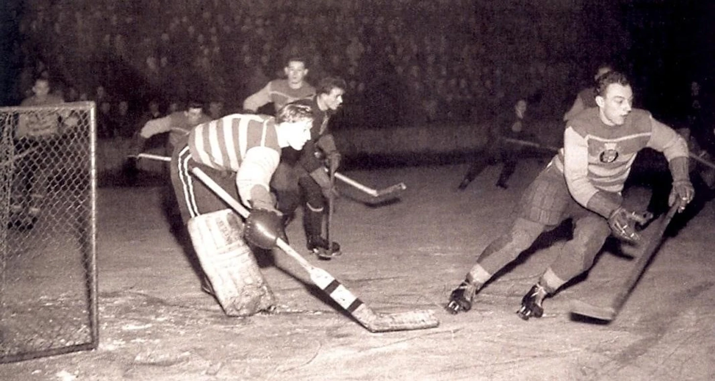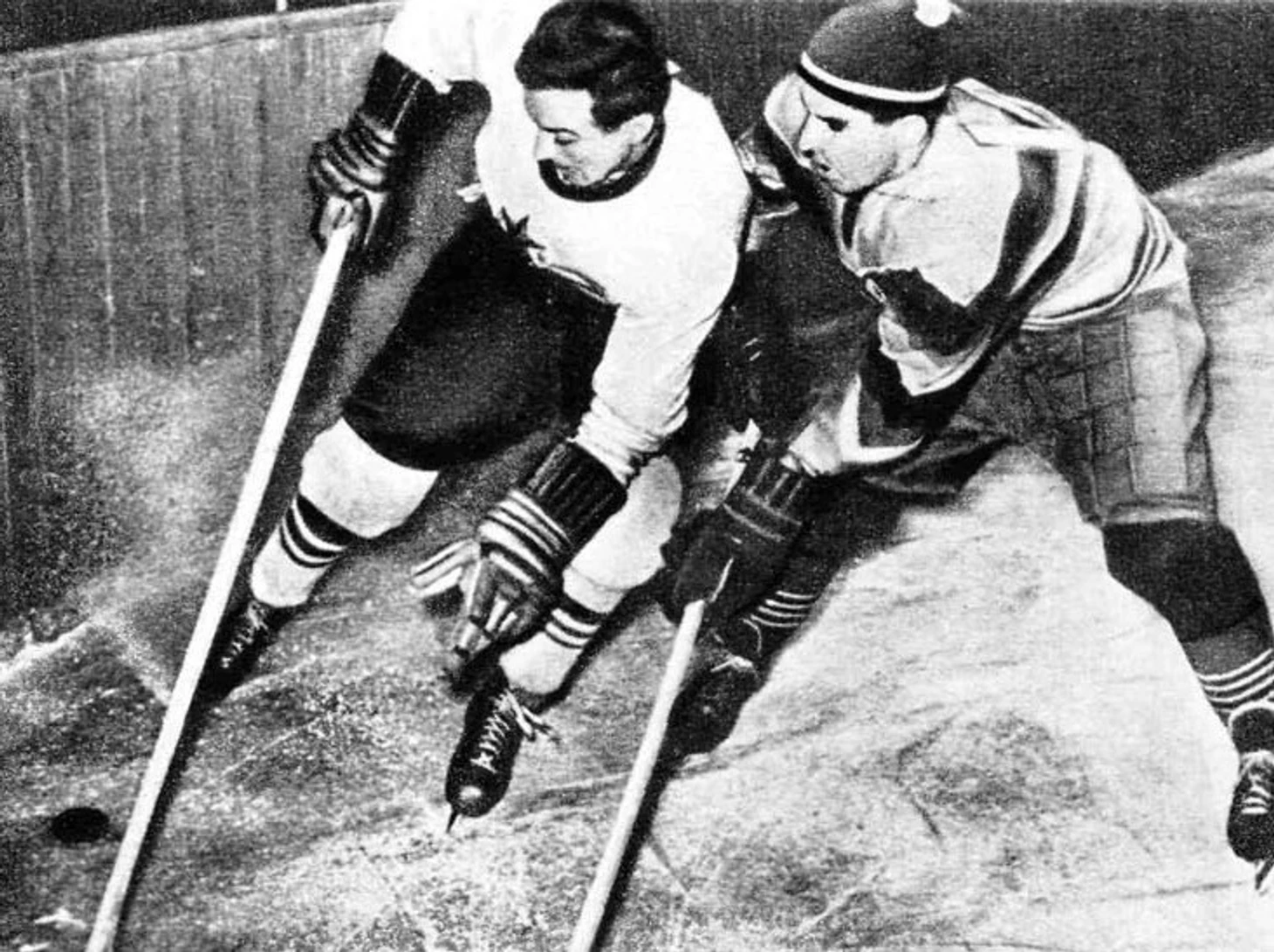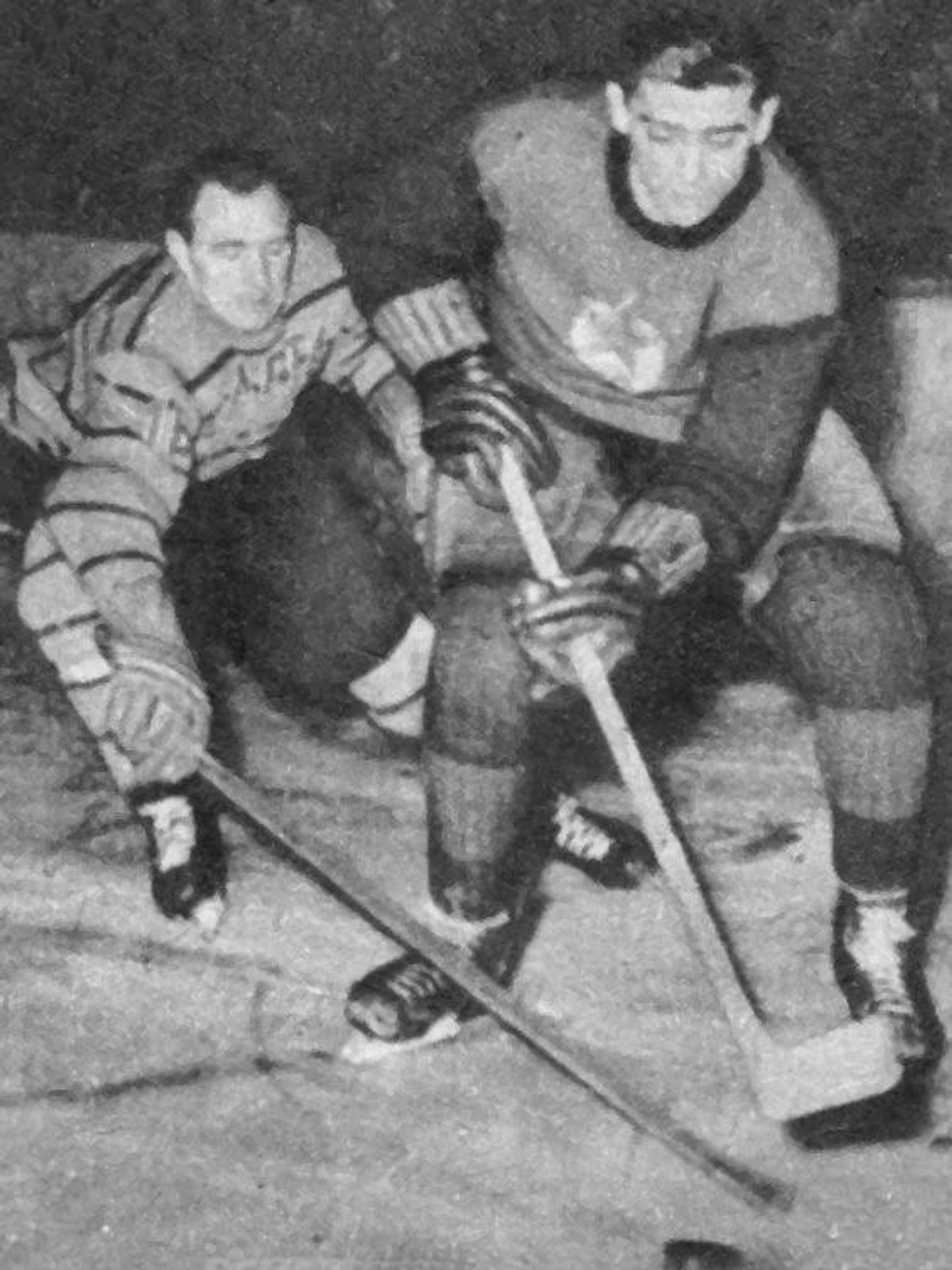 Рубеж 40-50-х годов. Игроки команды «Кралово Поле» (Брно) В. Бубник (слева) и вратарь К. Павлик