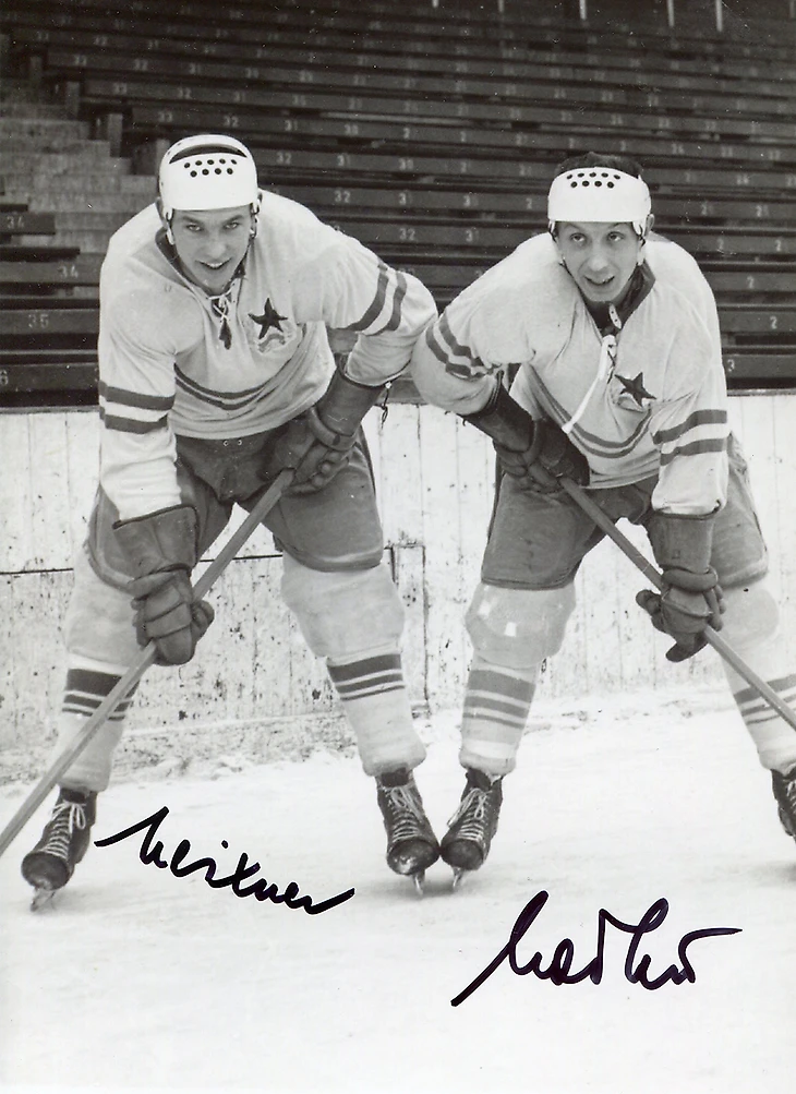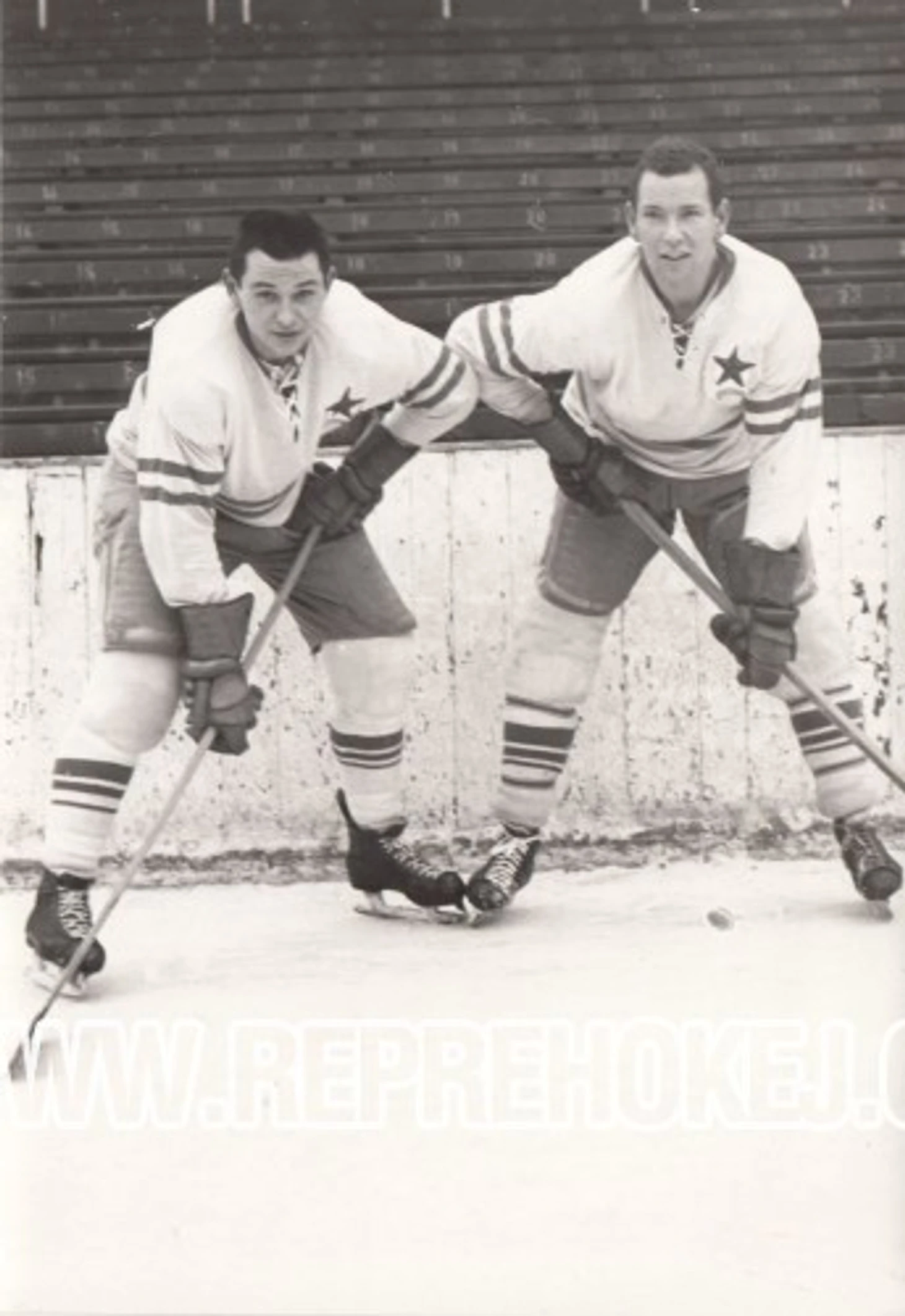 21 октября 1957 года. ЦСК МО - «Руда гвезда» (Брно) - 7:1. Бронислав Данда и Александр Черепанов (фото В. Гребнева)