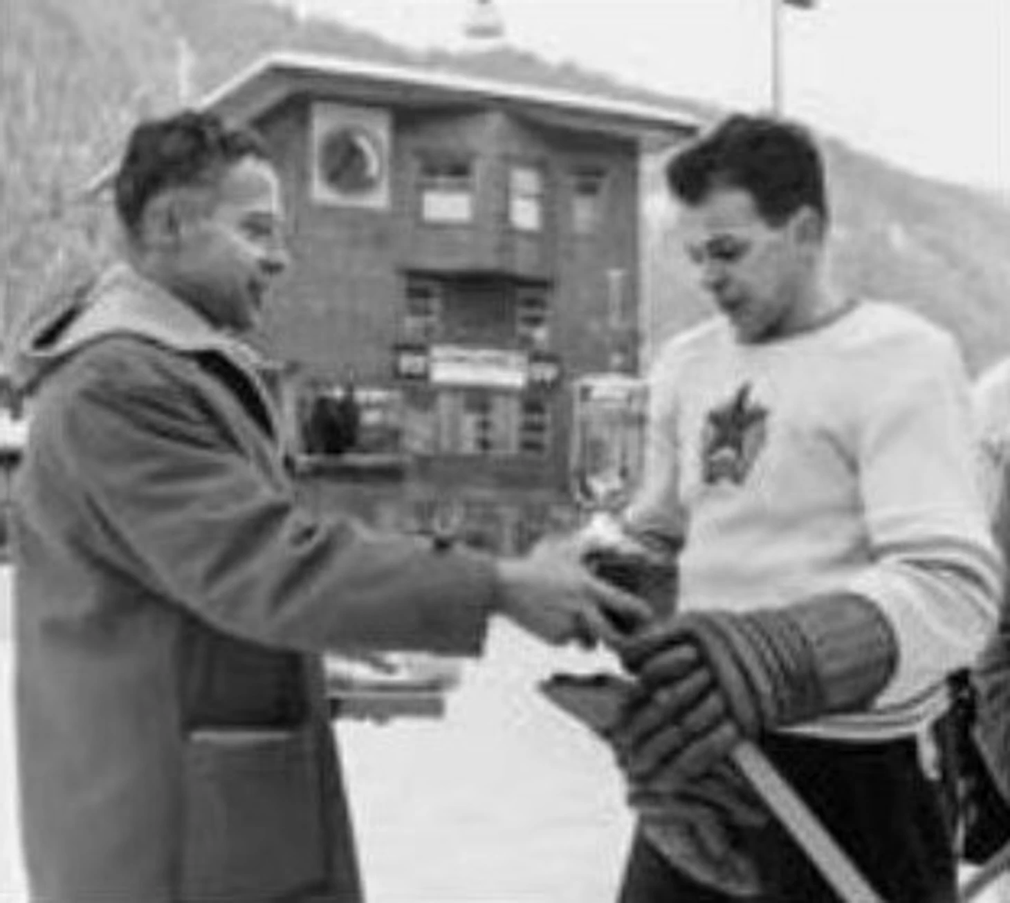 31 декабря 1955 года. Давос. Кубок Шпенглера. Капитан «Руда гвезда» (Брно) Иржи Замастил получает главный приз за победу
