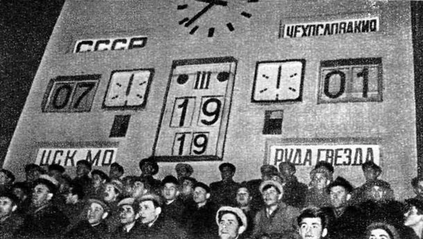 21 октября 1957 года. ЦСК МО - «Руда гвезда» (Брно) - 7:1. Табло отсчитывает последню минуту игры (фото В. Гребнева)