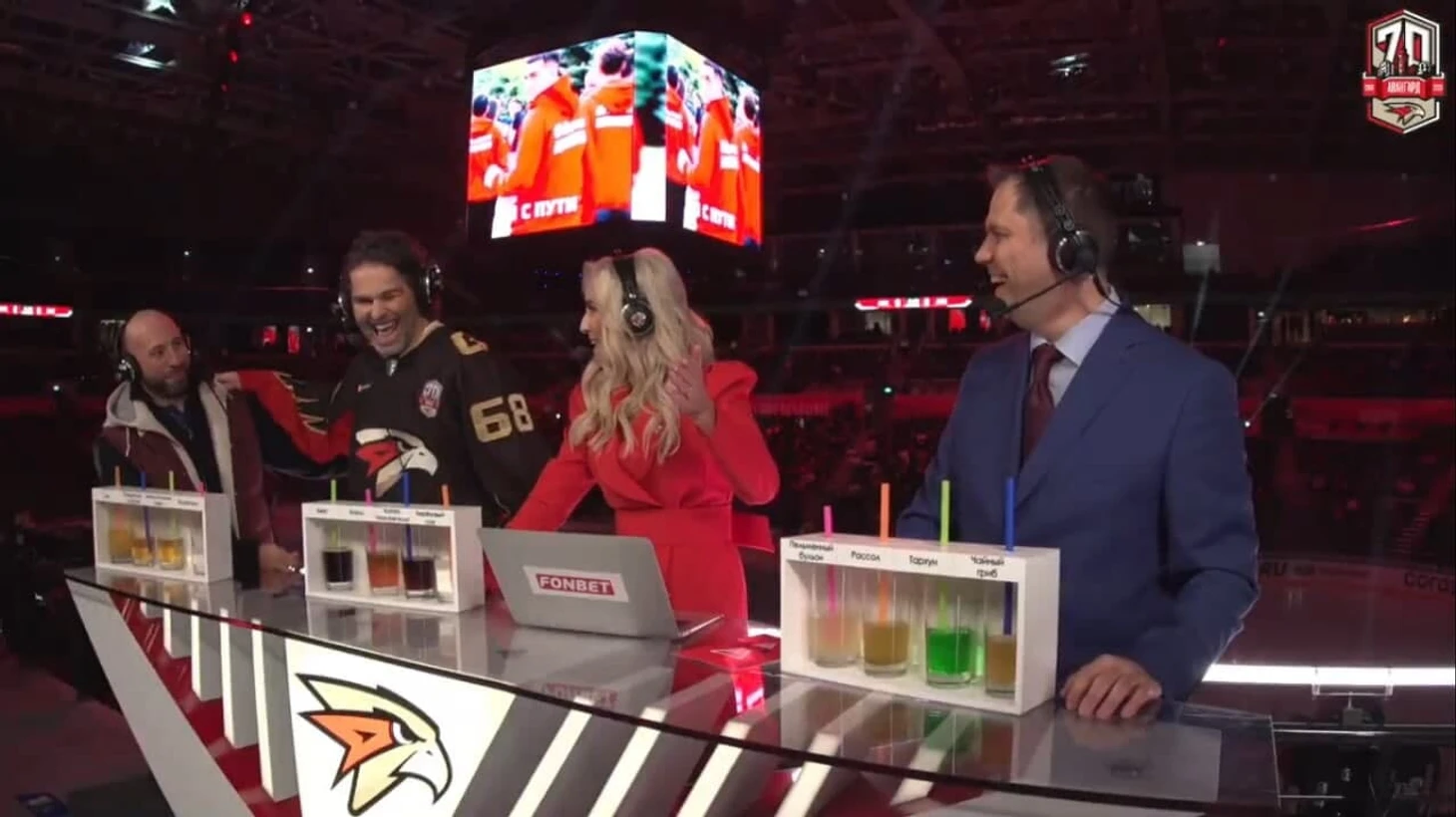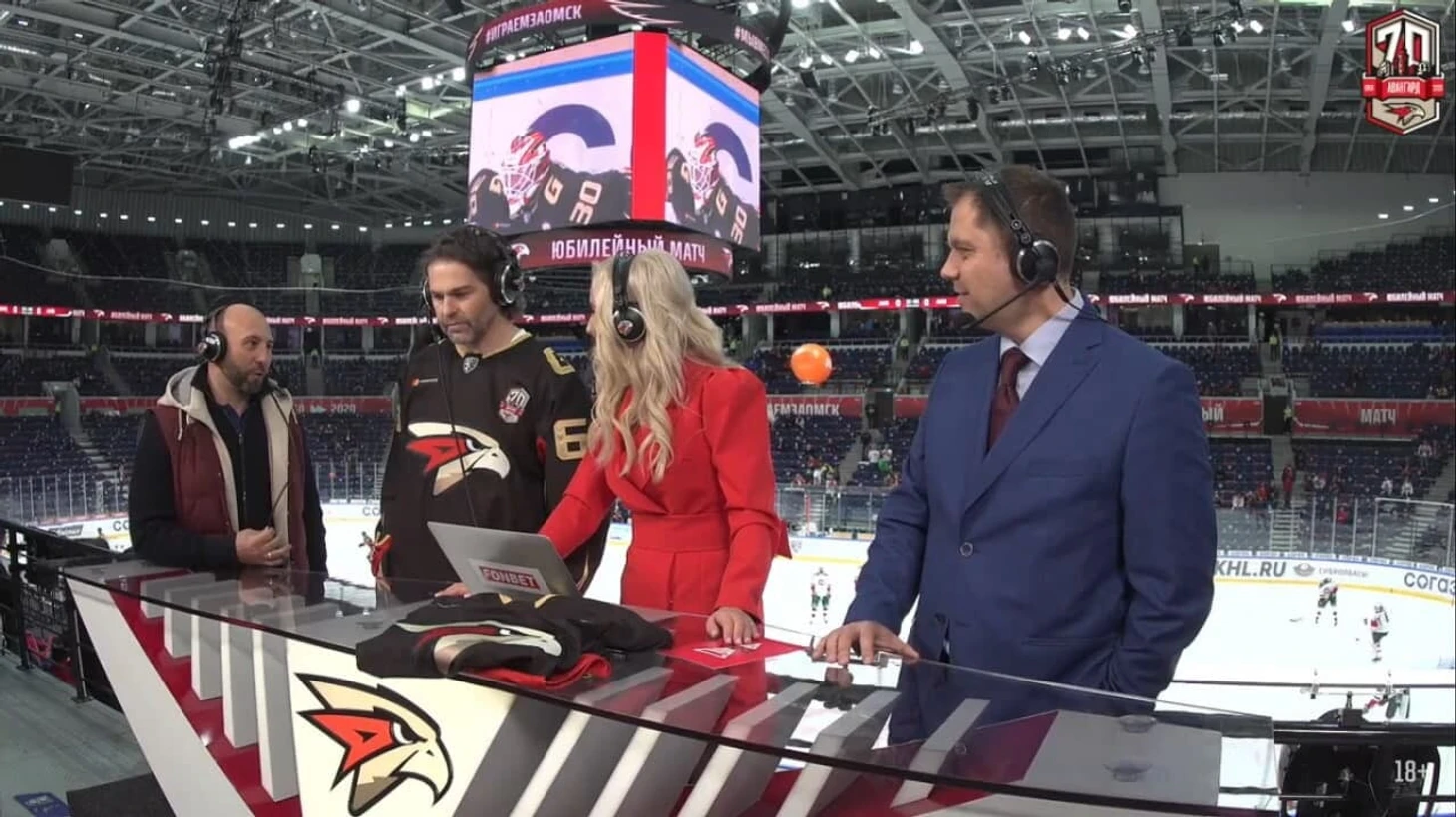 Ведущая попросила легенд «Авангарда» вспомнить их яркие матчи с «Ак Барсом». Сушинский назвал локаутный сезон, когда Андрей Назаров подрался с Дарюсом Каспарайтисом. А Ягр не стал вспоминать – он кое-что придумал: