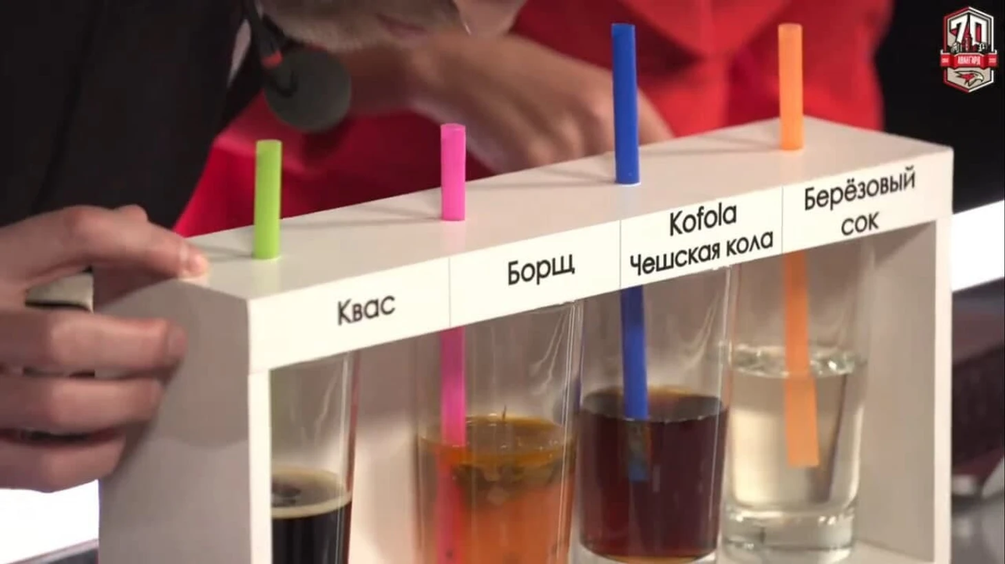 После этого Сушинского, Ягра и Лысенкова вовлекли в игру с напитками: у каждого было четыре разных стакана с разным содержимым – и участники должны были угадать по вкусу, что они попробовали. У чеха был квас, борщ, чешская кола и березовый сок, у экс-президента «Авангарда» – щи, энергетик, безалкогольное пиво, минеральная вода, а журналисту достались пельменный бульон, рассол, тархун и чайный гриб.